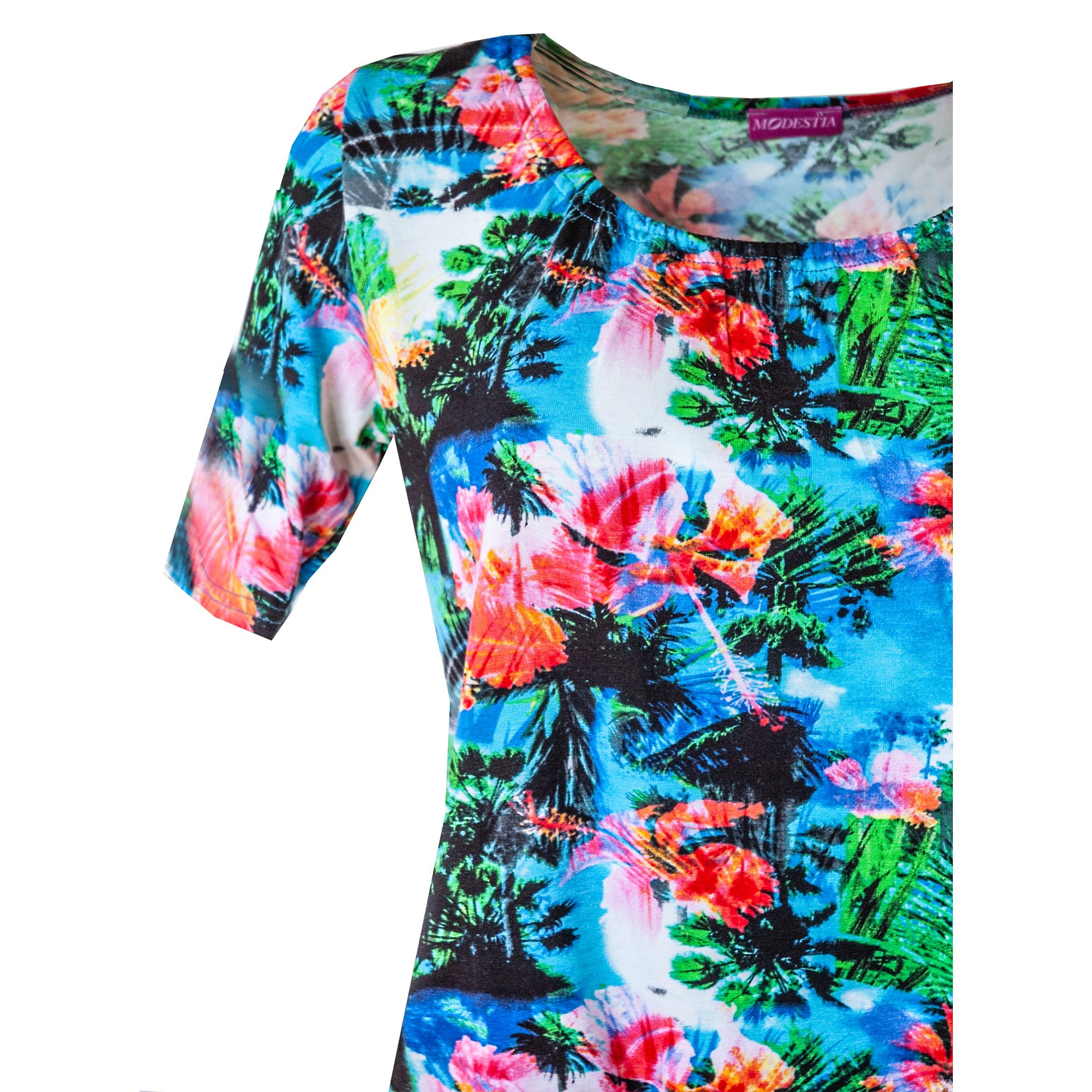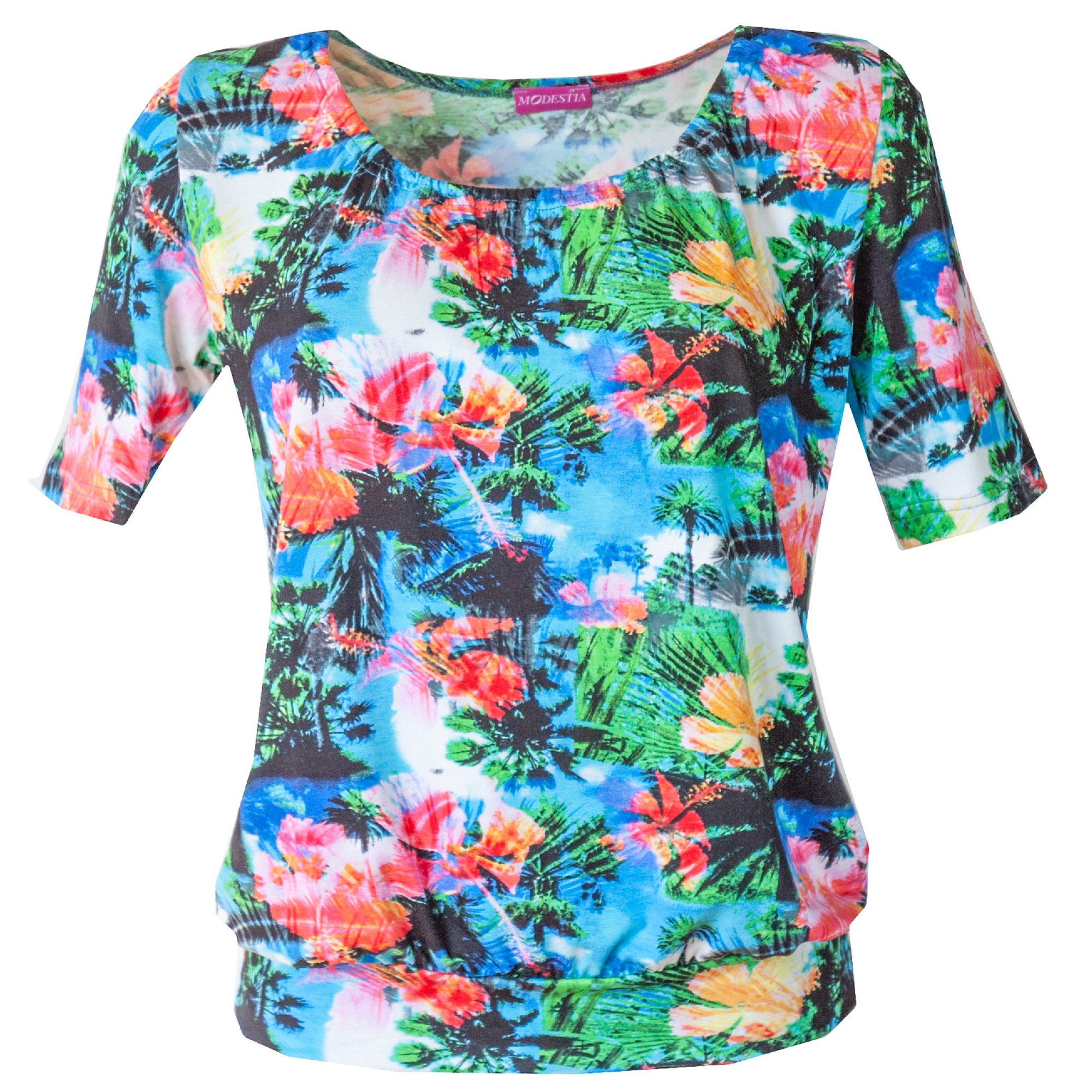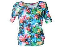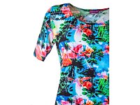 Barevná volná halenka s krátkým rukávem. Nabraná ve výstřihu do gumičky, délka ukončená dvojitým lemem. Materiál: 95%viskóza 5 % elastan