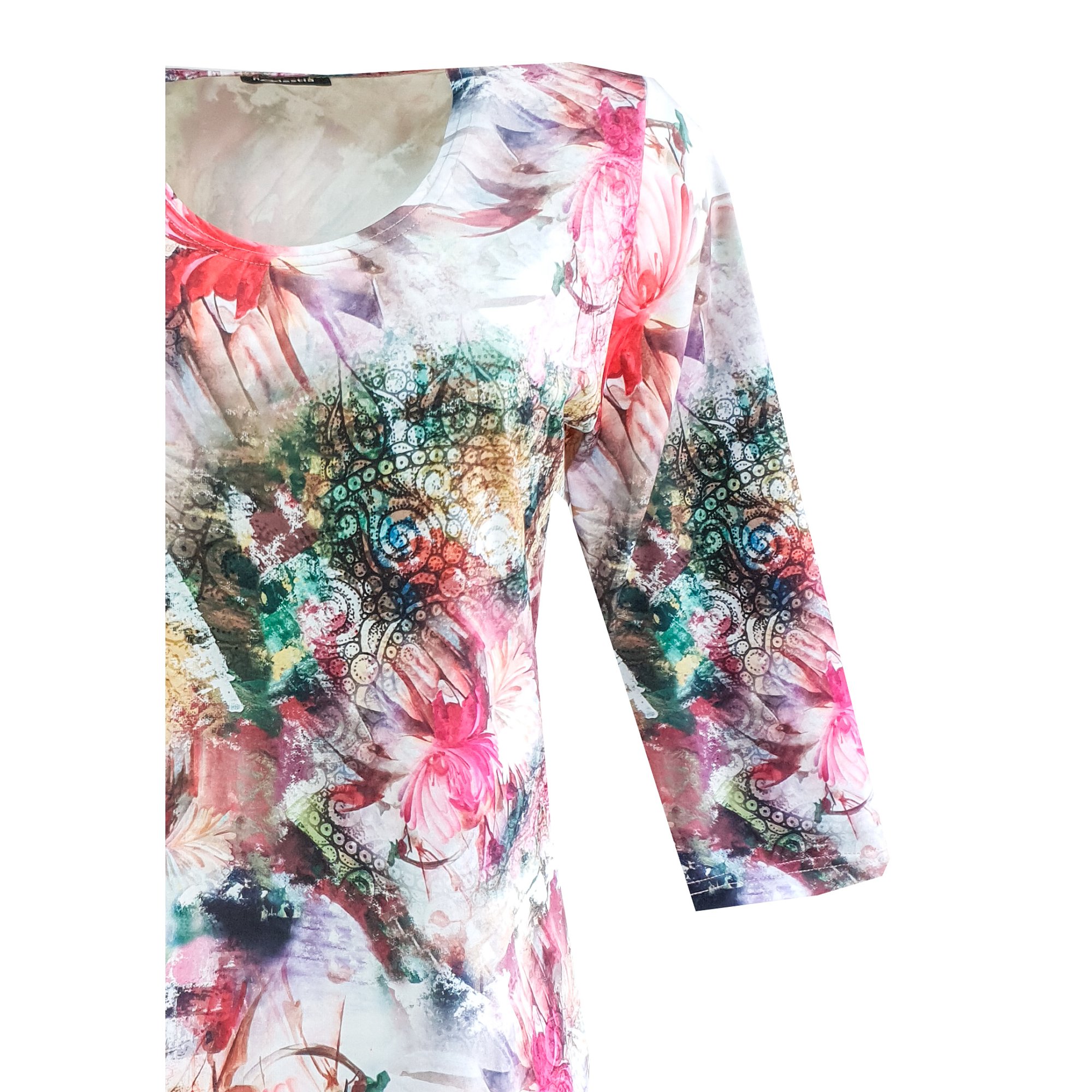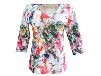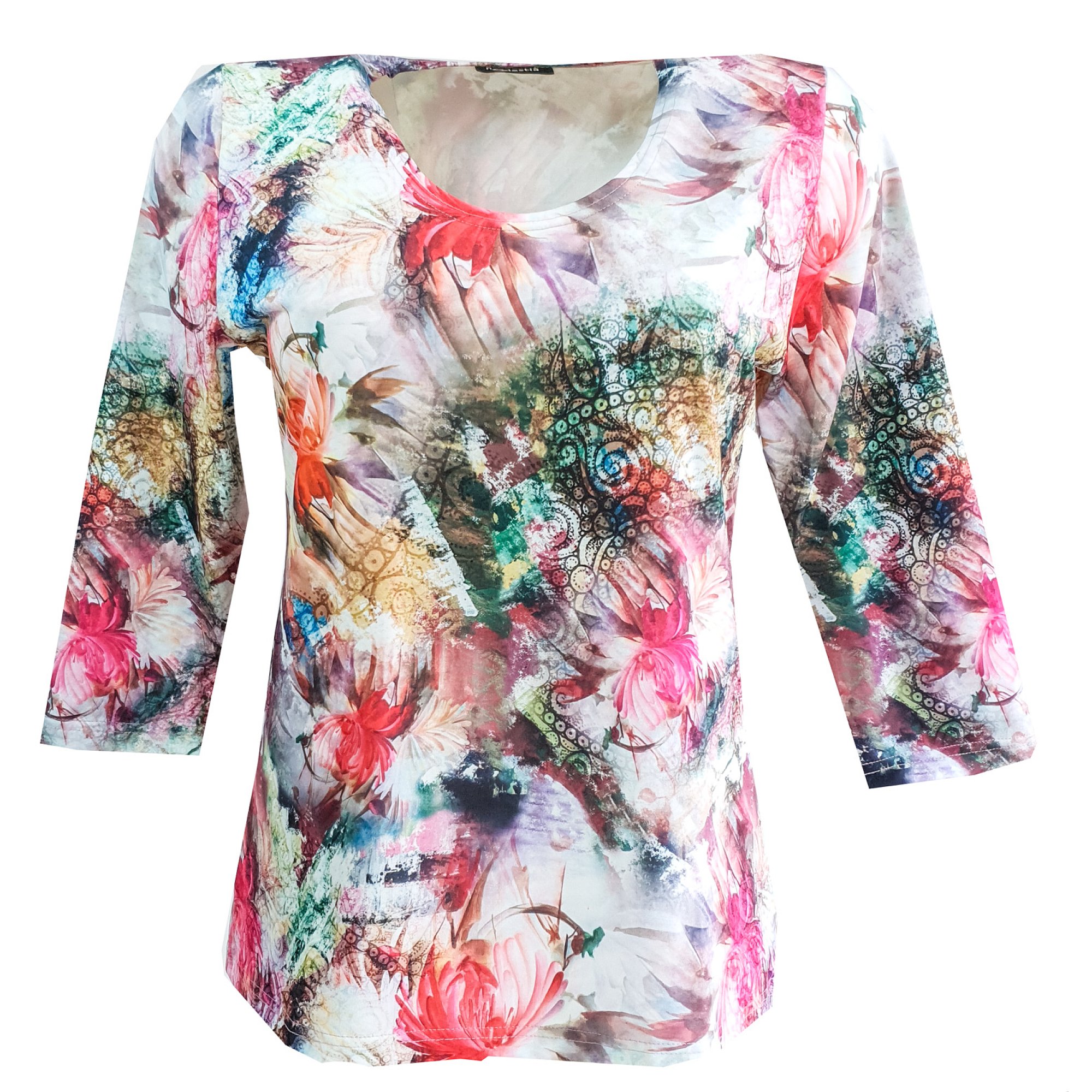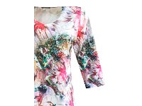 Klasický střih halenky s 3/4 rukávem s barevným tiskem. Délka u vel. 40 je 56 cm, stupňování v délce po 2 cm. Pereme v pračce na 30°. Materiál: 75% polyester, 21% viskóza, 4% elastan