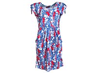 Letní barevné šaty přestřižené pod prsy s velkými nabíranými kapsami. Na ramenou je tunýlek se šňůrkou na stažení rukávku. Délka u vel. 38 je 95 cm, stupňování v délce po 1,5 cm. Pereme v pračce na 30°. Materiál 96% polyester, 4% elastan.