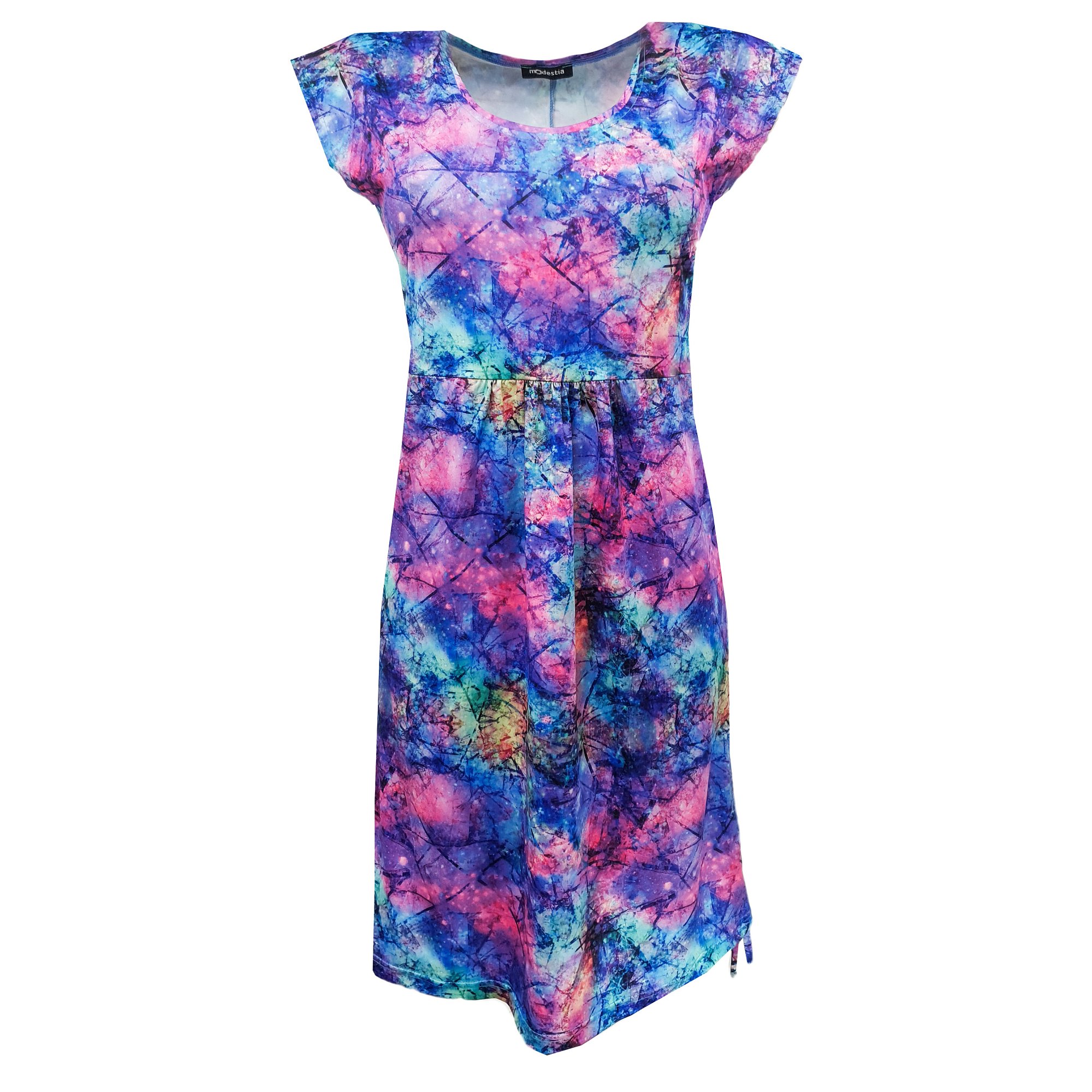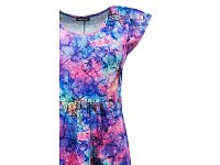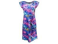 Letní volné šaty s přinechaným rukávkem s barevným tiskem. Přestřižené pod prsy a nabrané do sedla. Na bocích vtažené šňůrky na stáhnutí - zkrácení délky. Délka šatů 97 - 100 cm. Pereme v pračce na 30°. 95% polyester 5% elastan