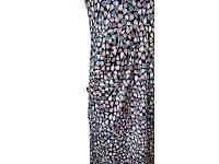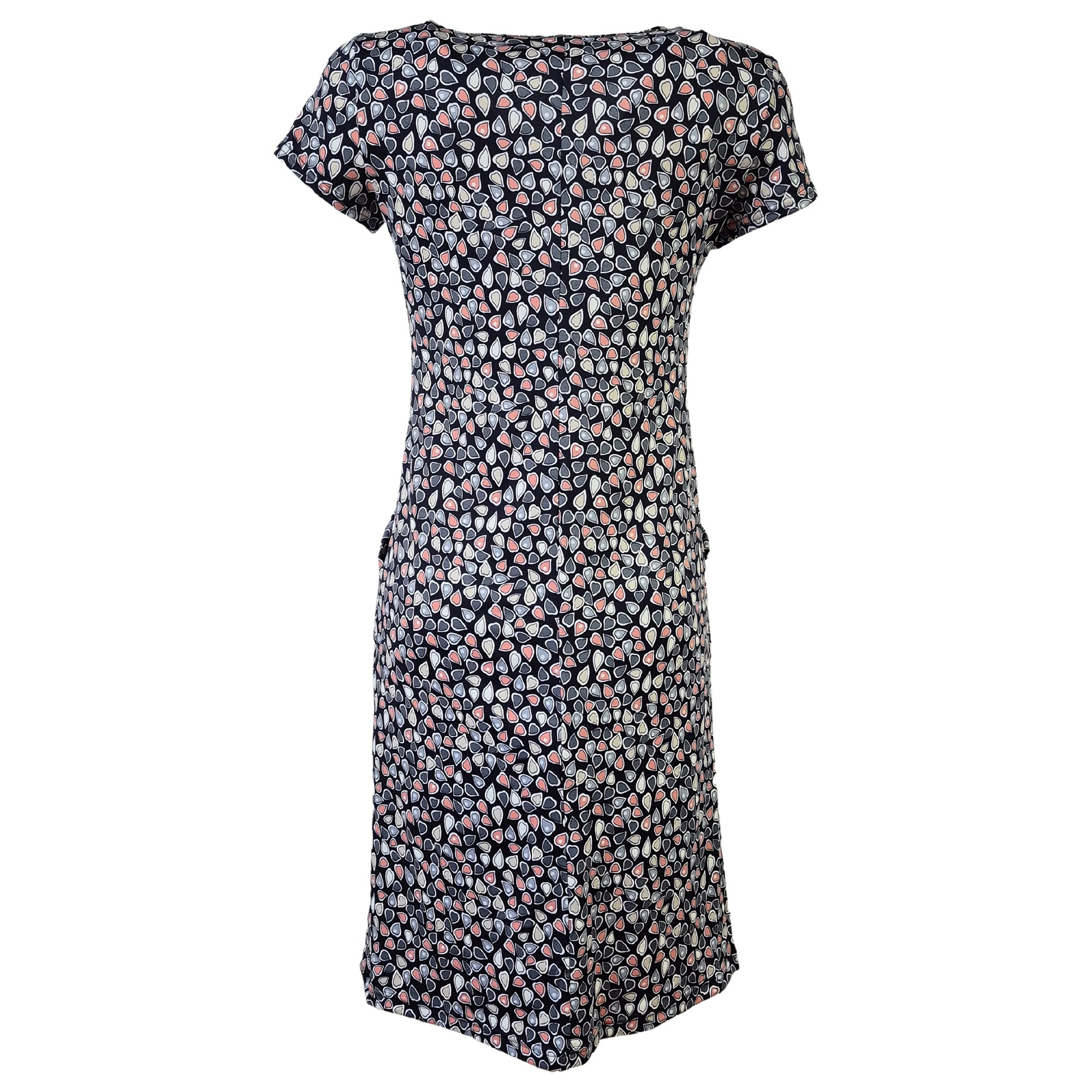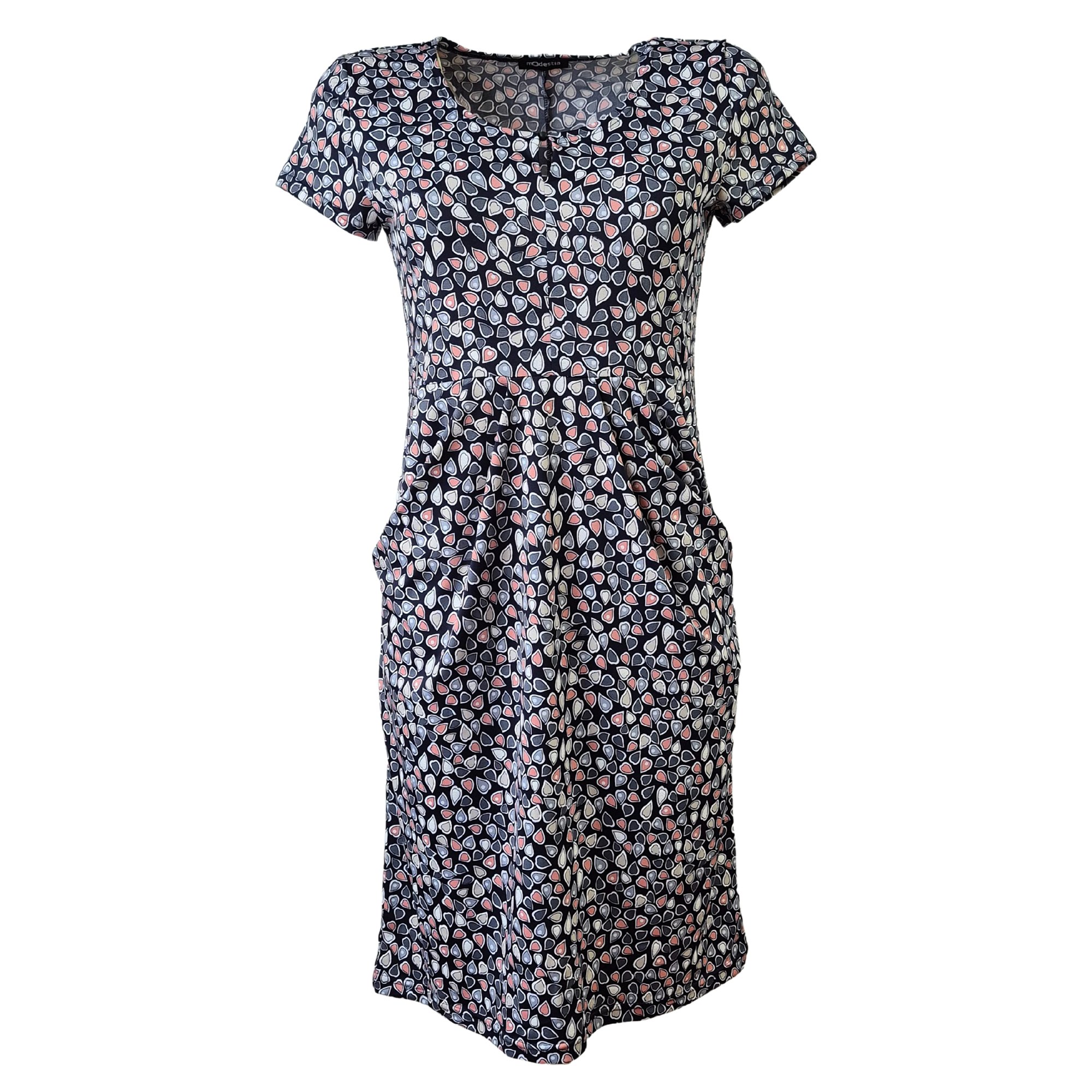 Šaty s krátkým rukávem, s prostřihem ve výstřihu ozdobené malým korálkem.Přestřižené pod prsy s velkými nabíranými kapsami. Délka 100 cm. Pereme v pračce na 30°. 95% polyester 5% elastan
