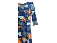 Barevné elegantní šaty s překříženým, nabraným vrchním dílem a širokou sukní Šaty jsou přestřižené v pase s 3/4 rukávem. Délka 110 cm. Pereme v pračce na 30°. Materiál: 74% polyester 21% viskóza 5% elastan