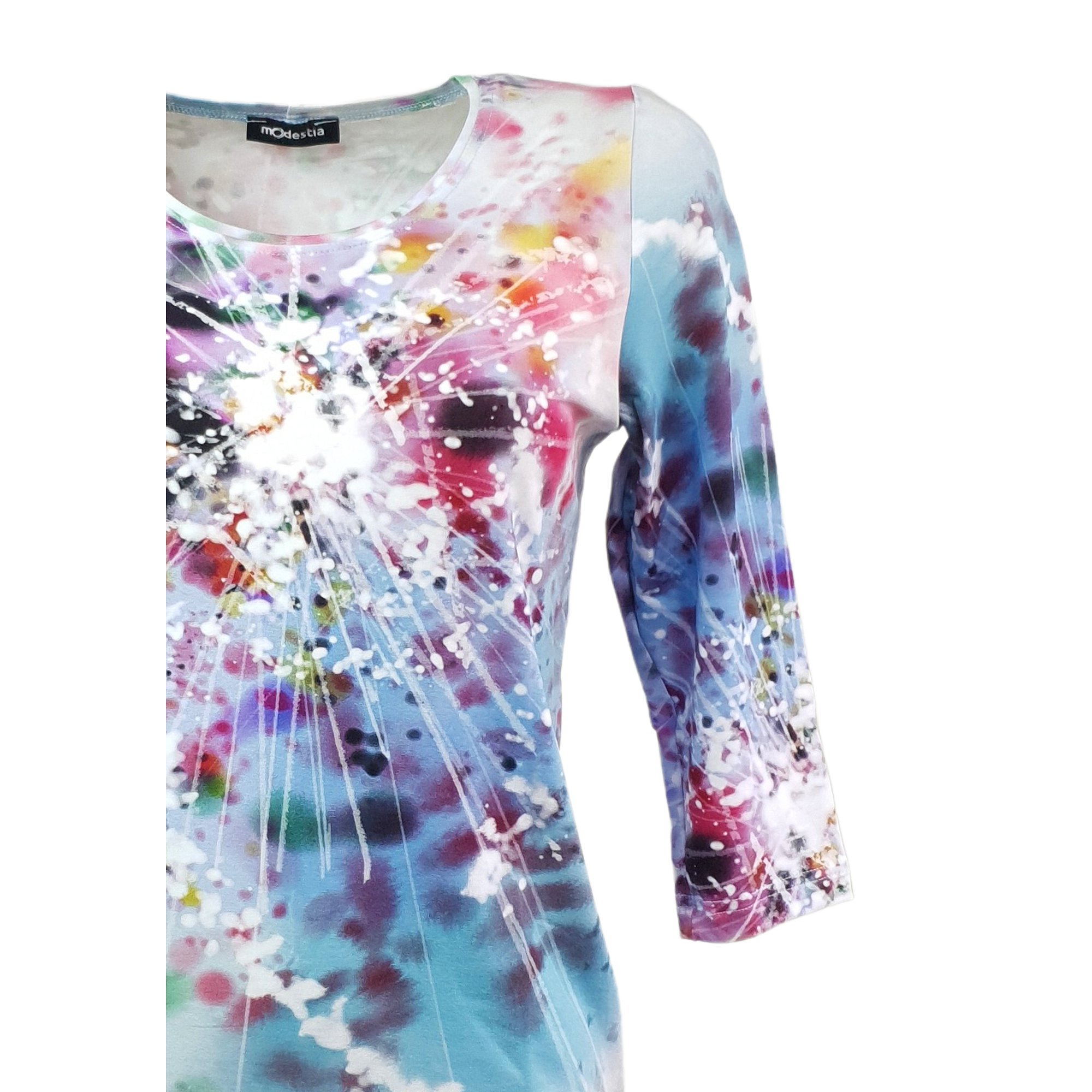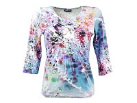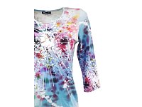 Barevné triko s 3/4 rukávy s lemovaným kulatým výstřihem. Délka u vel. 38 je 54 cm, stupňování v délce po 1,5 cm. Pereme v pračce na 30°. 95% viskóza 5% elastan
