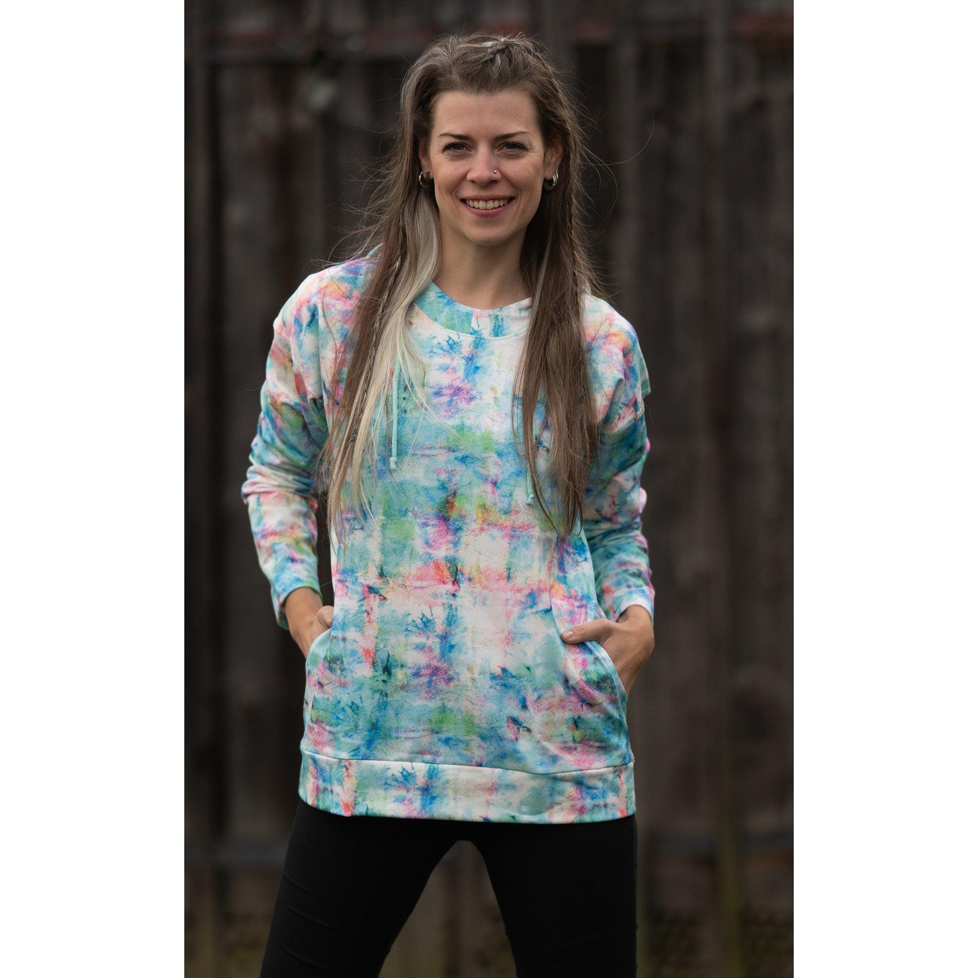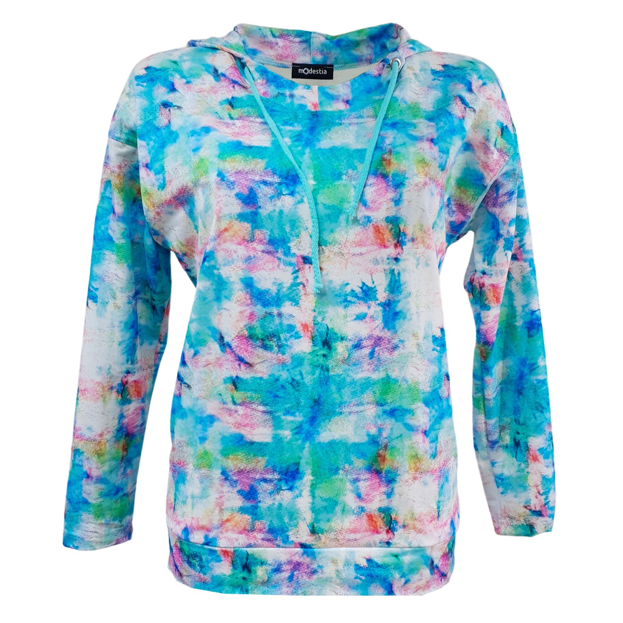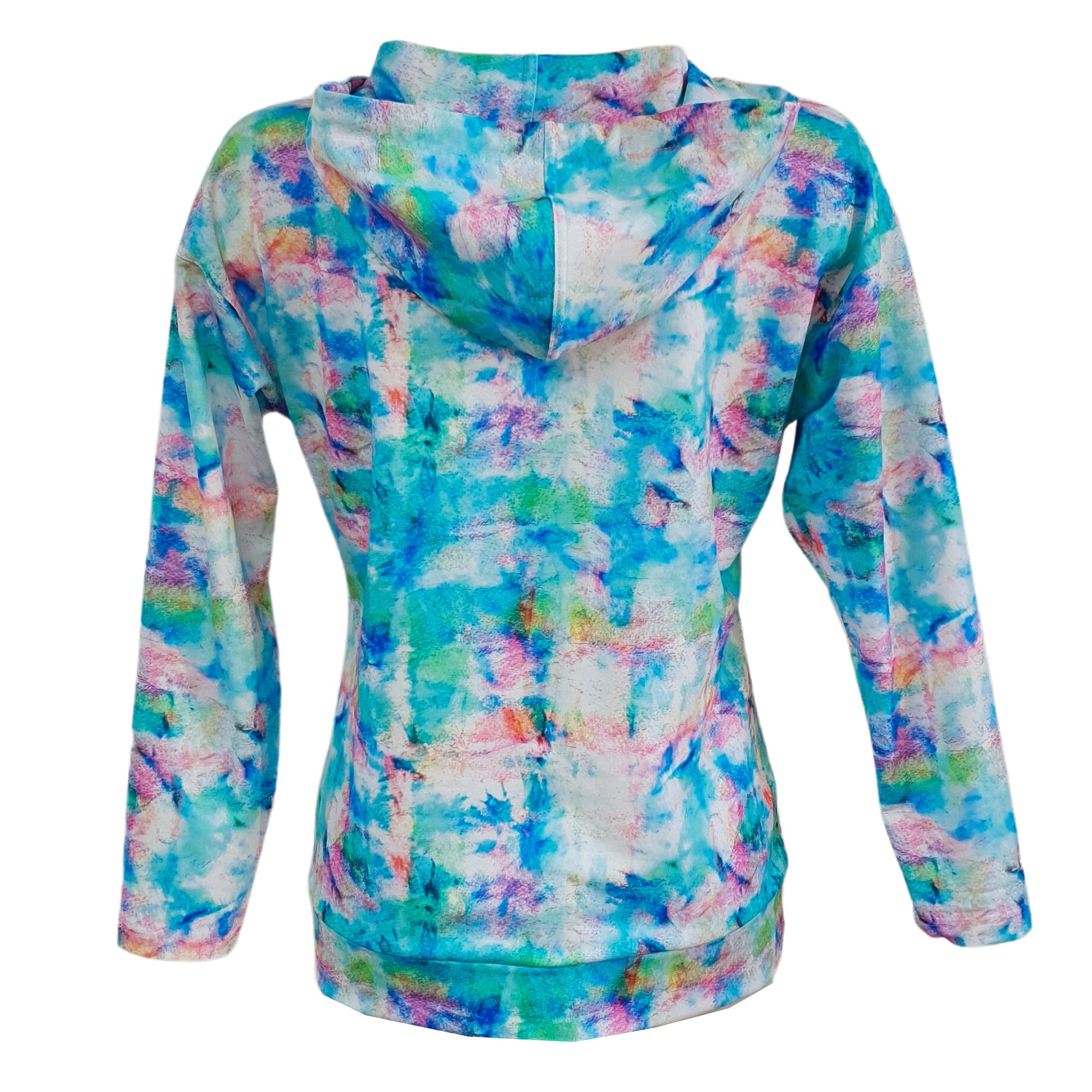 Bílá slabší mikina s barevným tiskem, s dvojitou kapucí a bočními kapsami. Tady je video. Pereme v pračce na 30°. 73%polyester 21% viskóza 6% elastan