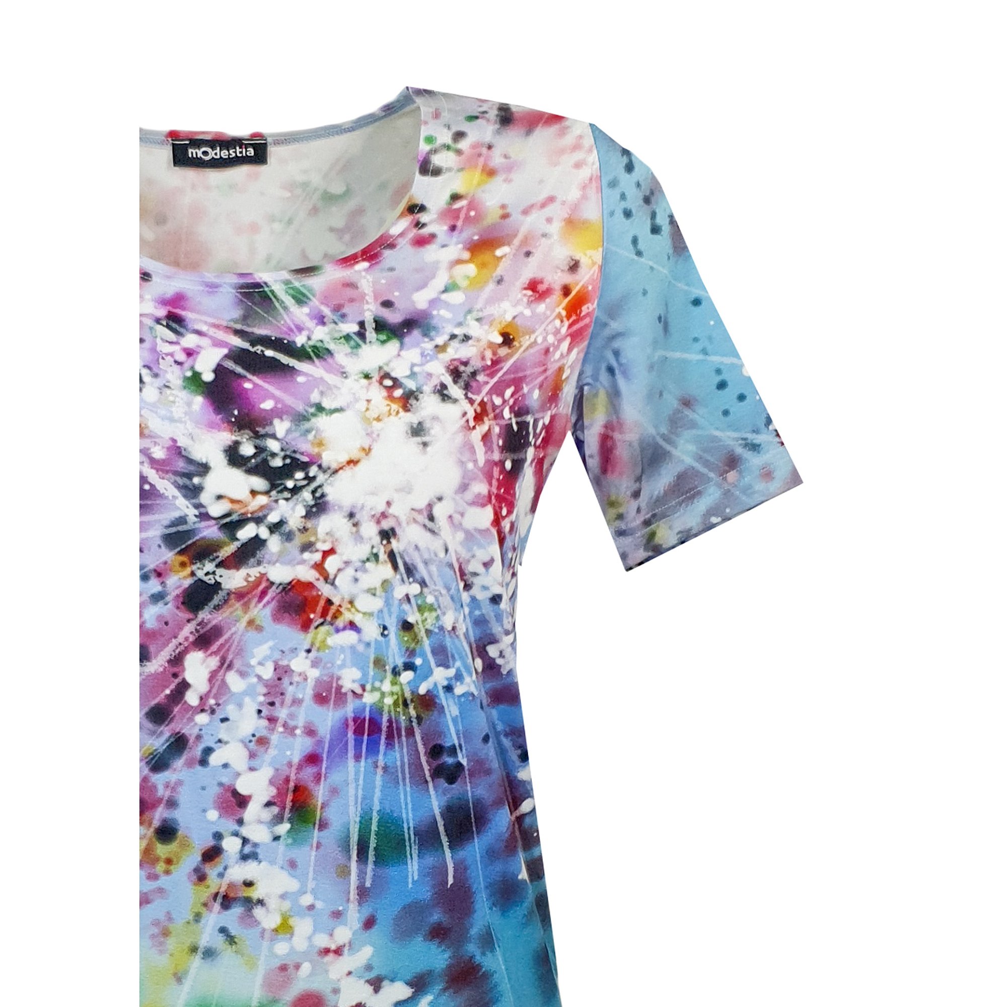Klasické triko s barevným tiskem s krátkým rukávem. Délka u vel. 40 je 56 cm. Stupňování v délce po 2 cm. 95% viskóza 5% elastan