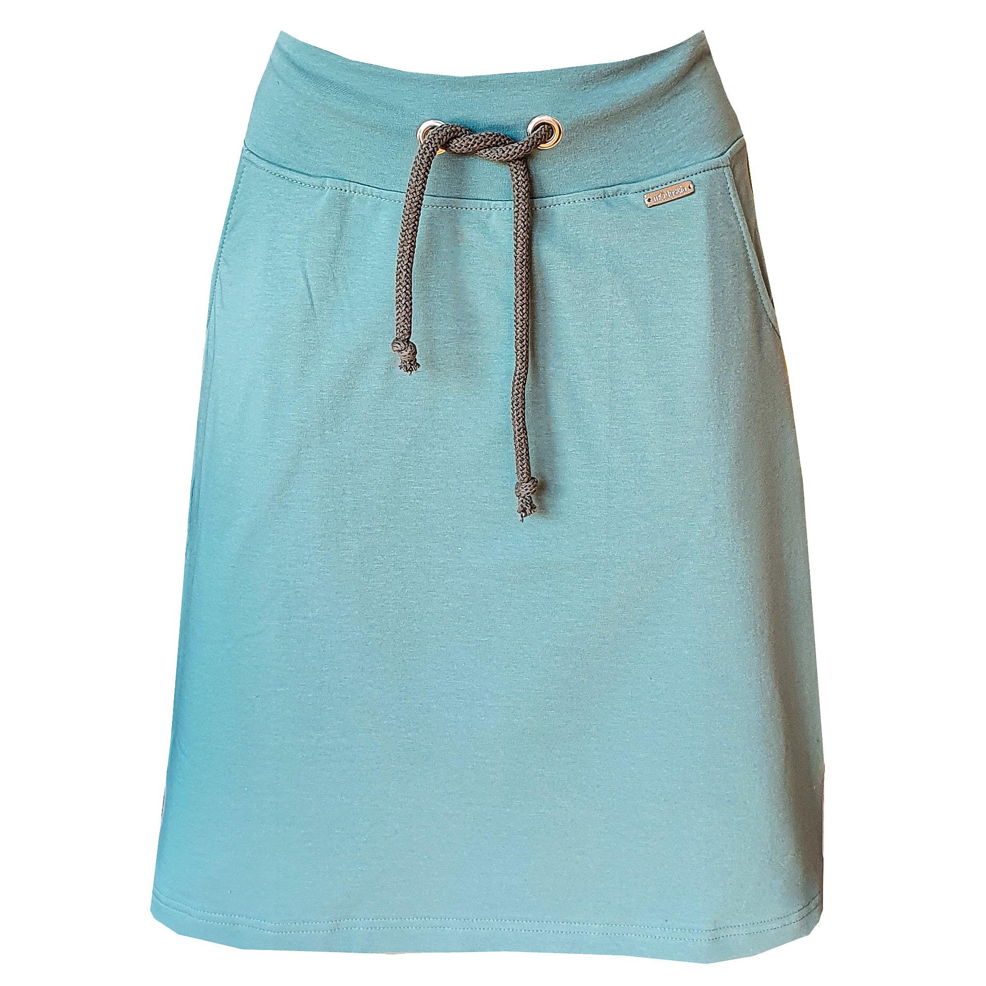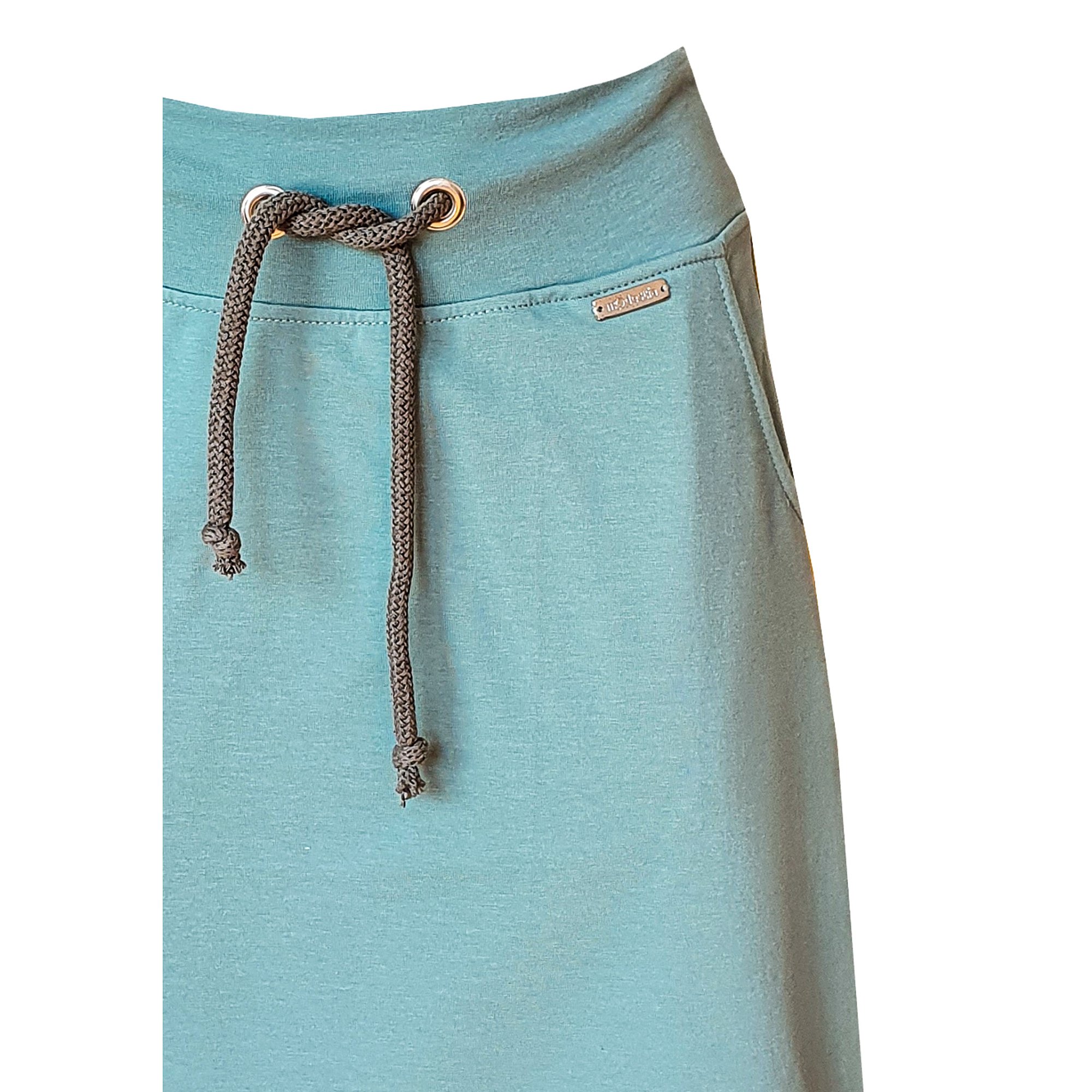 Volnočasová sukně do A s váčkovými kapsami a šňůrou v pase v barvě kaktusu. Celková délka včetně pasu je 52 cm. Pereme v pračce na 30°. Materiál: 97% bavlna 3% elastan