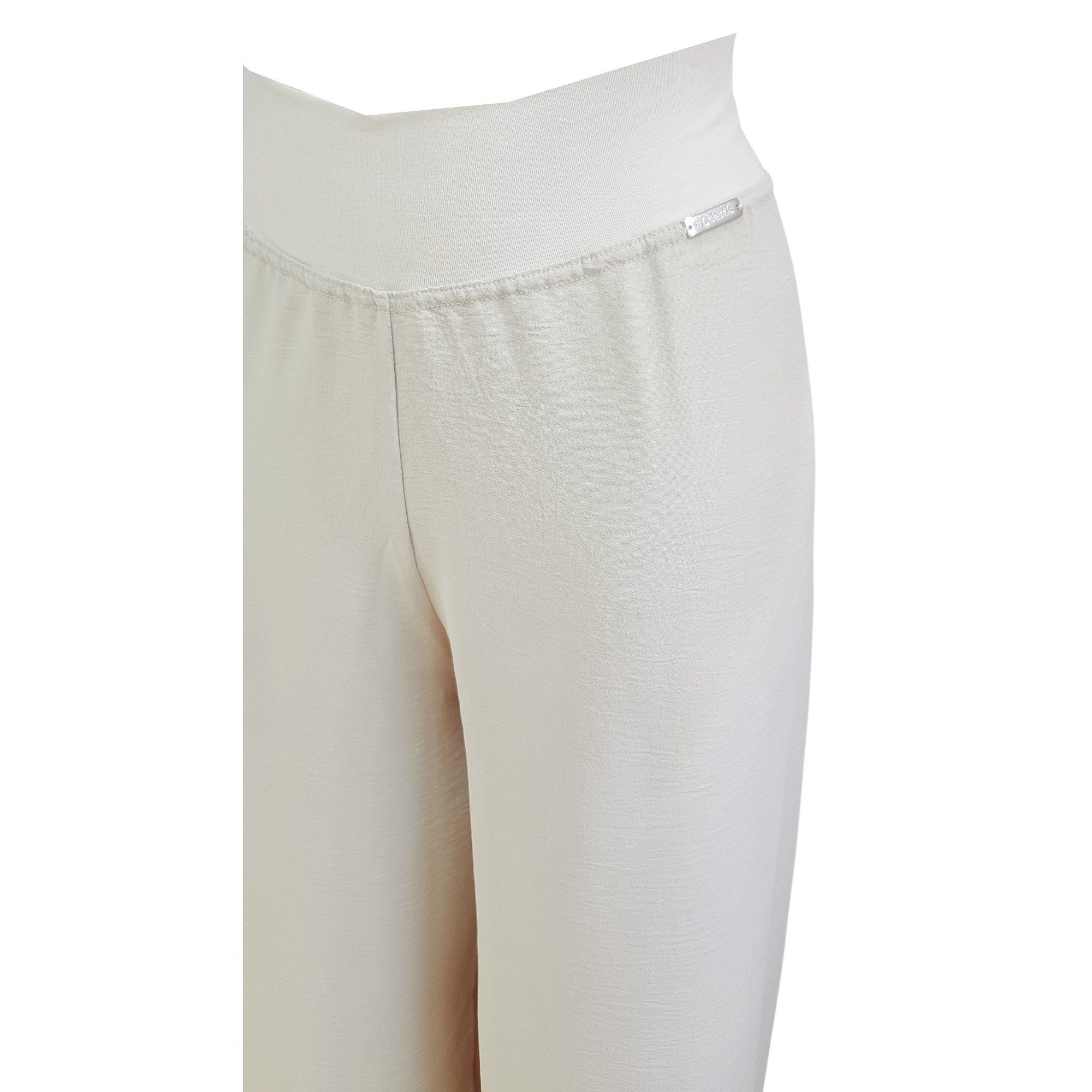 Letní pohodlné dlouhé kalhoty ze slabého materiálu v béžové barvě. V pase do elastické pasovky. Délka včetně pasu je 105cm. Šířka nohavice 31 cm. Pereme na 30°. 95% polyester 5% elastan
