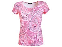 Klasická jemně projmutá halenka s krátkým rukávem v bílé barvě s růžovým kašmírovým tiskem . Mělký kulatý výstřih. Pereme v pračce na 30°. Materiál: 97 % bavlna 3 % elastan