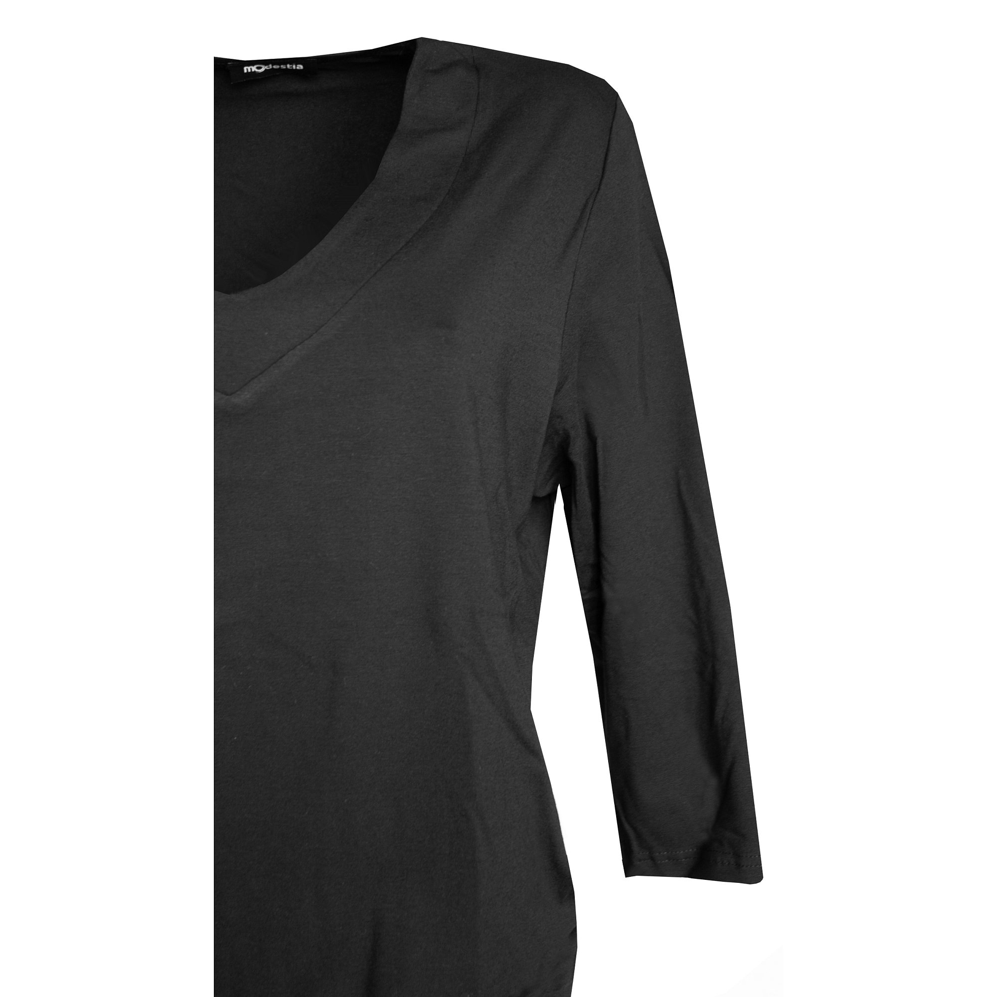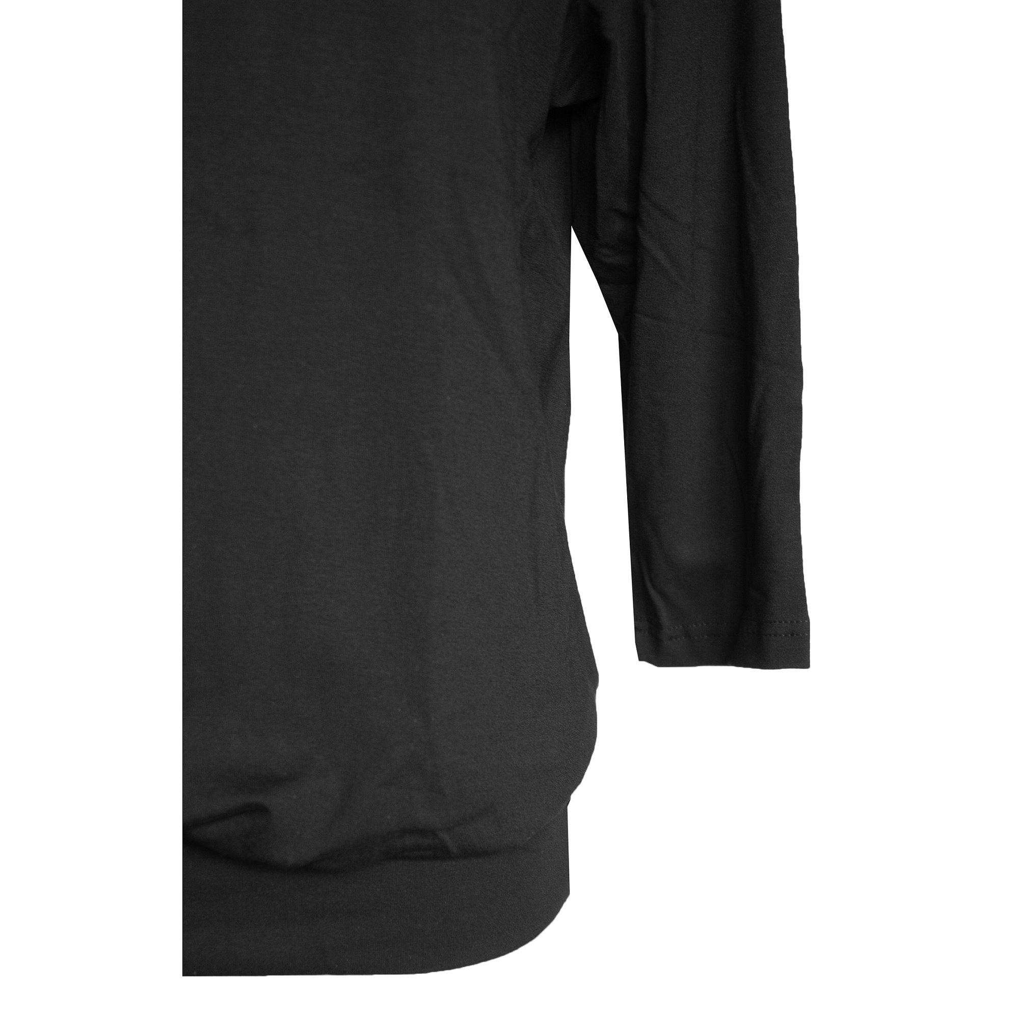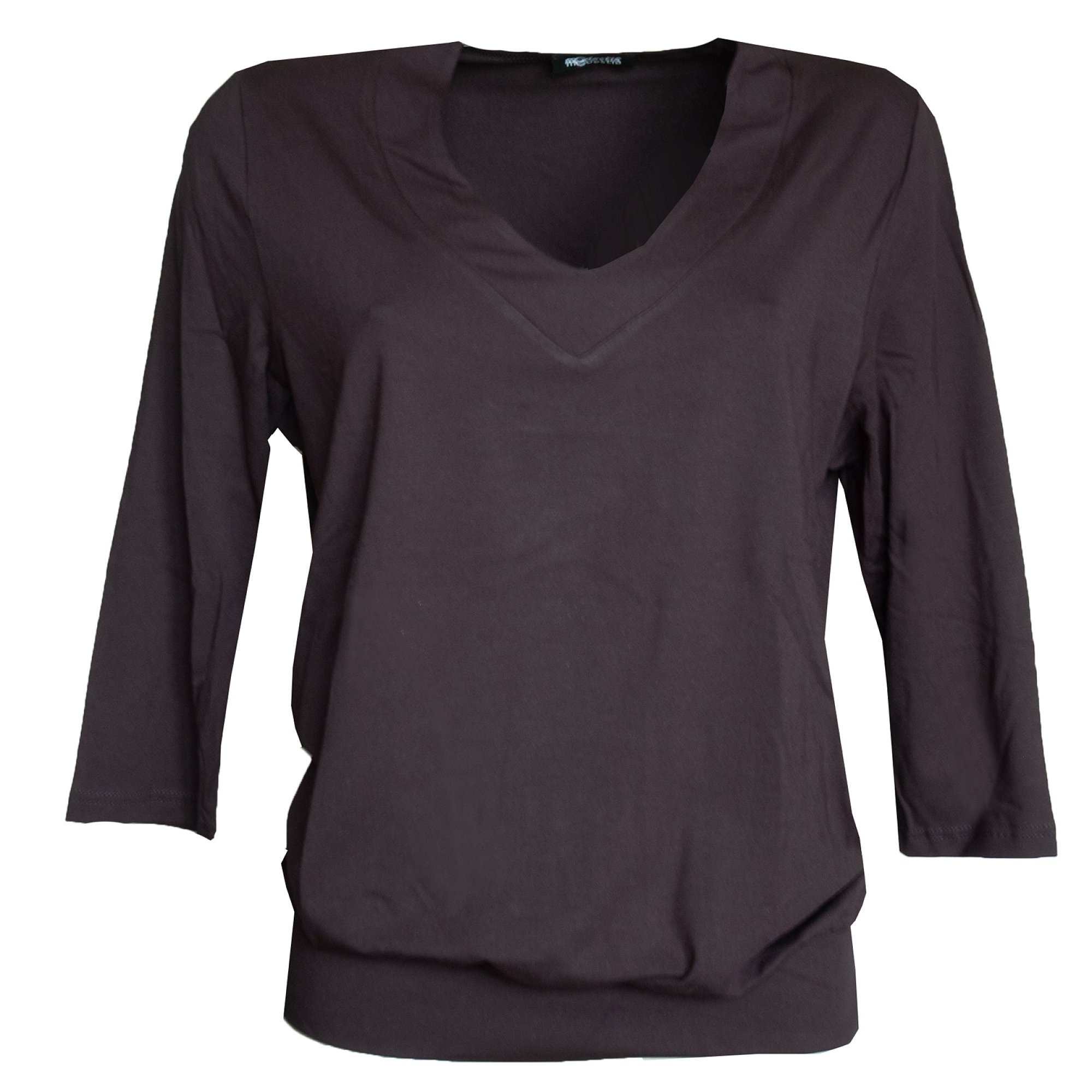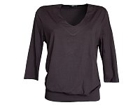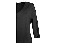 Halenka s krásným véčkovým výstřihem volného střihu, na bocích nabraná do širokého lemu. 3/4 rukáv. Barva černá. Pereme v pračce na 30°. Materiál: 95% viskóza 5% elastan