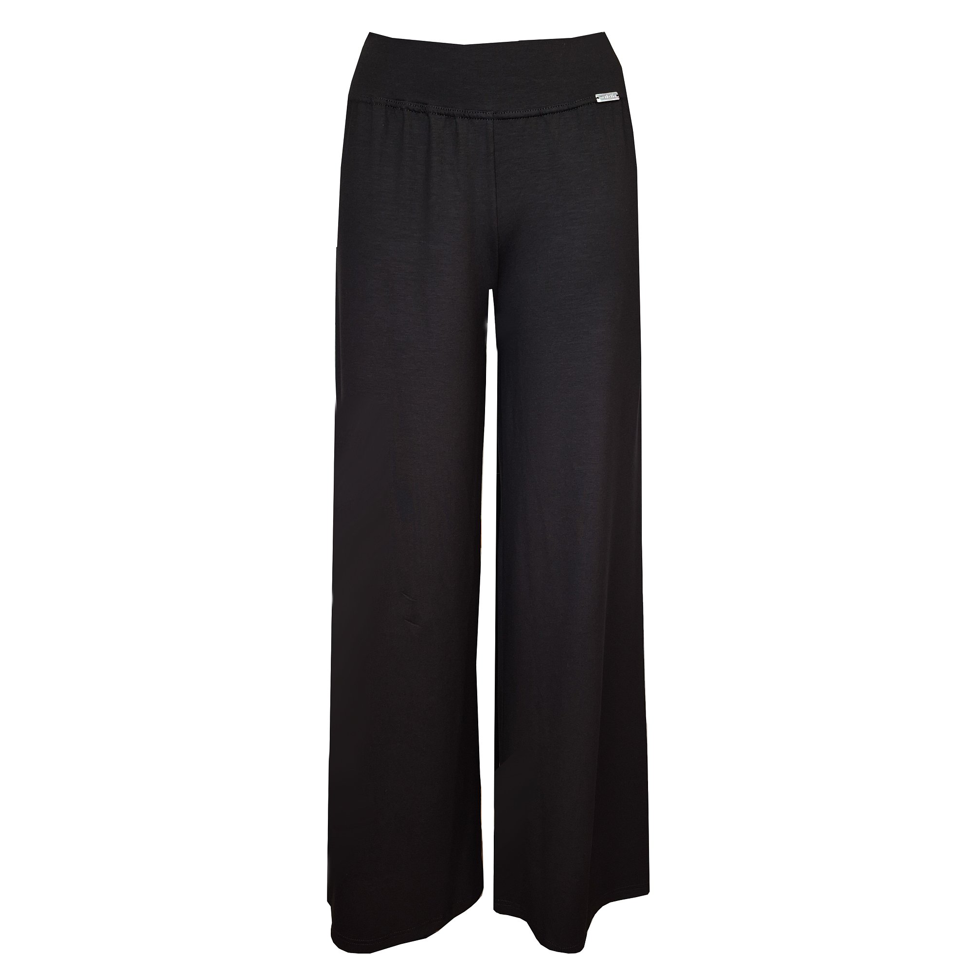 Dámské kalhoty značky Modestia v černé barvě. Široké nohavice volného střihu, elastický pas s kovovým logem značky. Materiál: 95% viskóza, 5% elastan.