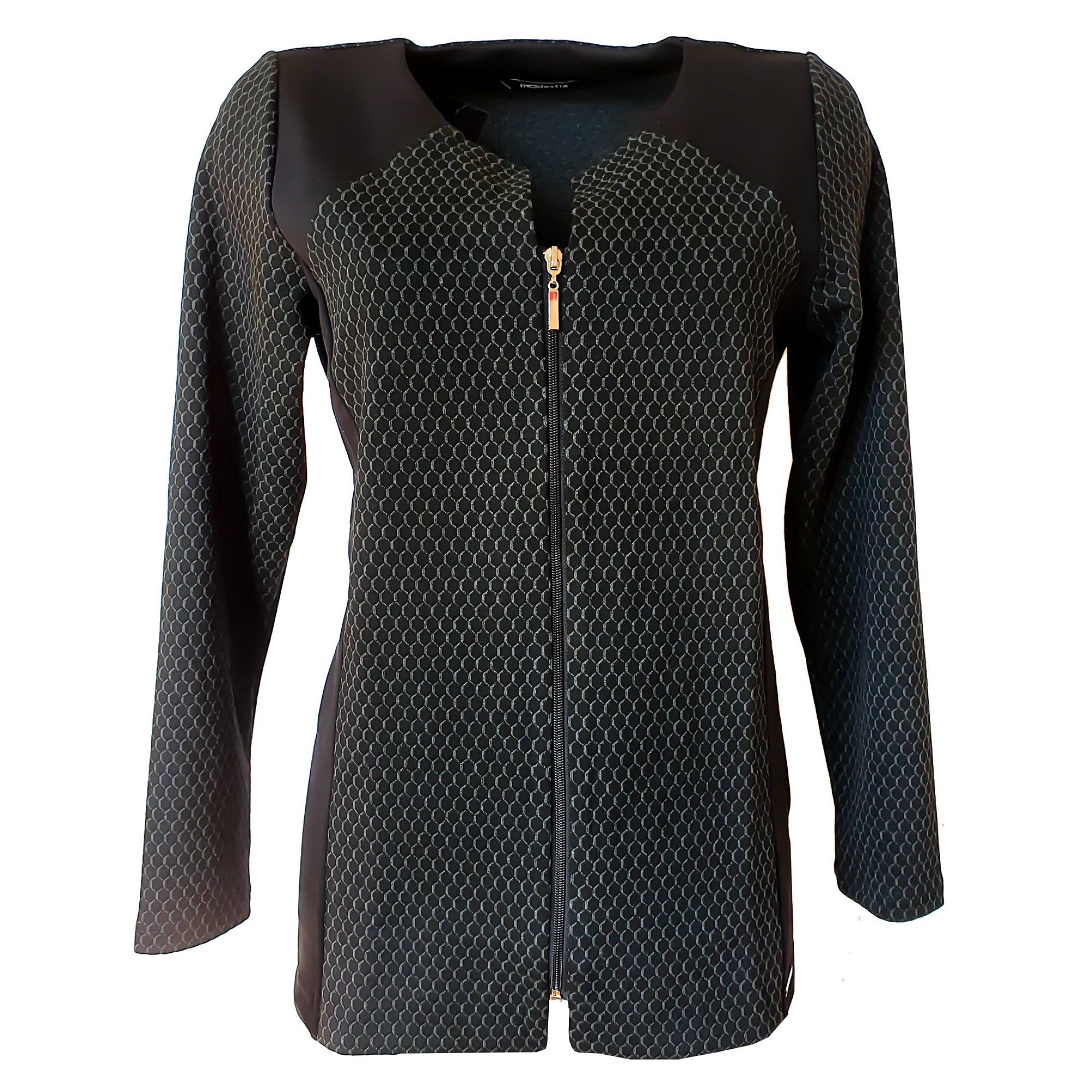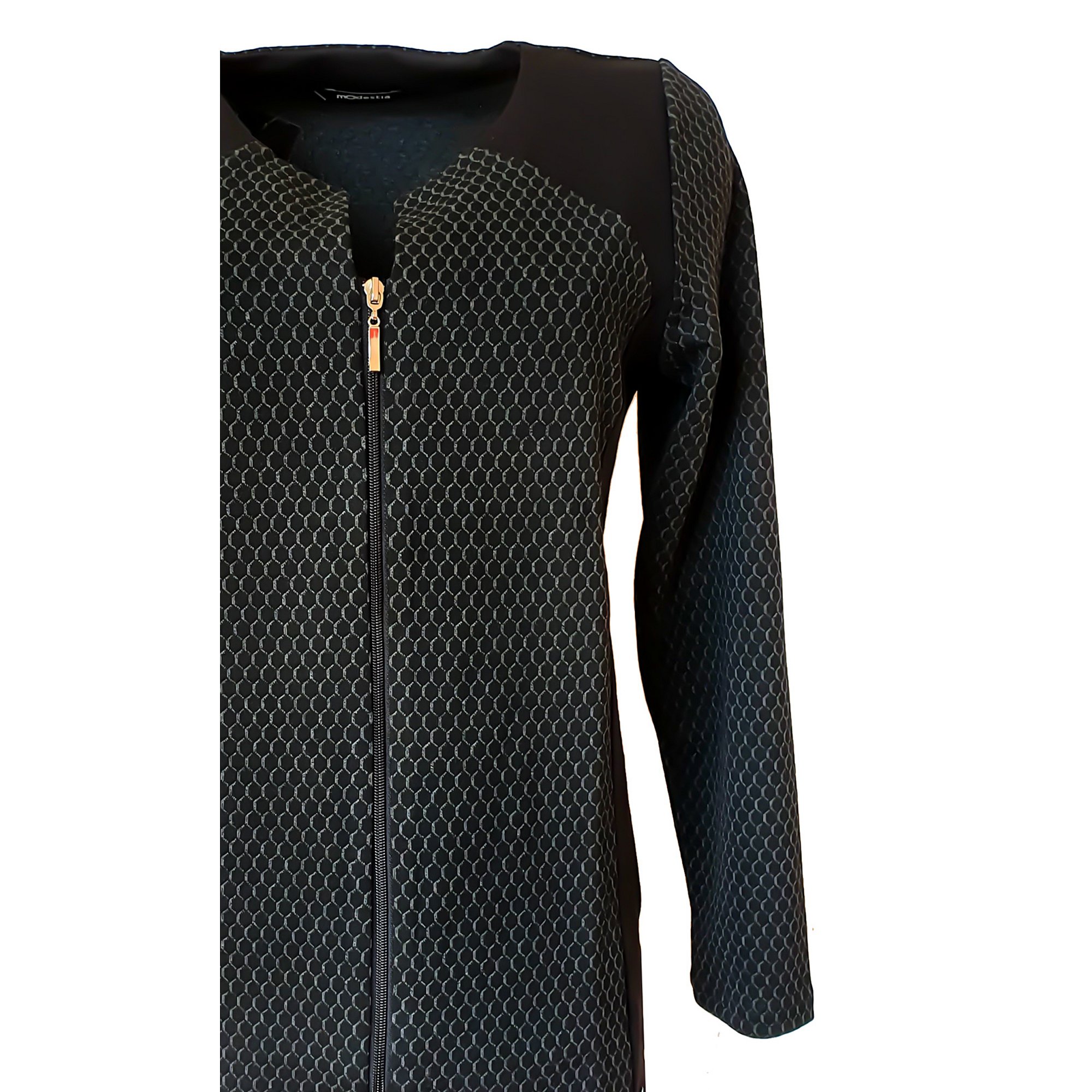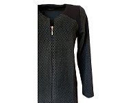 Elegantní sáčko bez podšívky, zapínání na zip, dlouhý rukáv. Kombinace dvou materiálů. Barva černá. Pereme v pračce na 30°. Materiál: 74% polyester 21 % viskóza 5 % elastan