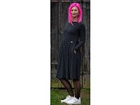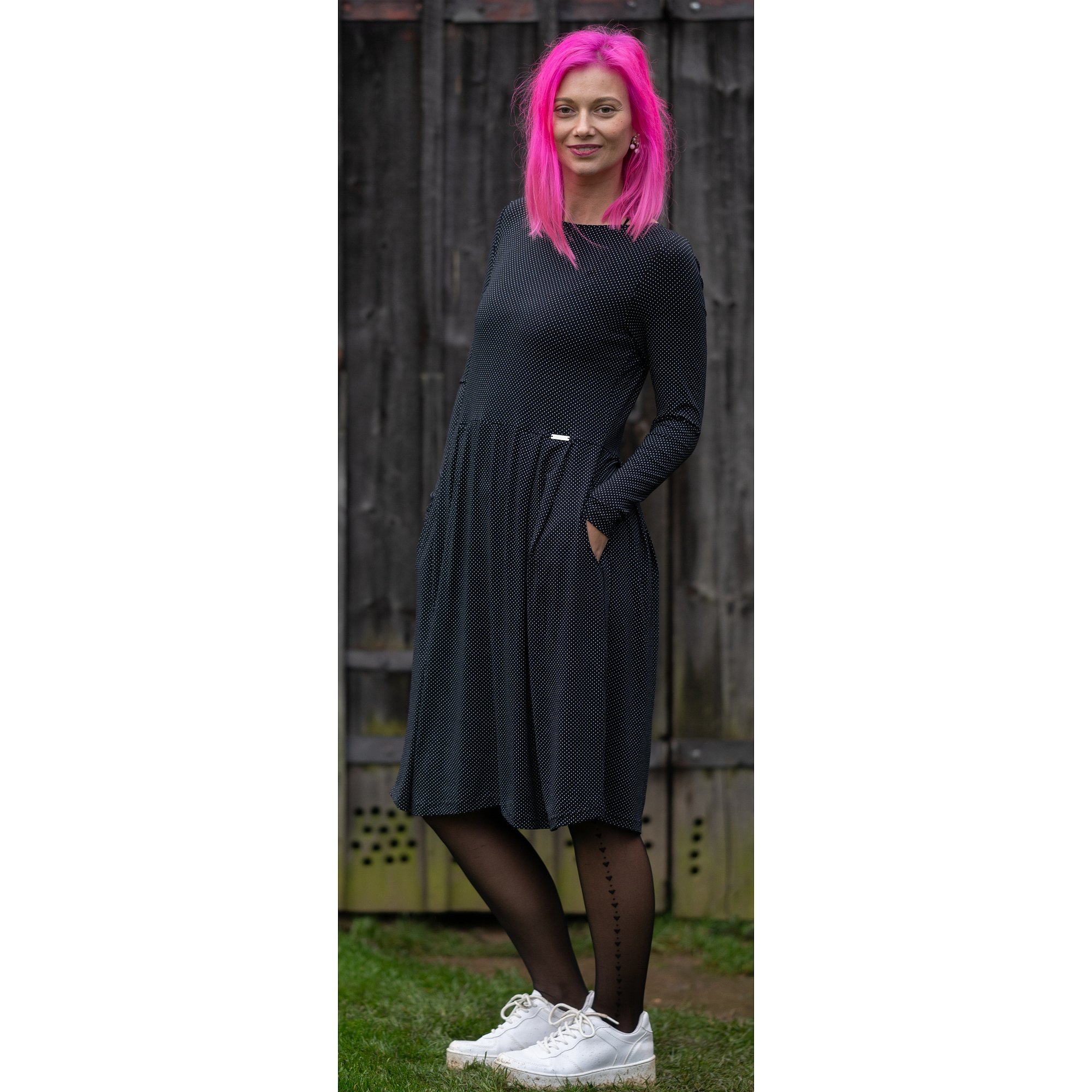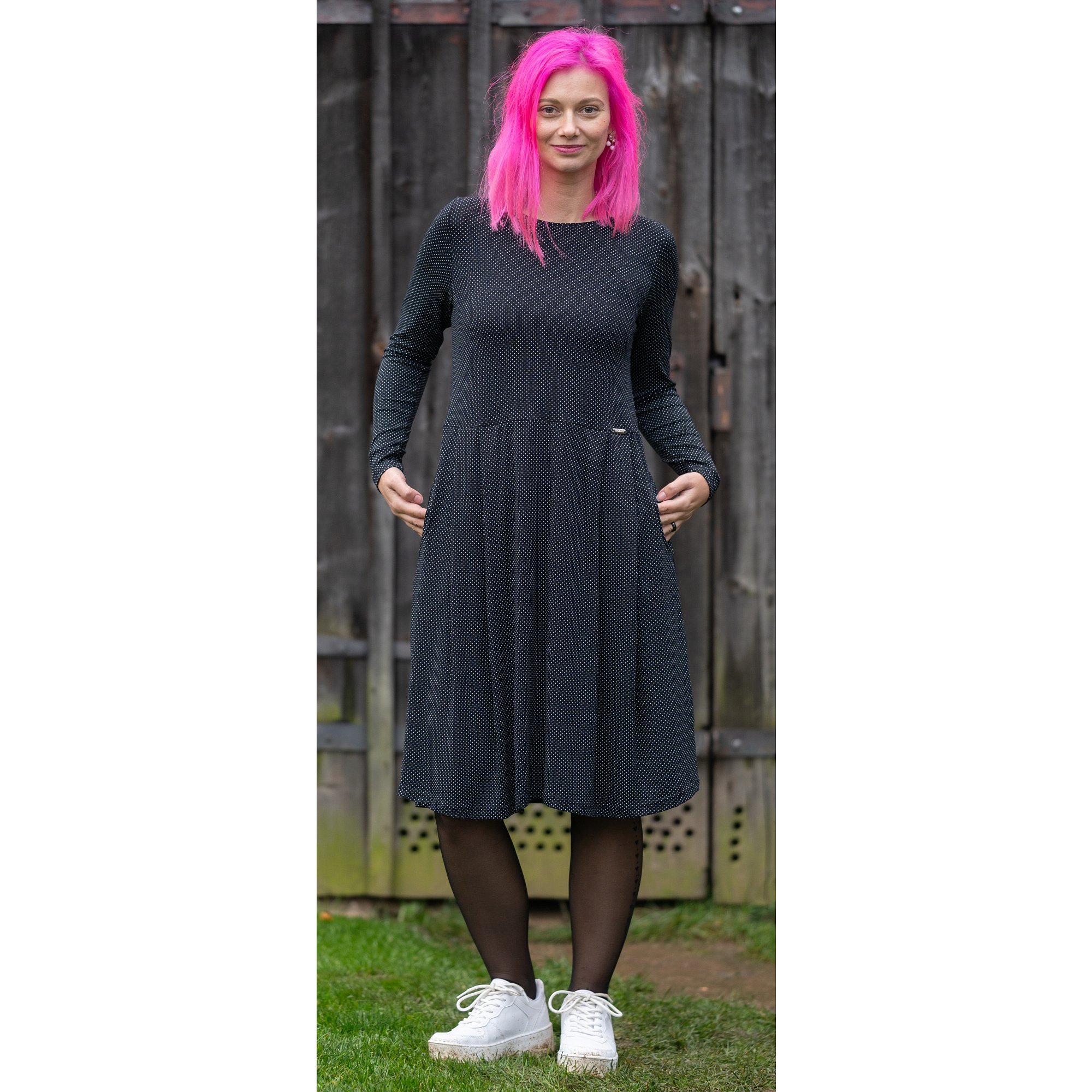 Černo bílé puntíkaté šaty s dlouhým rukávem přestřižené pod prsy s nařasenou sukní od značky Modestia. Střih krásně zakryje nedostatky postavy a přitom vyzdvihne ženské tvary. Šaty jsou vyrobeny z příjemného a elastického materiálu, který se skvěle nosí.Jemně černobílý puntíkatý vzor dodává šatům na ženskosti a originalitě. Délka je 100 cm. Údržba: pereme v pračce na 30°. Materiál: 95% viskóza 5% elastan. Tady je video.