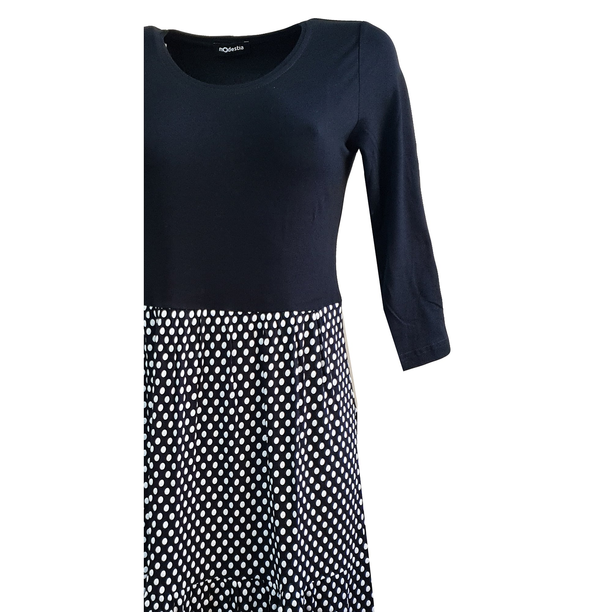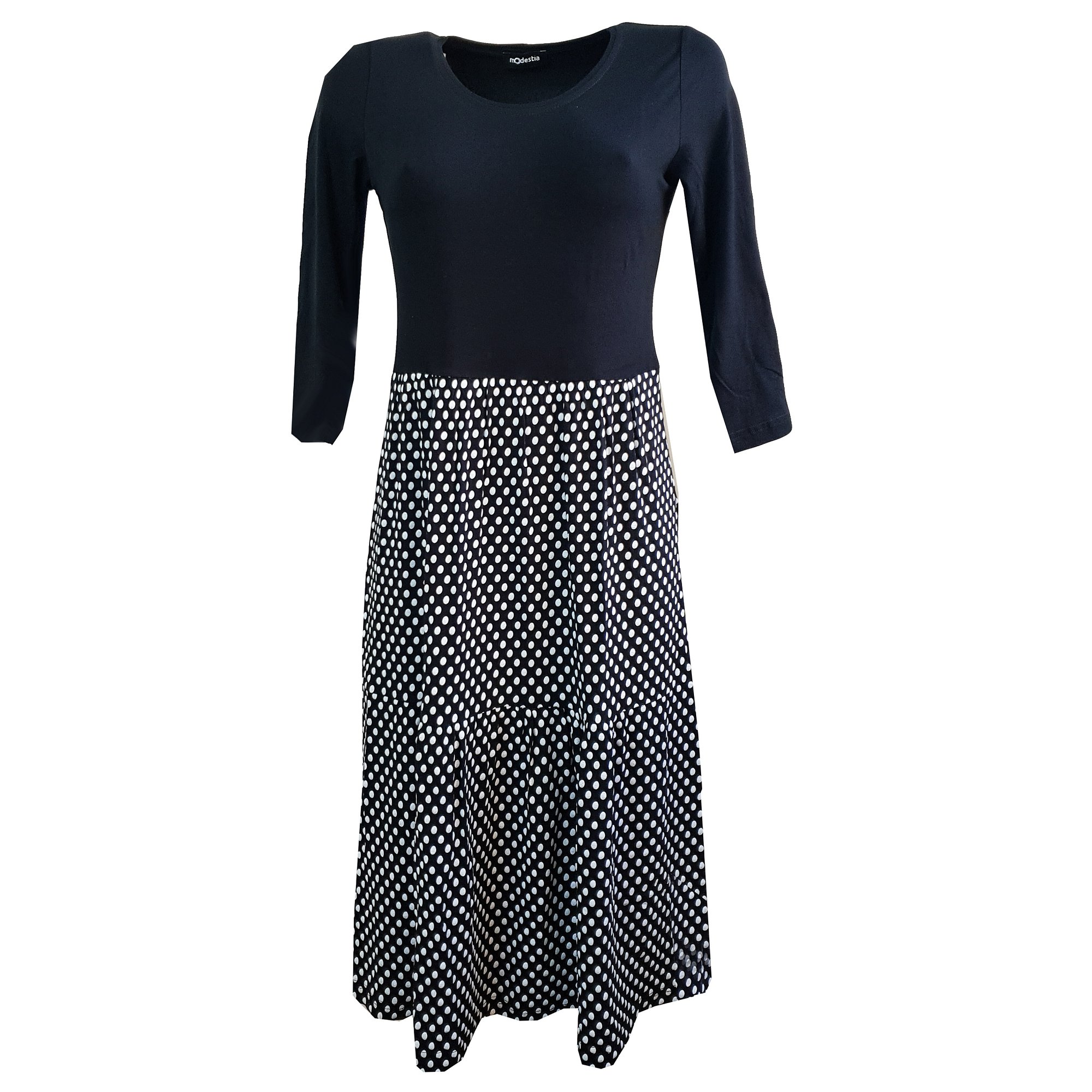 Slušivé šaty s 3/4 rukávem přestřižené pod prsy se dvěma kanýry, které i ve větších velikostech krásně zakryjí nedostatky postavy a přitom vyzdvihnou ženské tvary. Barva černá s bílými puntíky. Délka
