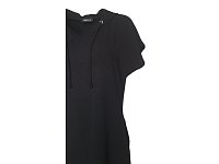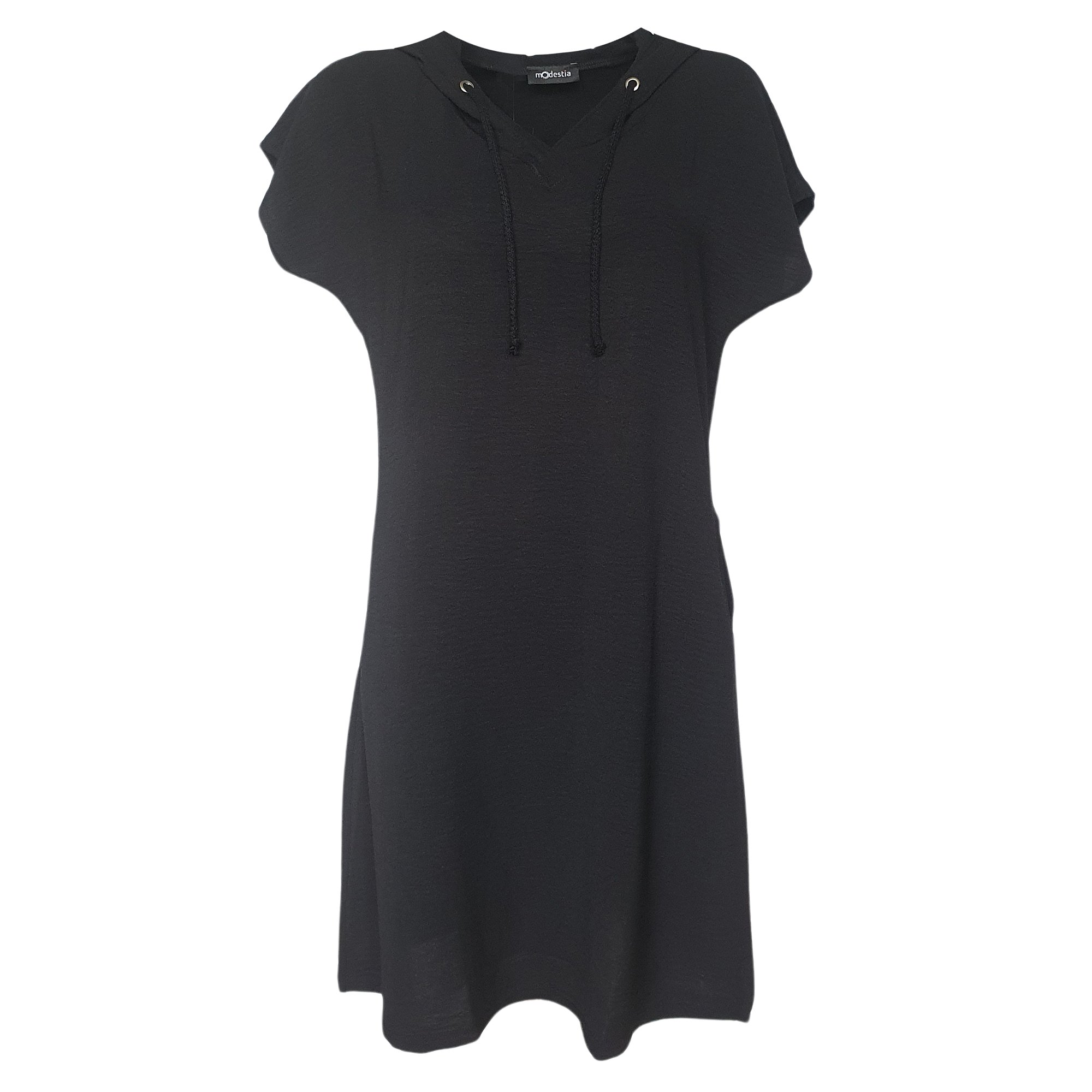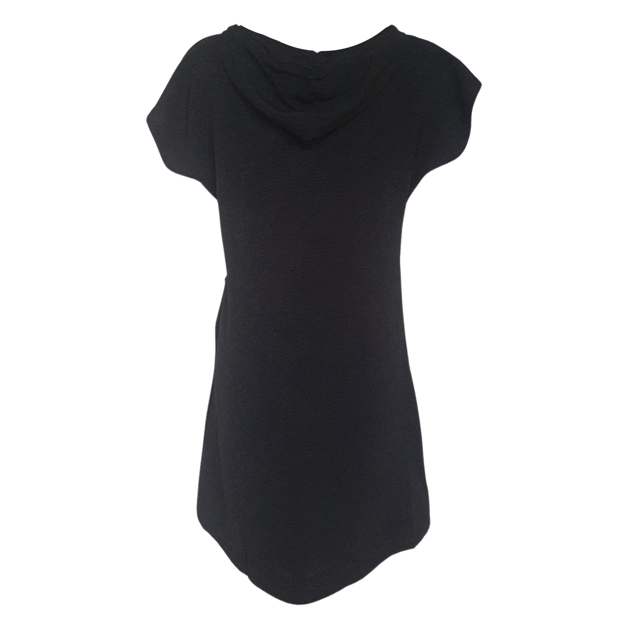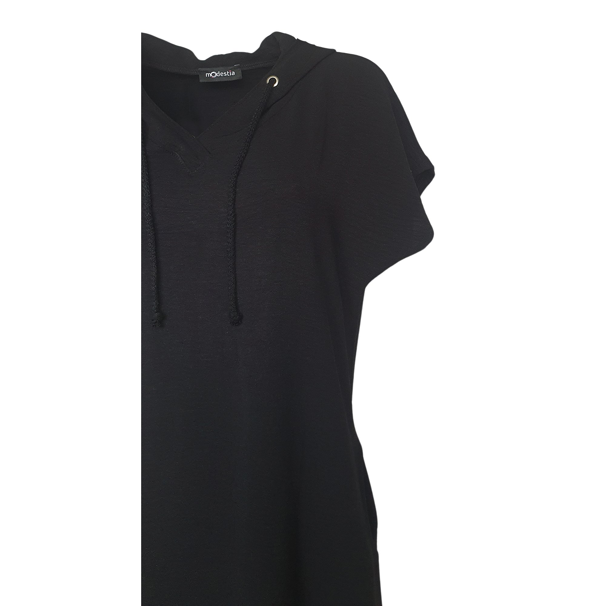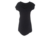Volné šaty v černé barvě s kimonovým rukávem střižené do A s bočními kapsami a kapucí do V. Délka šatů 100 cm. Pereme v pračce na 30°. 95% viskóza 5% elastan