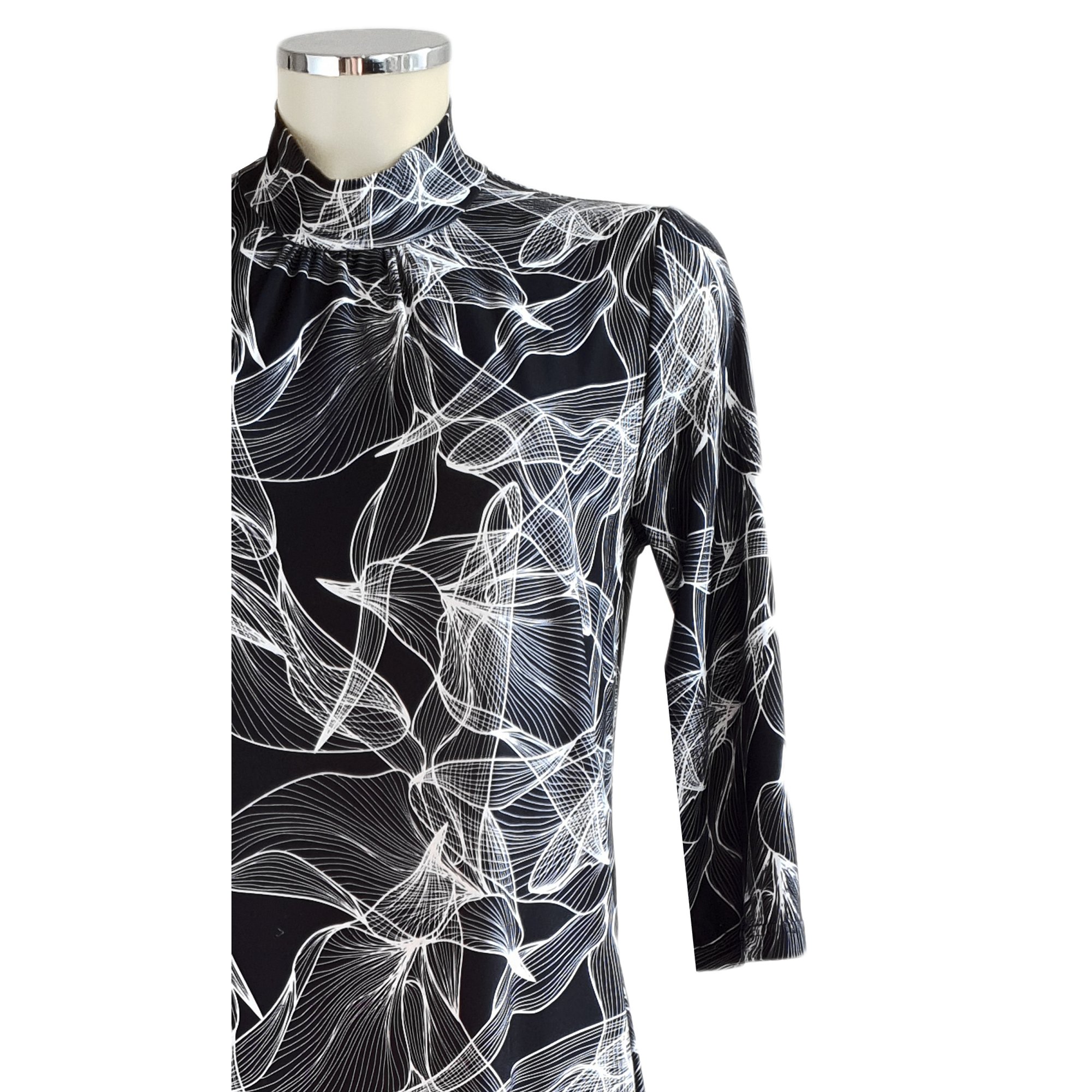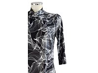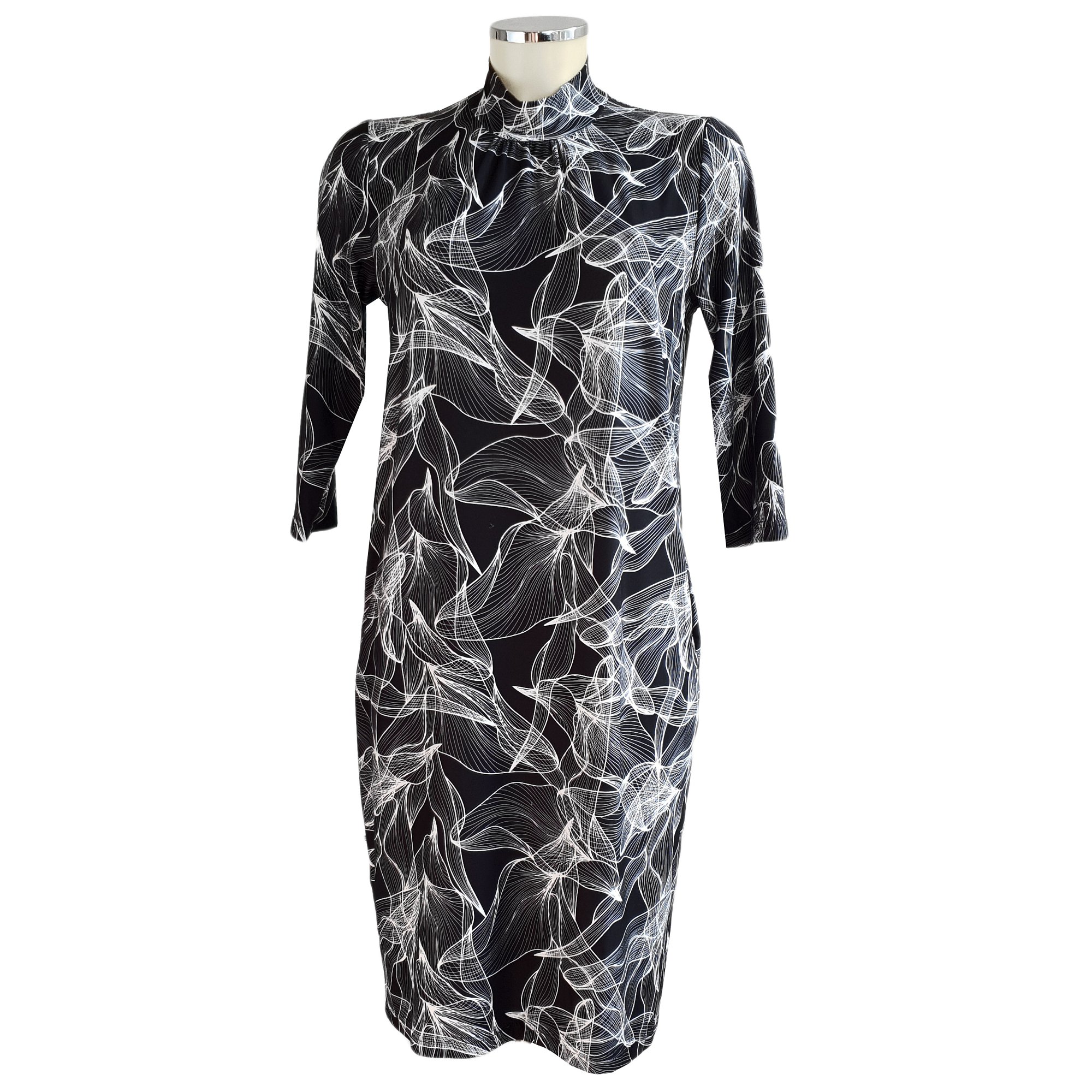 Jednoduché, elegantní šaty se slušivým stojáčkem u krku a s kapsami na bocích. Délka šatů 100 cm. Barva černá s bílým tiskem. Pereme v pračce na 30°. Materiál: 95% polyester 5% elastan