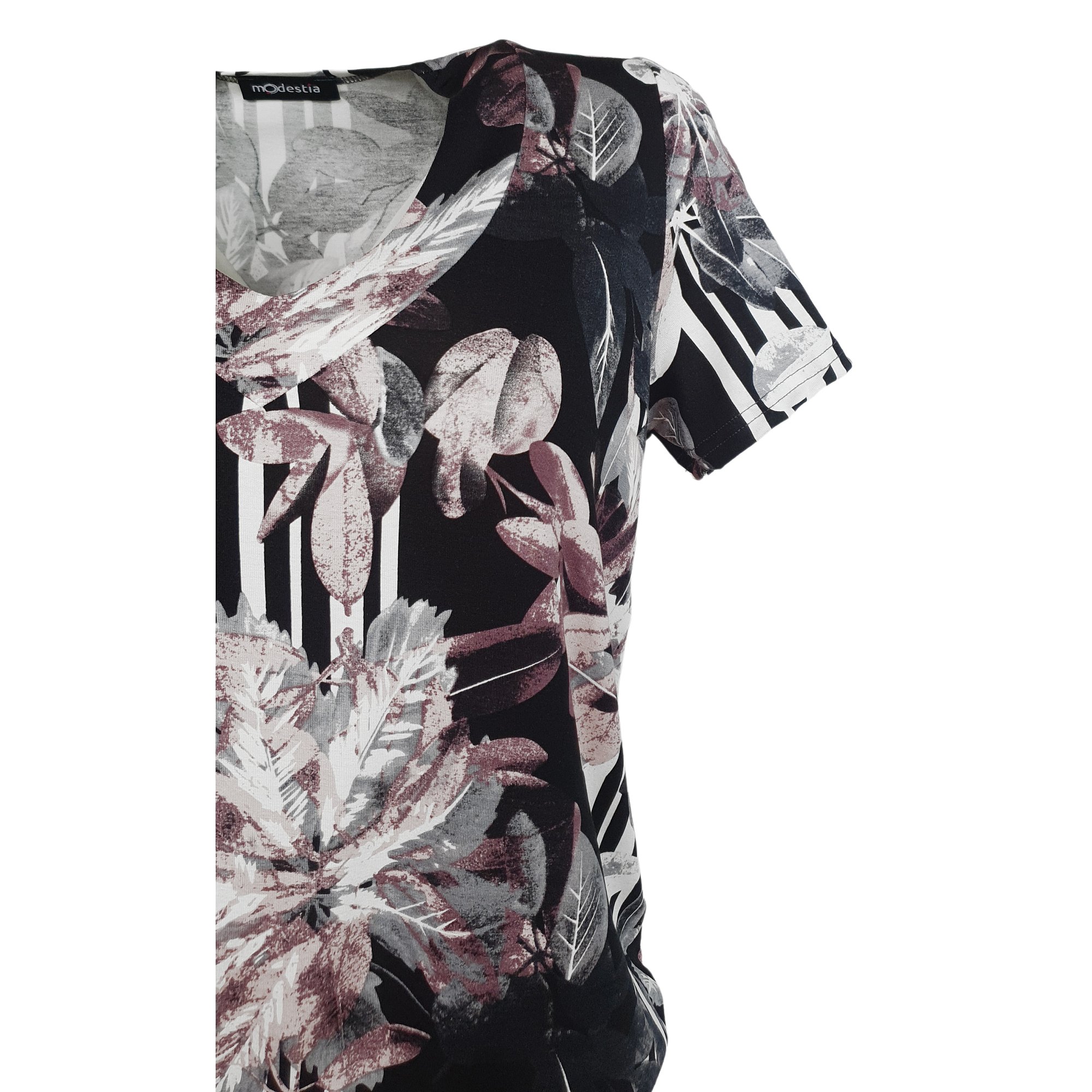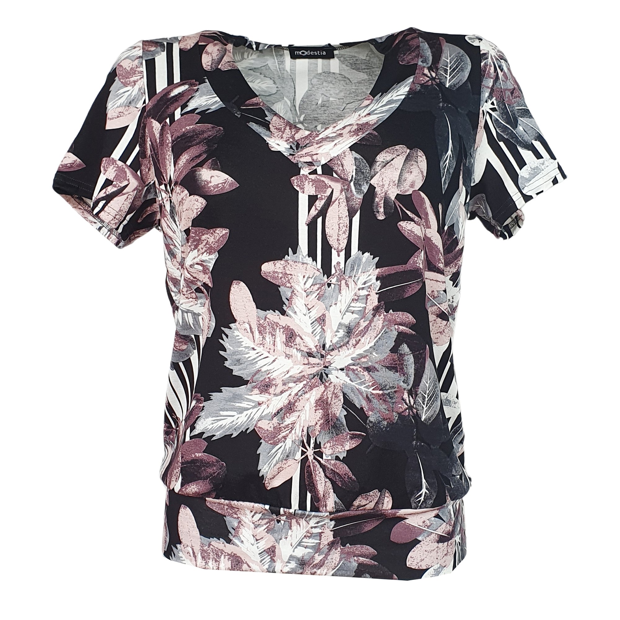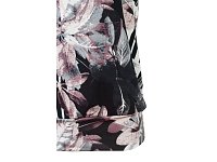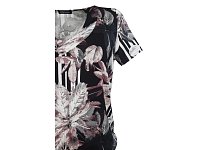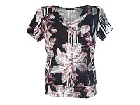 Černobílá halenka s růžovými květy s krásným véčkovým výstřihem volného střihu, na bocích nabraná do širokého lemu. Pereme v pračce na 30°. Materiál: 95% viskóza 5% elastan