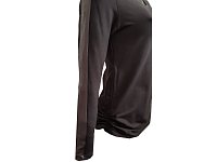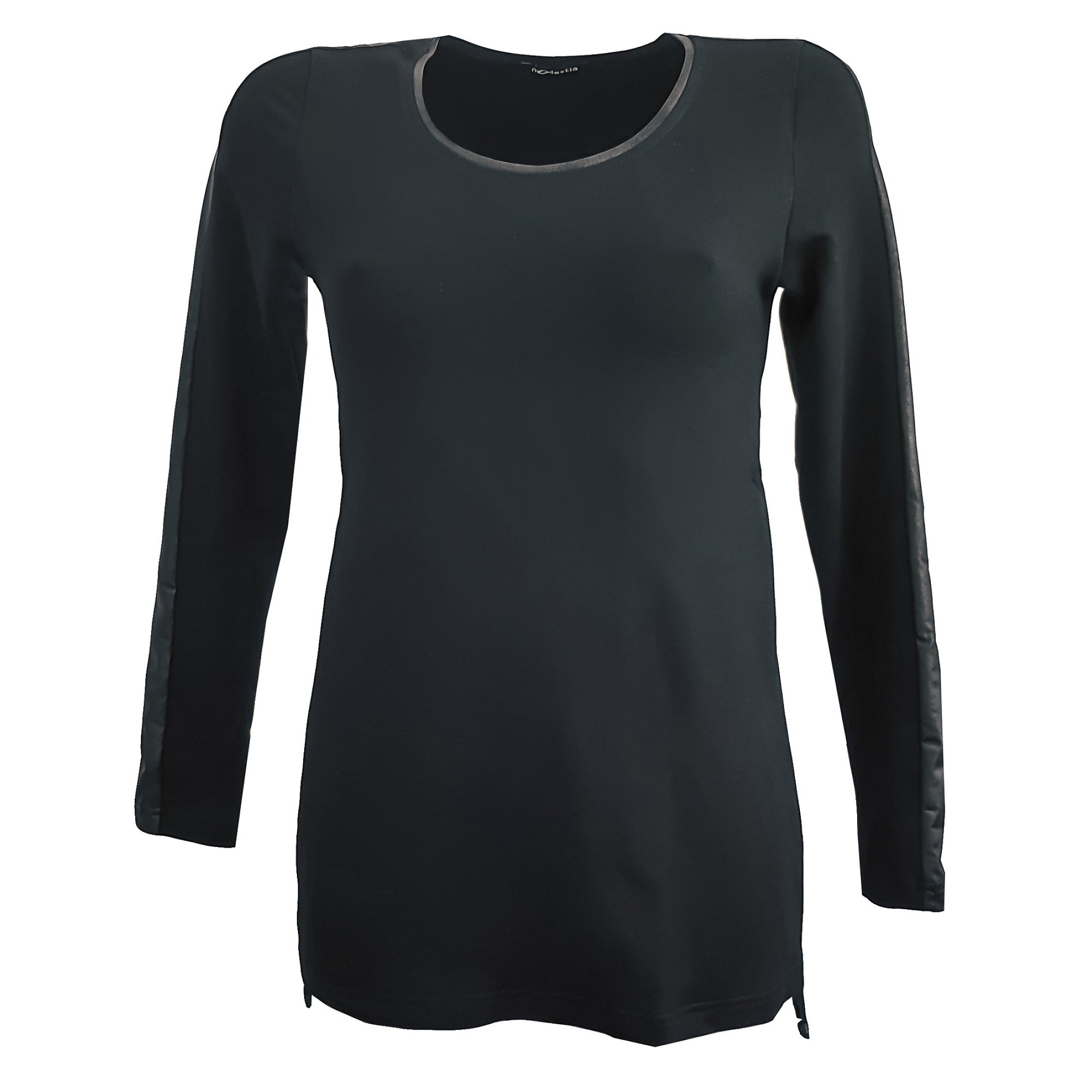 Svetr v černé barvě s pruhem z imitace kůže na rukávu. Dlouhý rukáv. Zajímavě řešené stáhnutí tkaničkami na bocích. Pereme v pračce na 30°. Materiál: 95% viskóza 5% elastan