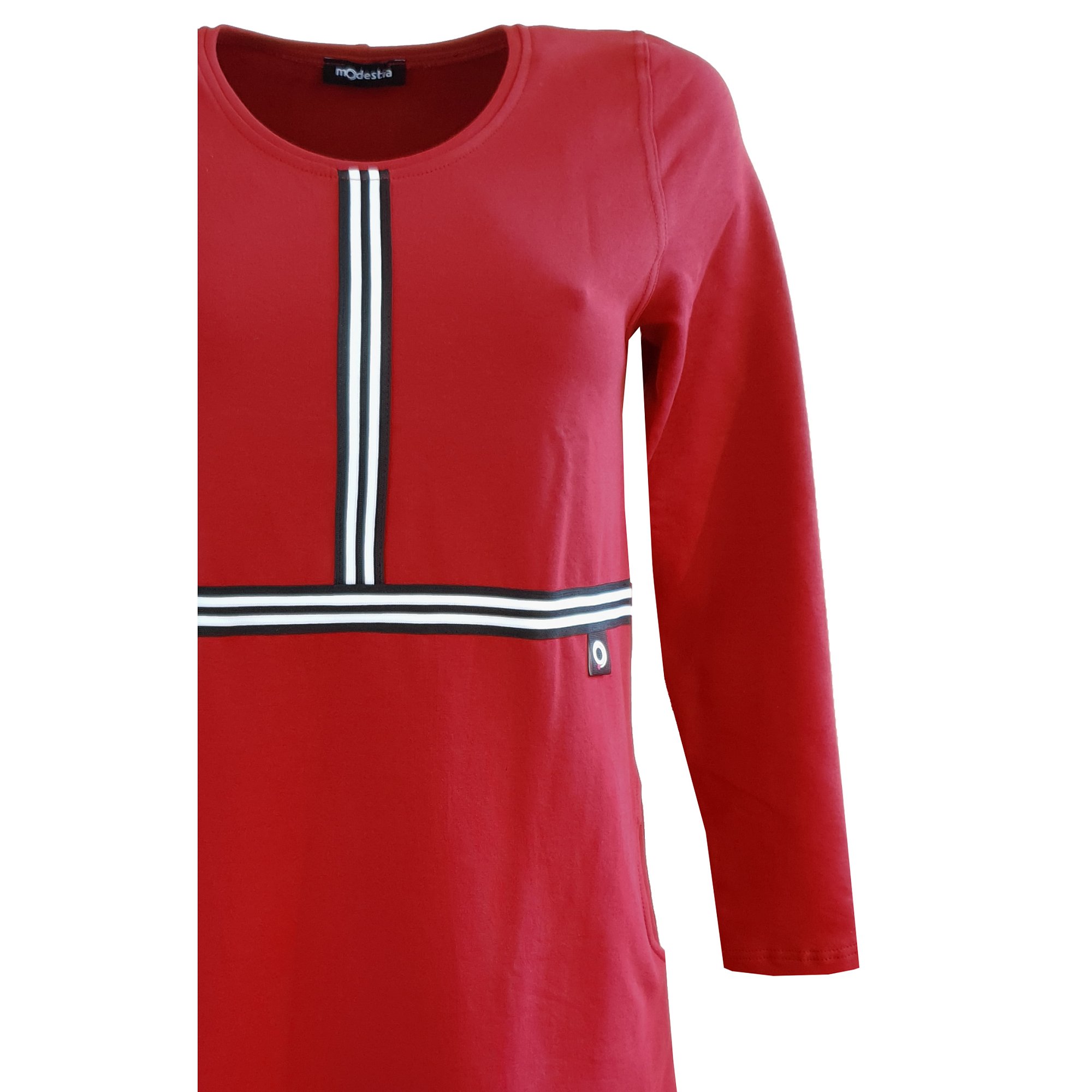 Červená tunika z nepočesané teplákoviny s dlouhým rukávem střižená do A, s kapsami a ozdobnými černo bílými lampasy.Tady je video. Délka 77 cm. Materiál: 97% bavlna 3% elastan