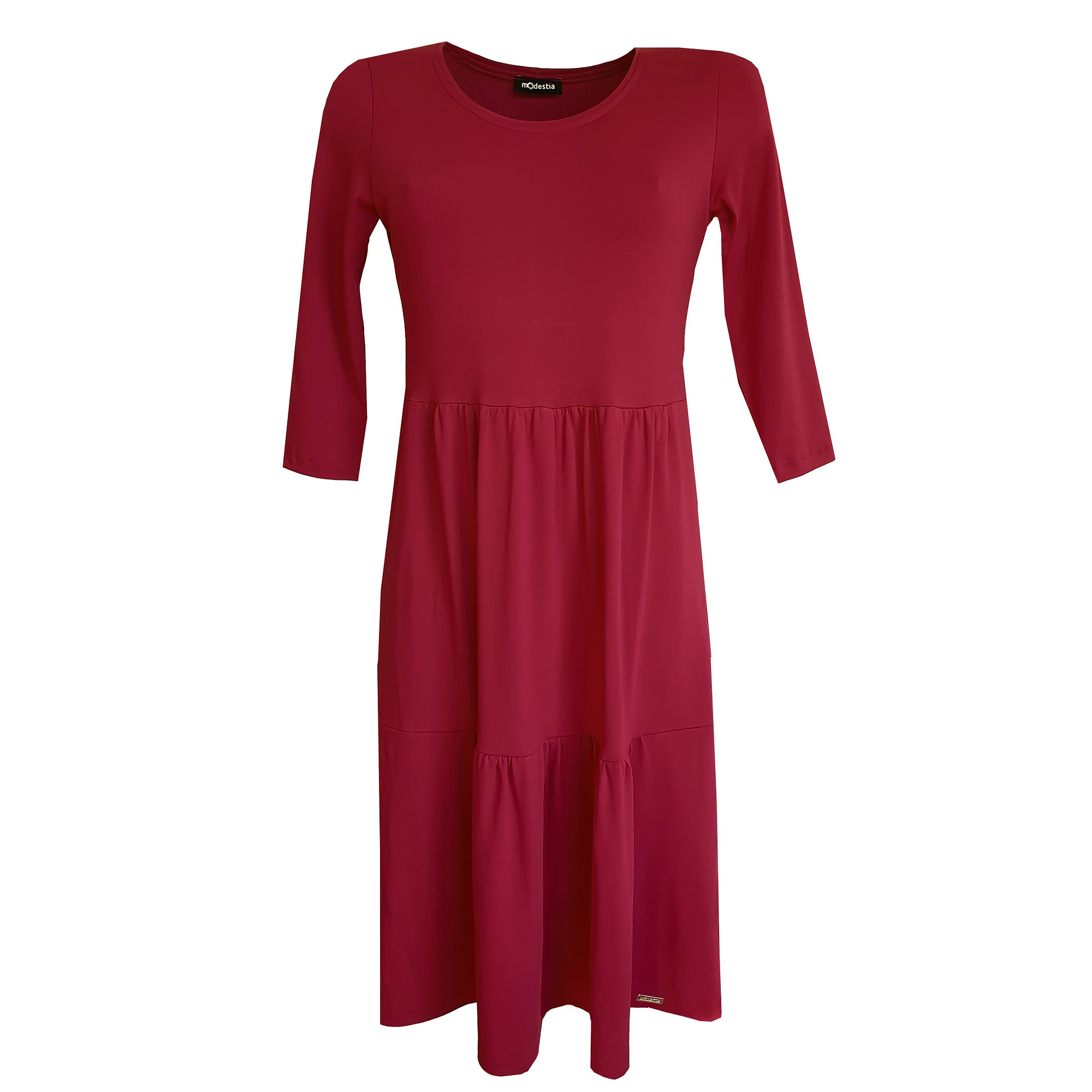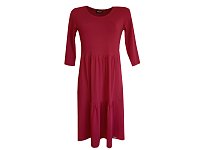 Kaskádové šaty s 3/4 rukávem přestřižené pod prsy s kanýry v červené barvě, které i ve větších velikostech zakryjí nedostatky postavy a přitom vyzdvihnou ženské tvary. Délka šatů je 100 cm. Údržba - pereme v pračce na 30°. 95 % viskóza 5 % elastan