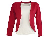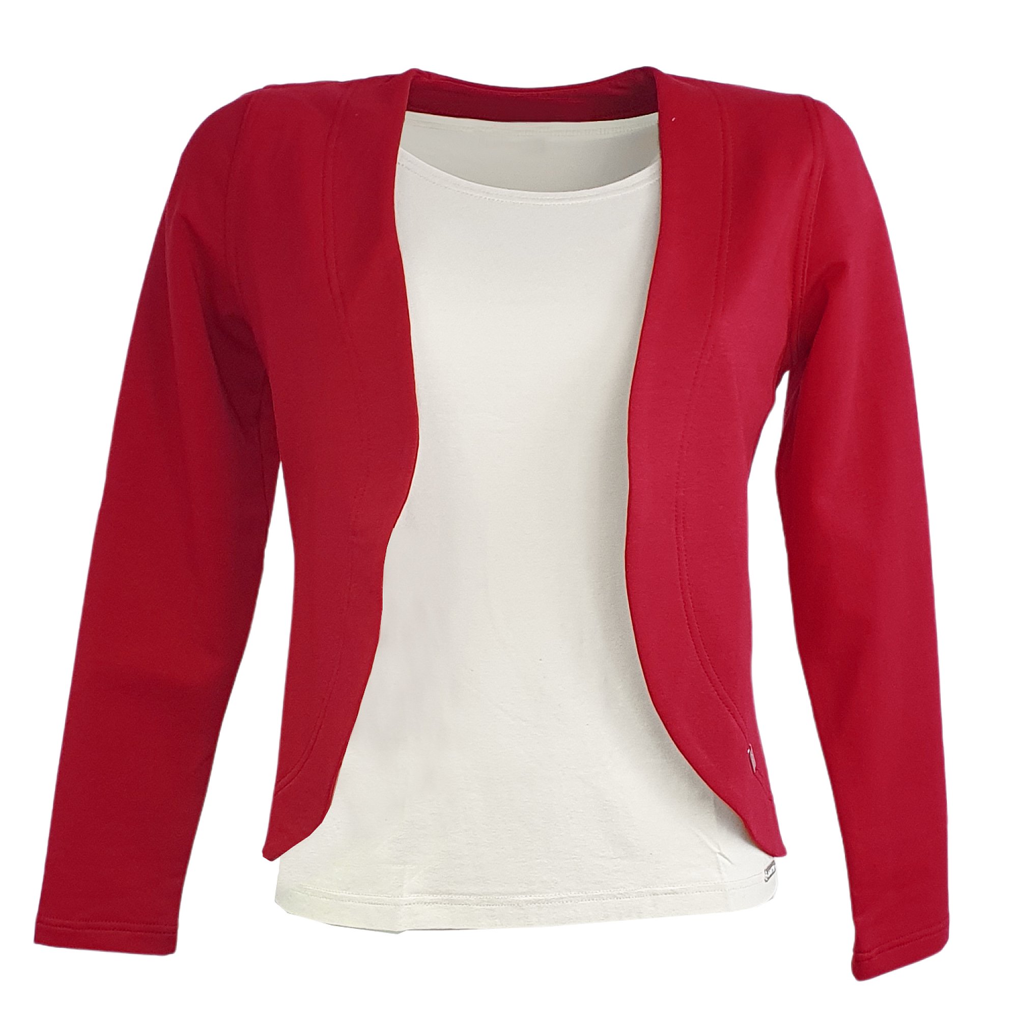Volnočasová vesta - sako s dlouhým rukávem v červené barvě. Materiál - nepočesaná teplákovina. Délka 57 cm. Pereme v pračce na 30°. 95% bavlna 5% elastan