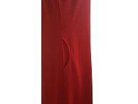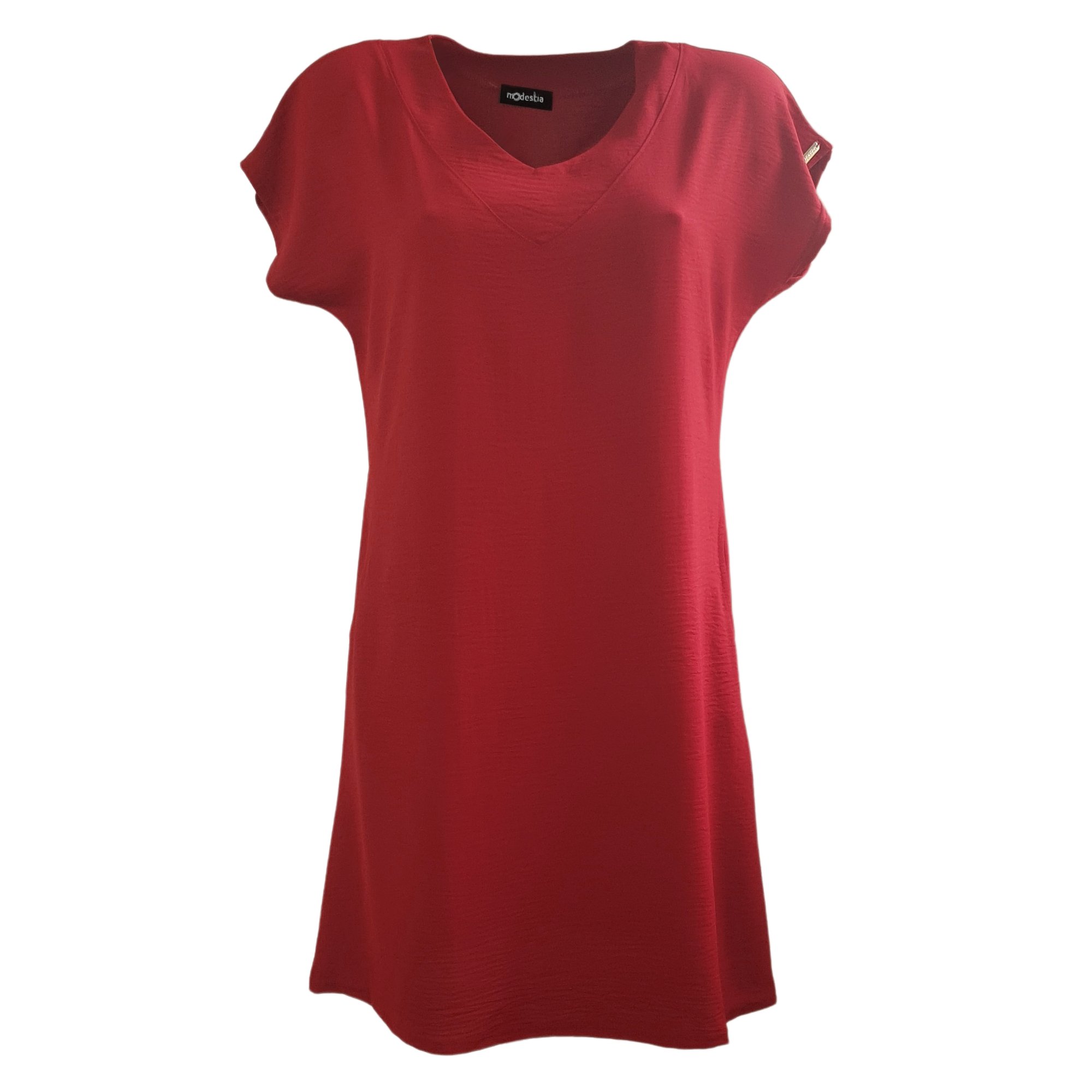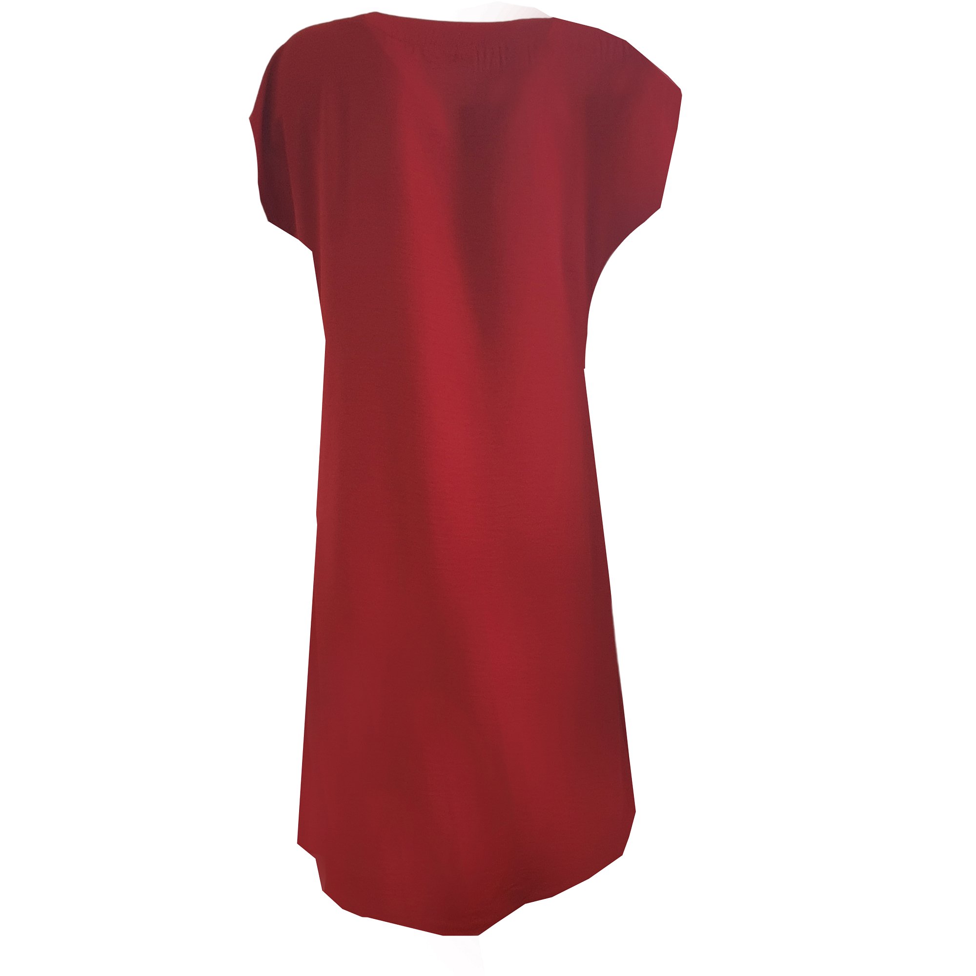 Šaty v červené barvě s kimonovým rukávem střižené do A s bočními kapsami a výstřihem do V. Délka šatů 100 cm. Pereme v pračce na 30°. 95% viskóza 5% elastan