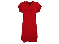 Šaty v červené barvě s přinechaným rukávem střižené do A s bočními kapsami a kapucí. Délka šatů 100 cm. Pereme v pračce na 30°. 95% polyester 5% elastan