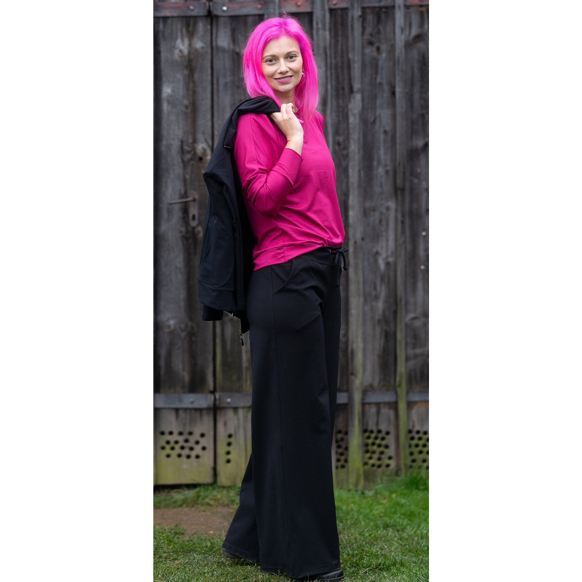Dámské pohodlné kalhoty v tmavě černé barvě zaujmou svým širokým střihem. V pase mají praktickou šňůrku na zavazování a přizpůsobení velikosti podle potřeb. Délka 100 cm. Materiál: 74% polyester, 21% viskóza, 5% elastan