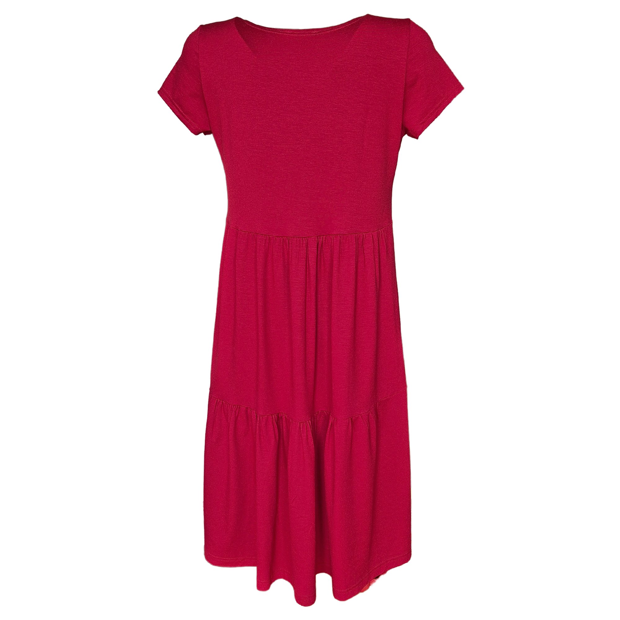 Dámské šaty ve vínové barvě mají volný, pohodlný střih s krátkým rukávem a nabíraným kulatým výstřihem. Přestřižené pod prsy a jemným nařasením ve spodní části. Délka 105 cm. Materiál: 95% viskoza, 5% elastan.