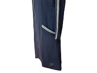 Dámský sportovní kabátek v tmavě modré barv, celopropínací zip a mírně rozšířený střih, bílé pruhy podél rukávů a na lemování kapes. Límec je měkce stojáčkový, což působí elegantně, ale neformálně. Materiál 97% bavlna 3% elastan.