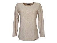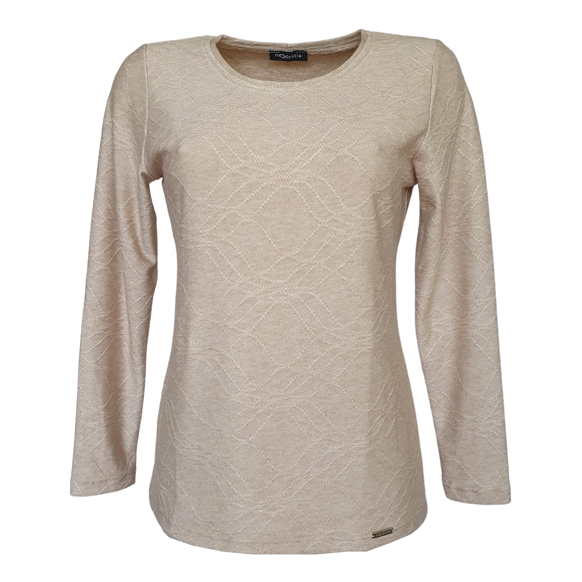 Dámský svetr s dlouhým rukávem klasického střihu. Svetřík má béžovou barvu s jemným texturovým vzorem. Střih je rovný a pohodlný. Materiál je měkký a příjemný na dotek. Pereme v pračce na 30°. Materiál 74% polyester 21% viskóza 5% elastan.
