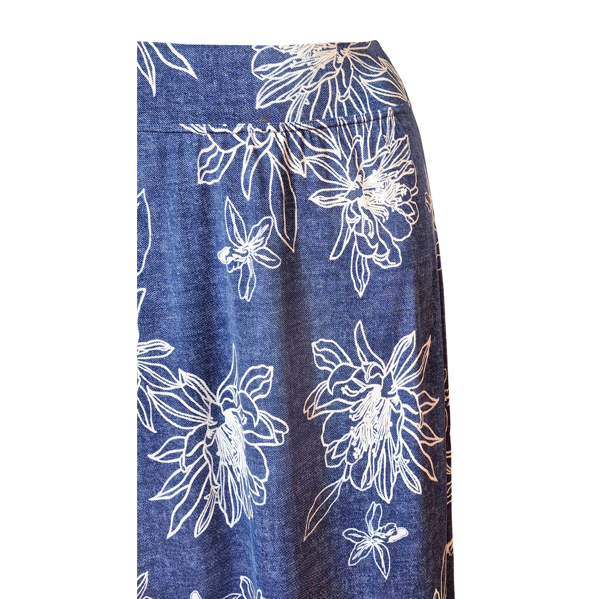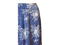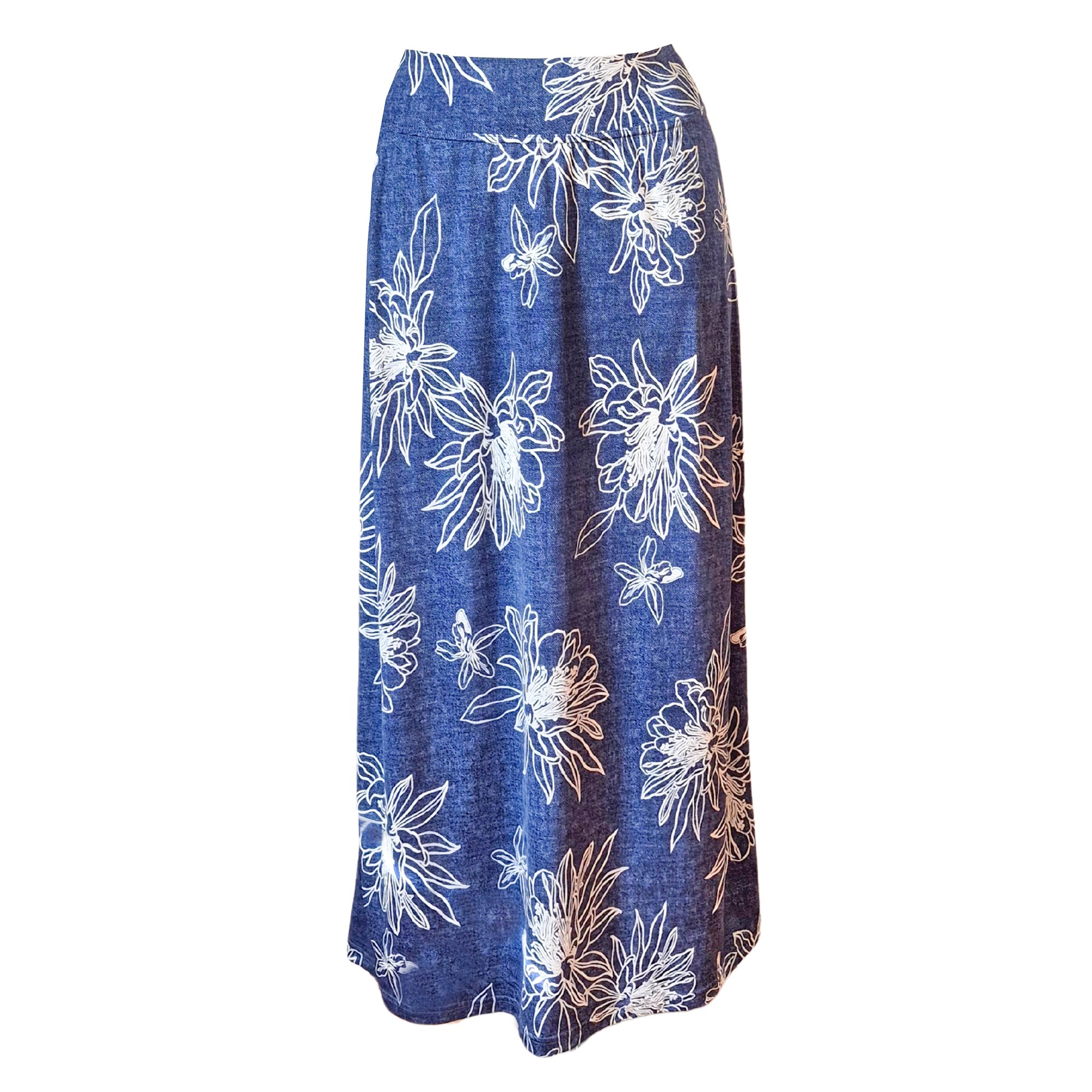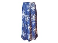 Dlouhá letní sukně s bílým plastickým tiskem na džínově modré barvě. Zajímavě řešená elastická pasovka. Délka 90 cm. Údržba - praní na 30° v pračce. Materiál: 95% polyester, 5% elastan.