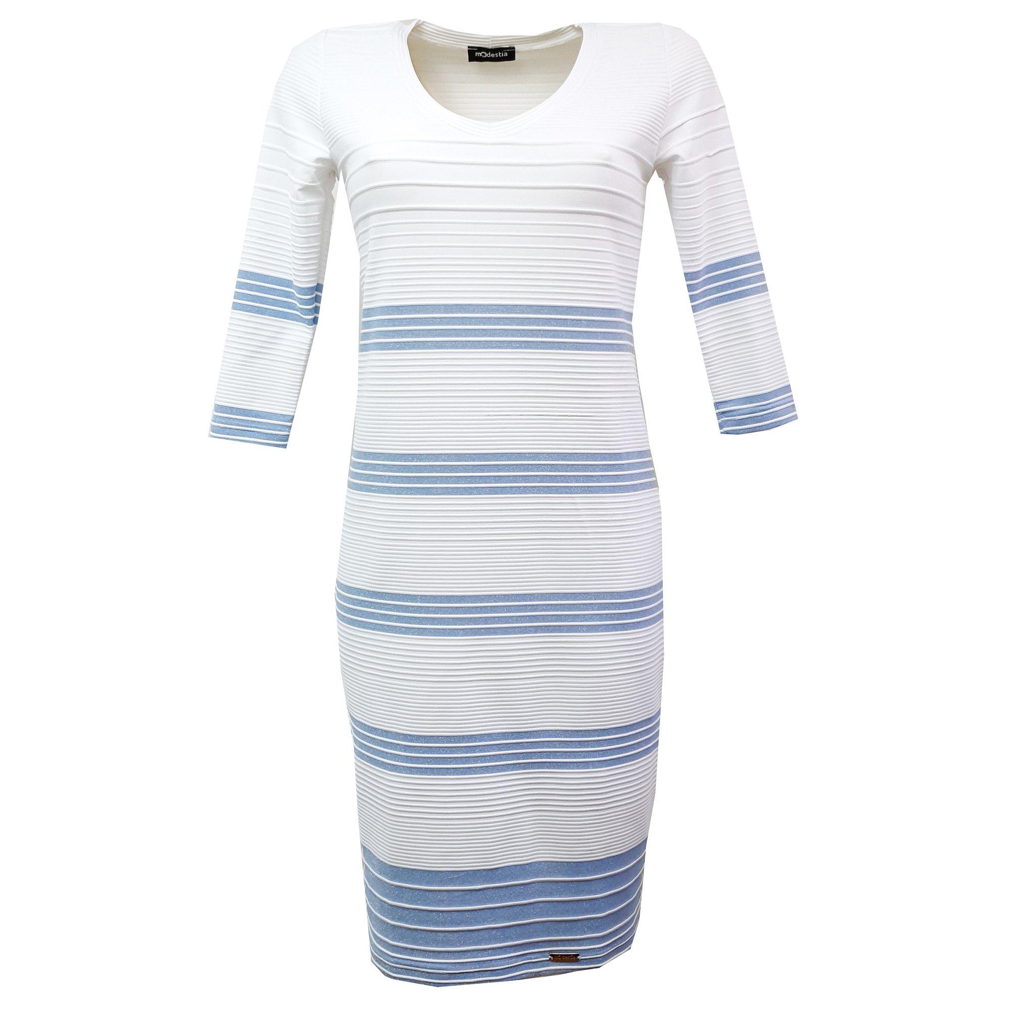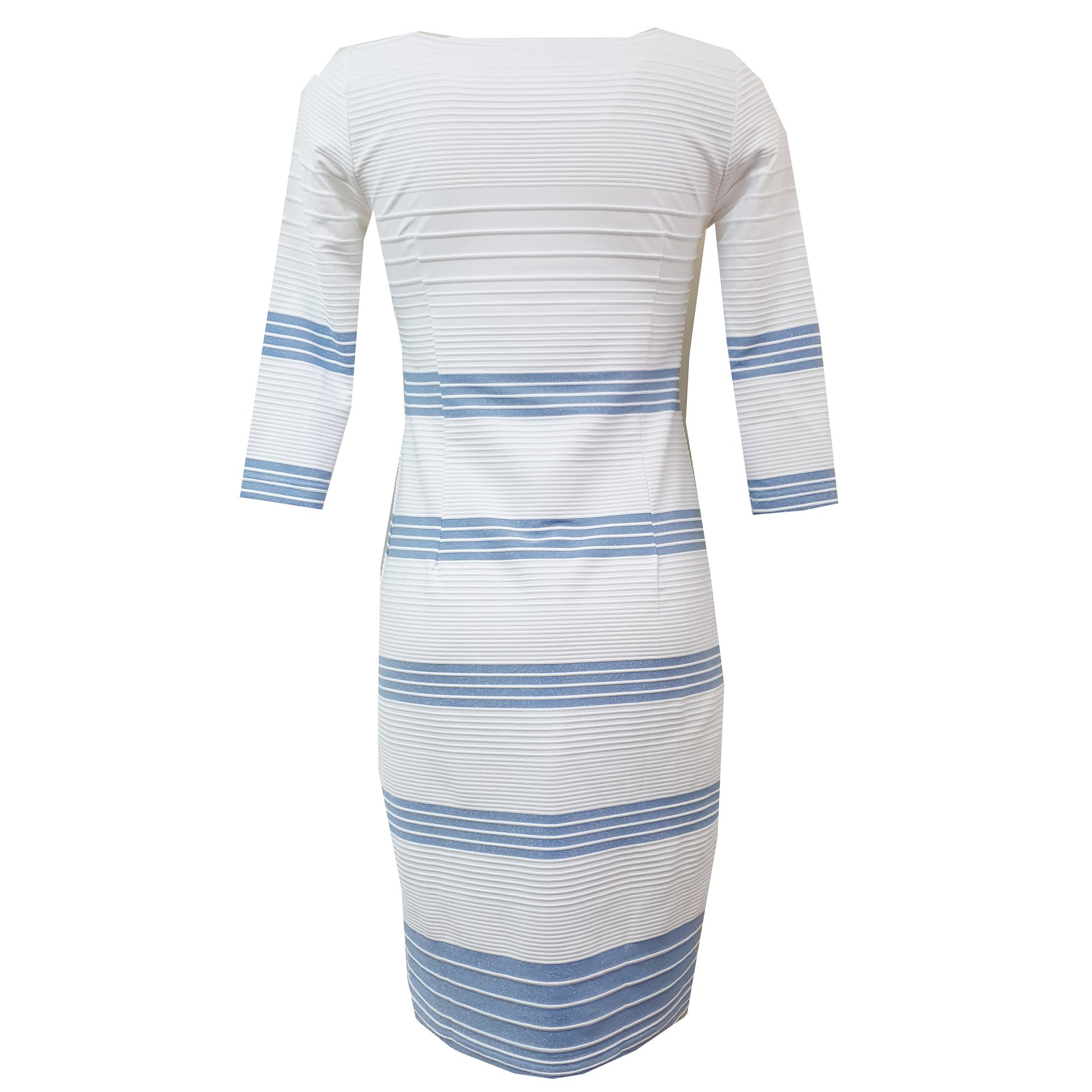Elegantní bílé pouzdrové šaty se světle modrými lurexovými pruhy, vhodné i na společenské příležitosti s lemovaným výstřihem do širokého V. 3/4 rukáv. Délka 100 cm. Pereme v pračce na 30°. Materiál: 9