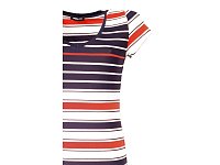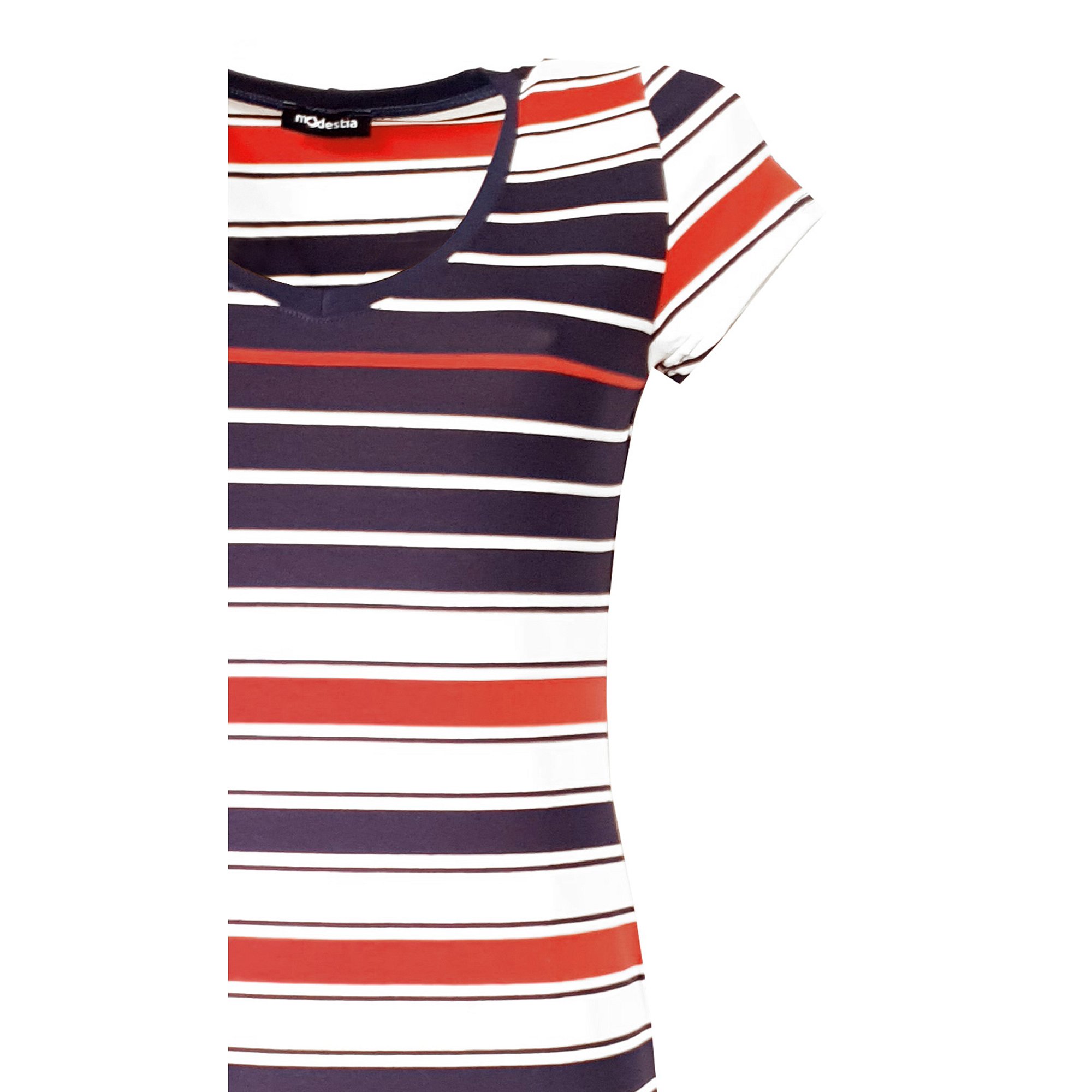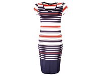 Šaty s krátkým rukávem s modro bílo červenými pruhy v klasickém projmutém střihu s výstřihem do V. Délka 100 cm. Pereme v pračce na 30°. Materiál: 95% viskóza 5% elastan