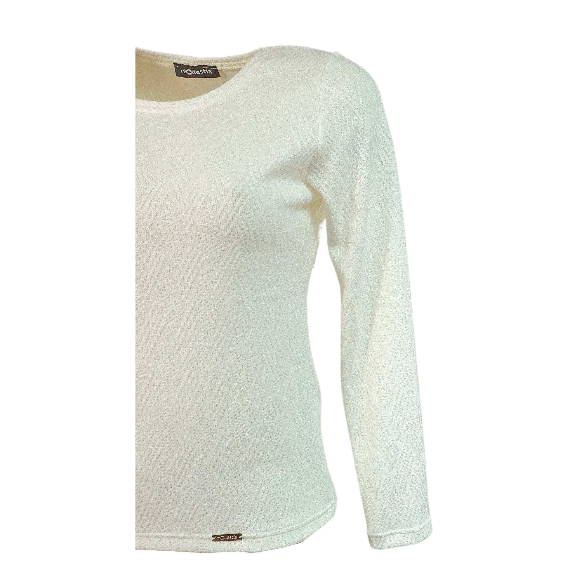 Dámský svetr s dlouhým rukávem klasického střihu. Svetřík má jemnou krémovou barvu a je zdobený jemným vzorem. Střih je rovný a pohodlný. Materiál je měkký a příjemný na dotek. Svetřík je vhodný jak pro běžné nošení, tak i pro formálnější příležitosti. Délka u vel. 36 je 57 cm, stupňování v délce po 2 cm. Pereme v pračce na 30°. Materiál 74% polyester 21% viskóza 5% elastan. Můžete doplnit návlekem na krk ve stejné barvě a textuře. Kód produktu NVL903.