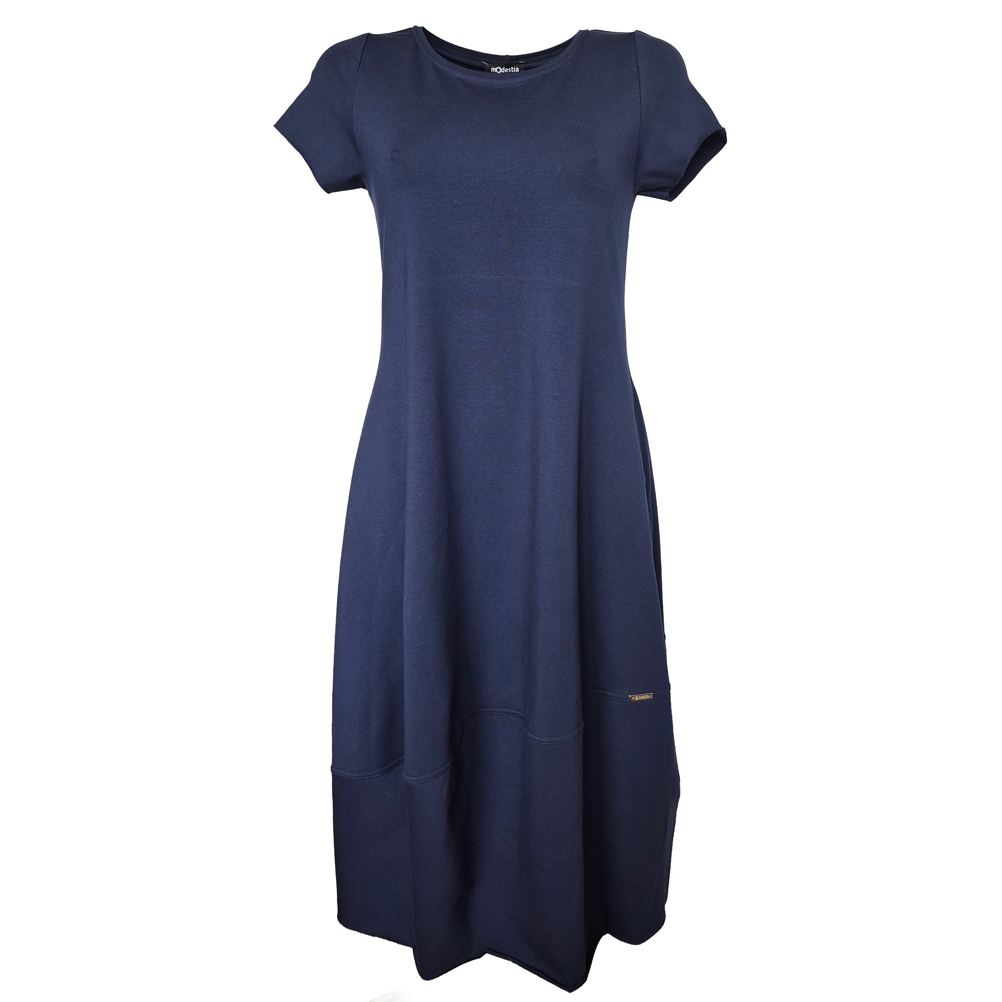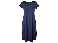 Elegantní dámské šaty v tmavě modré barvě s krátkým rukávem. Šaty mají volnější, lehce áčkový střih s balónovým efektem. Délka 115 cm. Materiál 95% viskóza, 5% elastan.