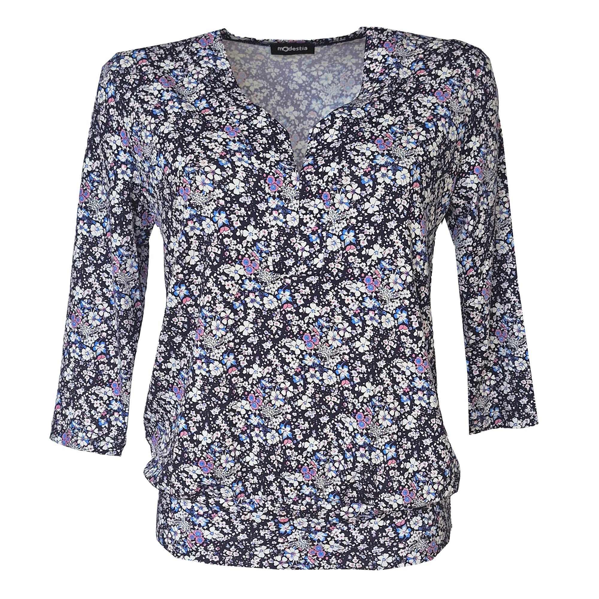 Elegantní dámská halenka s drobným květinovým vzorem na tmavém podkladu, doplněná jemnými akcenty v modré, bílé a růžové barvě. Příjemný, lehký materiál zaručuje pohodlí po celý den. Střih s 3/4 rukávy a výstřihem do „V“ s malým rozparkem působí velmi žensky a nadčasově. Spodní lem podtrhuje siluetu a dodává halenkce moderní vzhled. Skvěle se hodí k elegantním kalhotám i džínům pro volnočasový outfit. Materiál 95% viskóza, 5% elastan.Pereme v pračce na 30°.