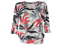 Elegantní dámská halenka s výrazným moderním potiskem, který kombinuje jemné šedé tóny s kontrastní černou a energickými akcenty v korálově červené barvě. Volnější střih zajišťuje pohodlí při nošení a lichotivě splývá na postavě.