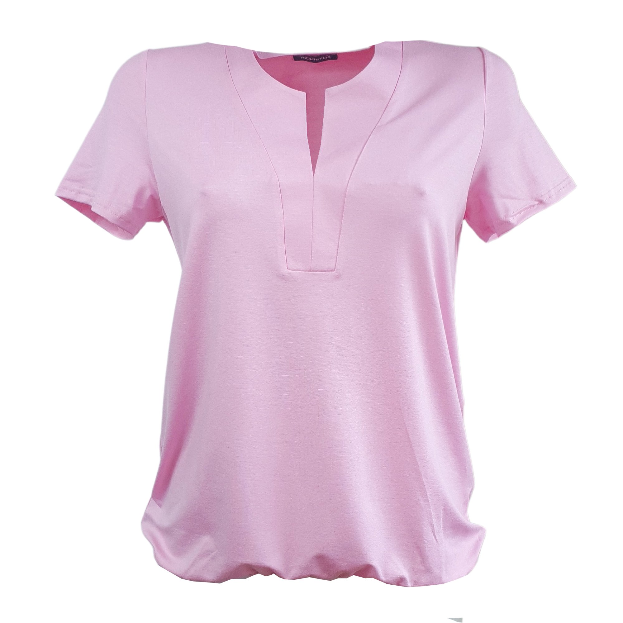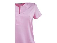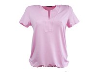 Dámská halenka s krátkým rukávem volnějšího střihu s jemně prohloubeným výstřihem s prostřihem v růžové barvě. Spodní lem nabraný do gumičky. (Gumička je pouze navlečená - lze jednoduše odstranit.) Pereme v pračce na 30°. 95% viskóza 5% elastan
