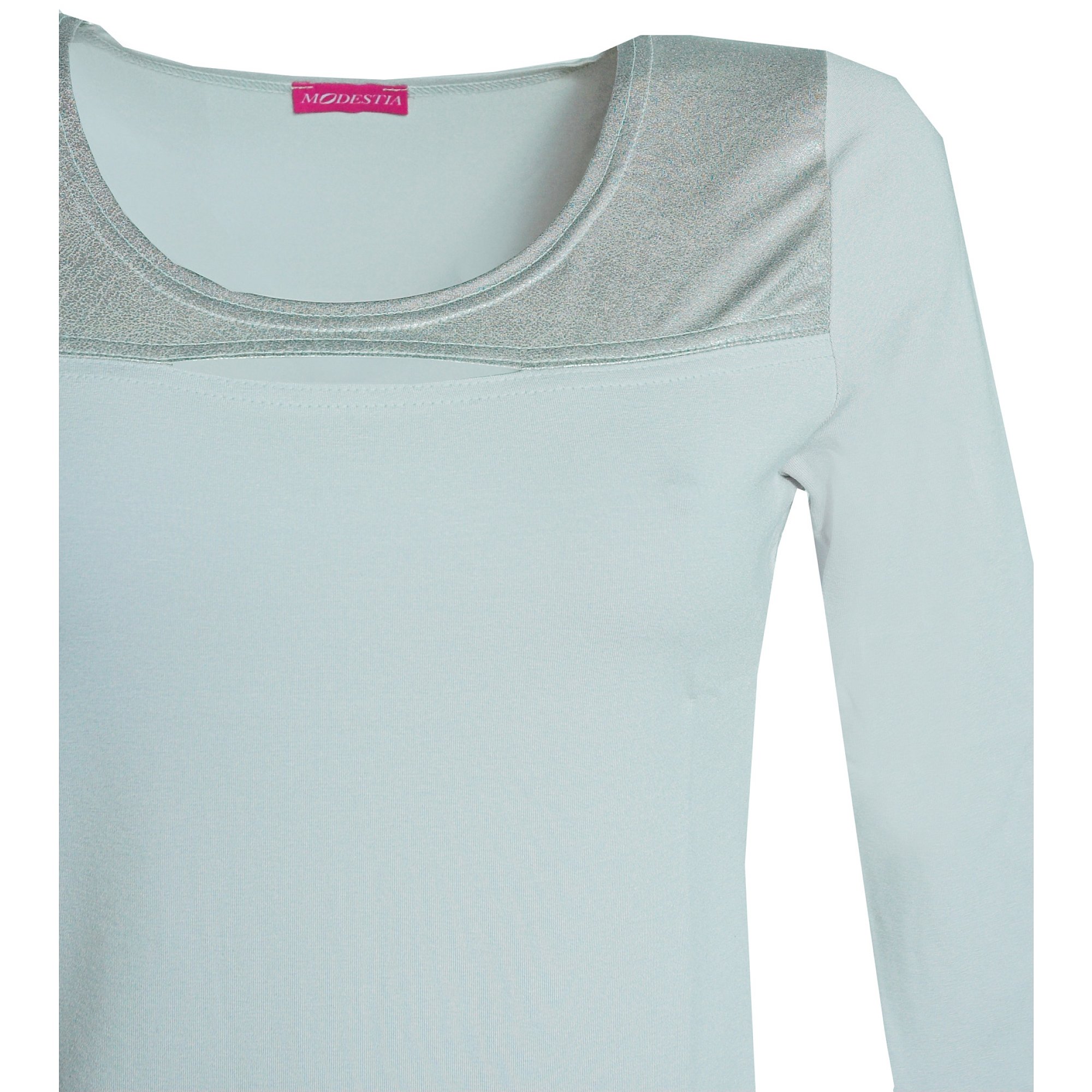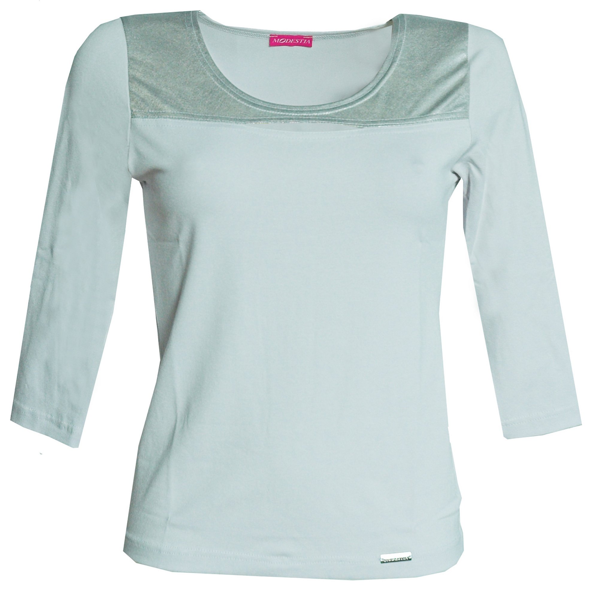 Halenka ve světle šedé barvě s 3/4 rukávem a zajímavě řešeným sedlem z imitace kůže. Prostřih na prsou. Materiál: 95% viskóza 5 % elastan