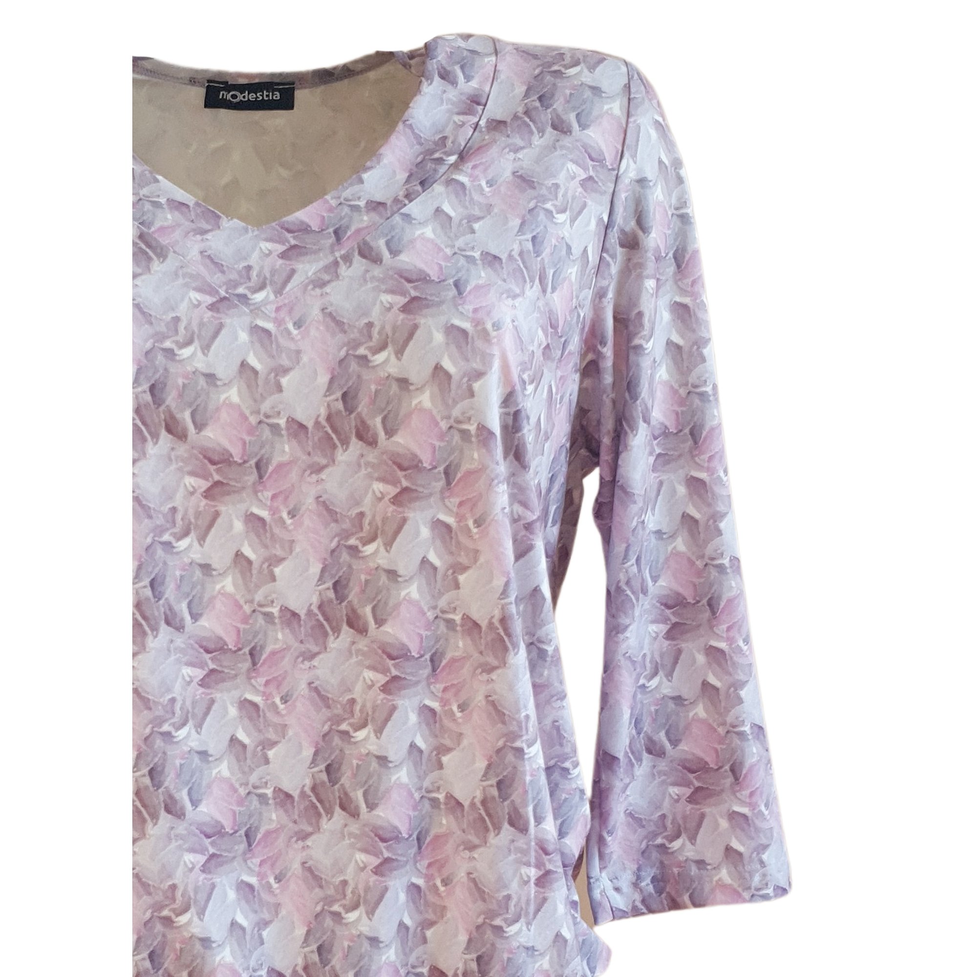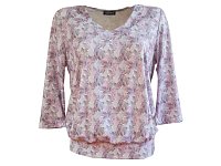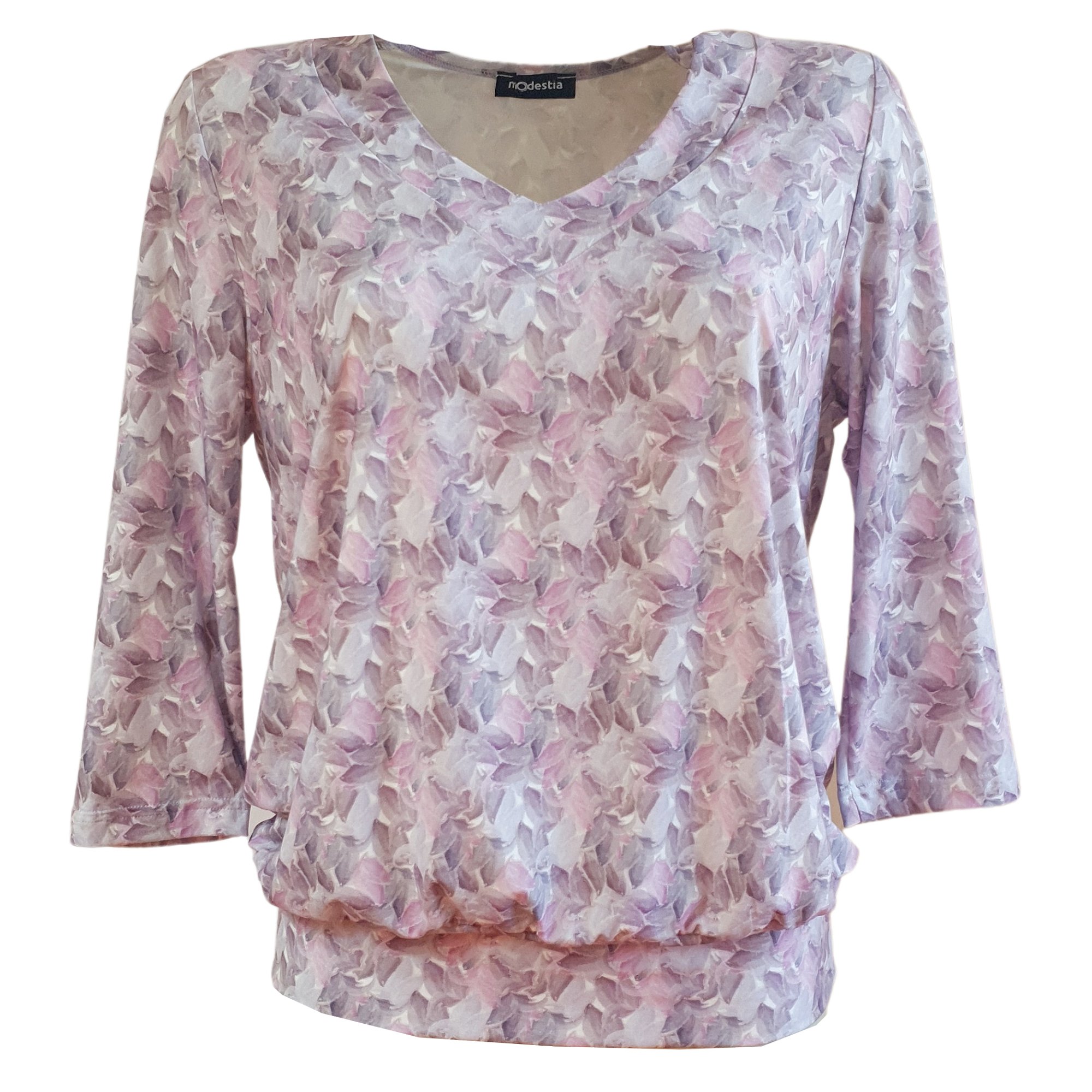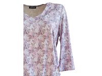 Halenka s véčkovým výstřihem volného střihu, na bocích nabraná do širokého lemu. 3/4 rukáv. Barva šedo růžová. Pereme v pračce na 30°. Materiál: 95% polyester 5% elastan