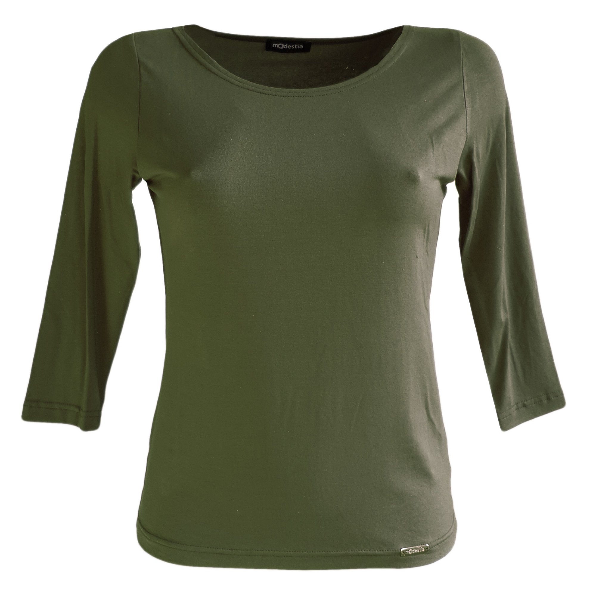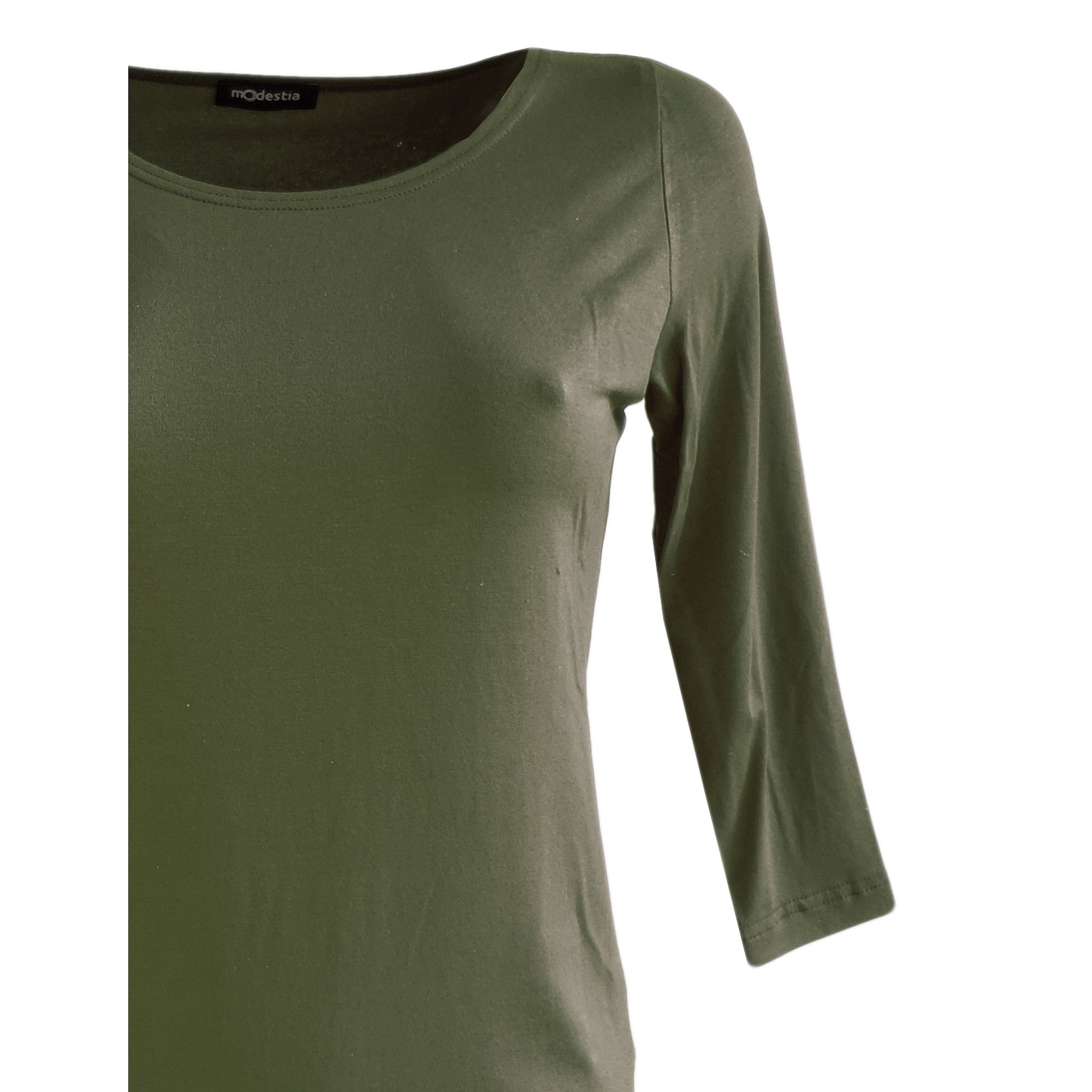Klasická jednobarevná jemně projmutá halenka v khaki barvě, mělký kulatý výstřih, 3/4 rukáv. Materiál: 83 % viskóza 11% polyamid 6 % elastan