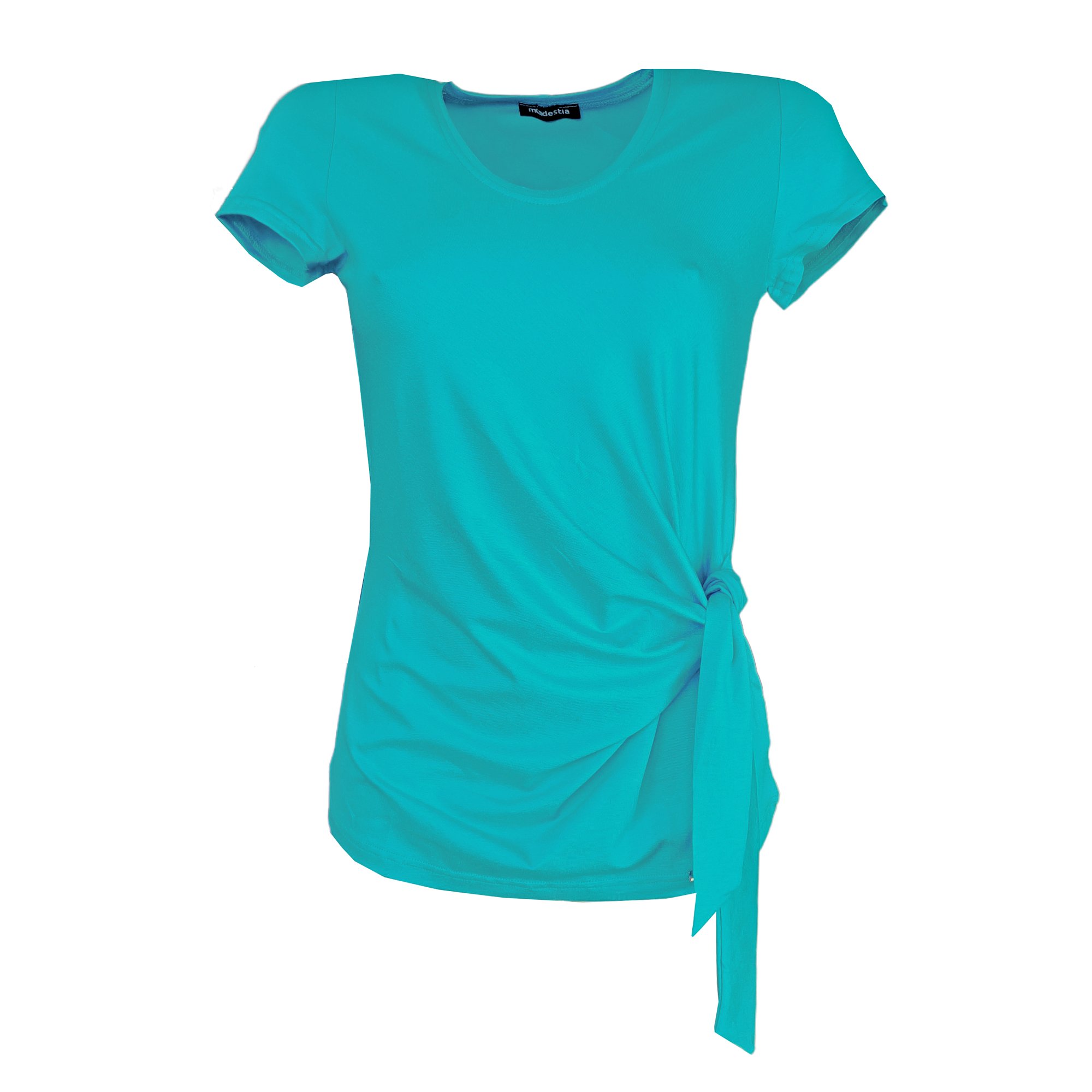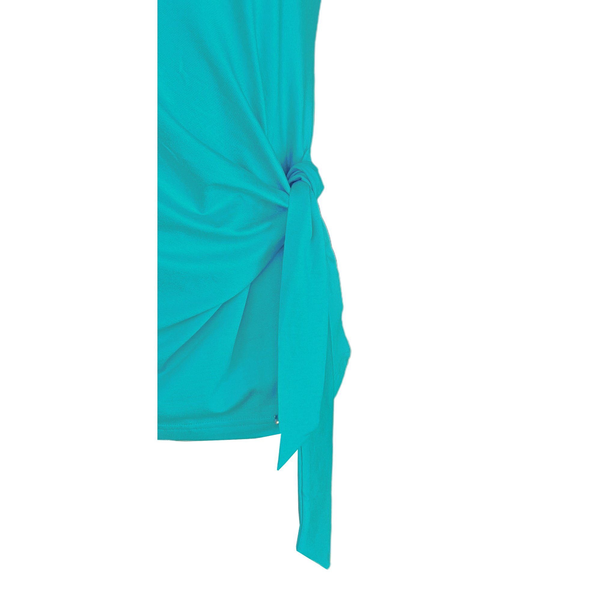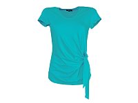 Triko s krátkým rukávem s vázačkou na boku v jasně modré barvě. Pereme v pračce na 30°. Materiál: 95% viskóza 5% elastan