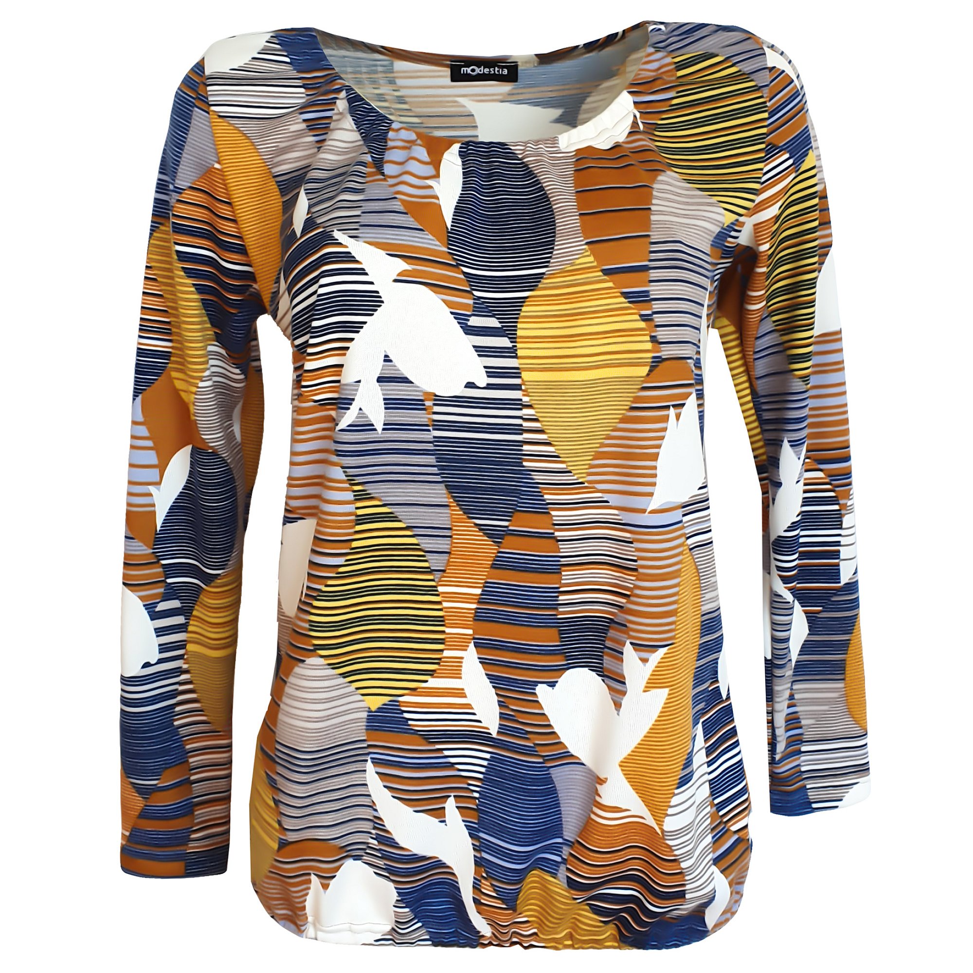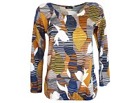 Slušivá dámská halenka - svetřík volnějšího střihu, s geometrickým vzorem ve žluto modré barvě. Výstřih a spodní lem jsou nabrané do gumičky. Pereme v pračce na 30°. Materiál: 95 % polyester 5 % elast