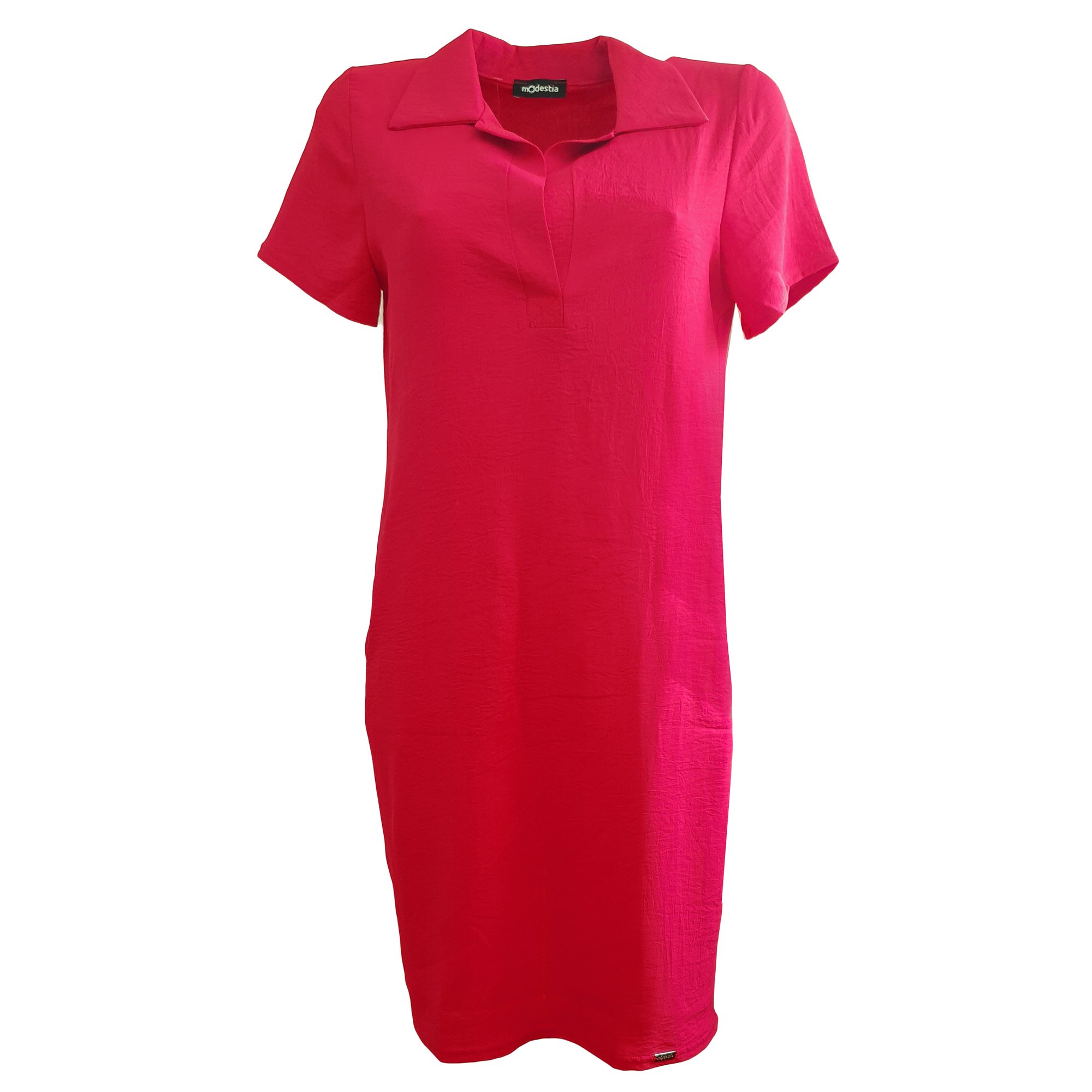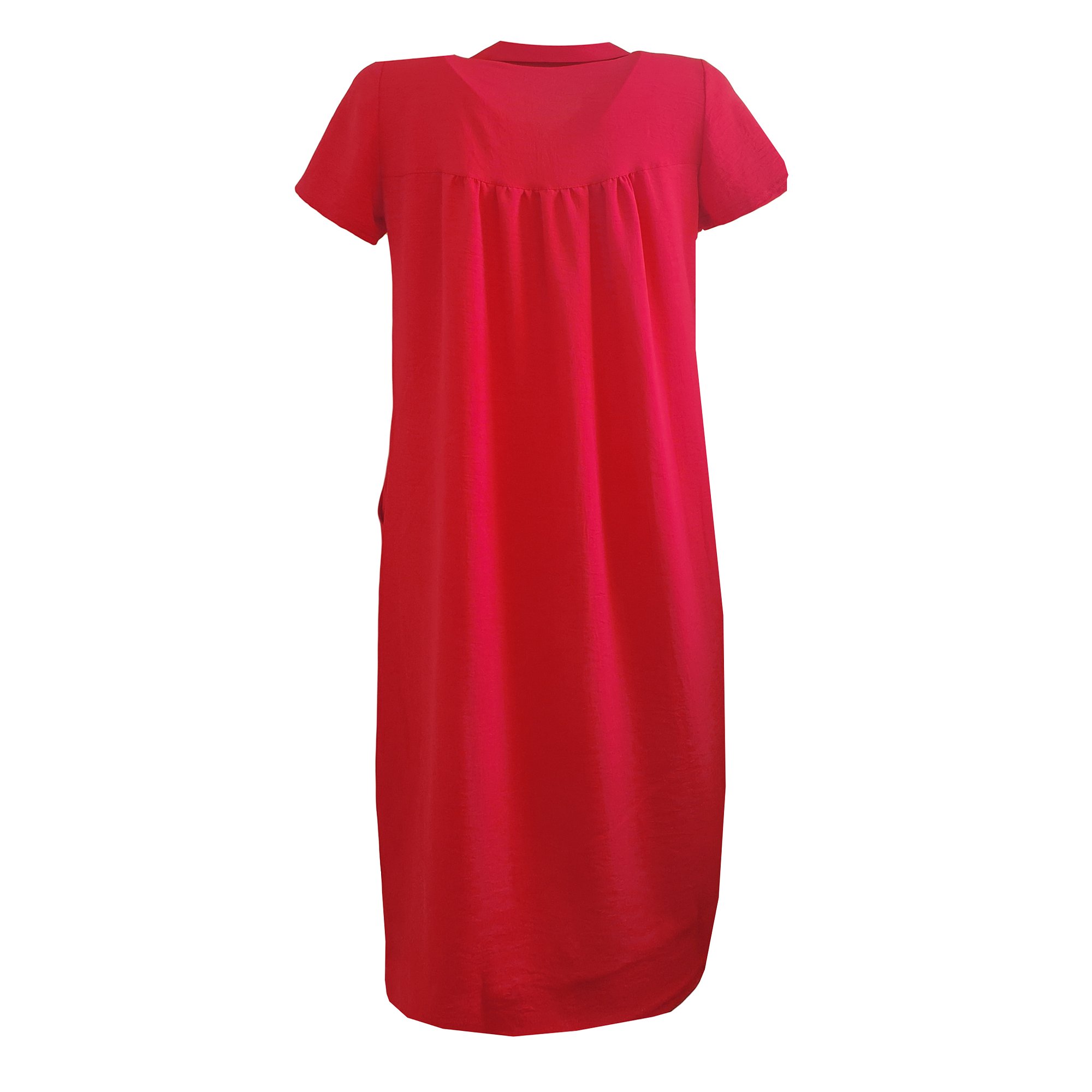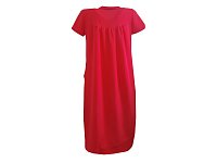 Šaty s krátkým rukávem rovného střihu s bočními kapsami. Zadní díl nařasený do sedla. Barva jahodová. Jemný splývavý materiál. Délka šatů 100 cm. Pereme v pračce na 30°. 95% polyester 5% elastan