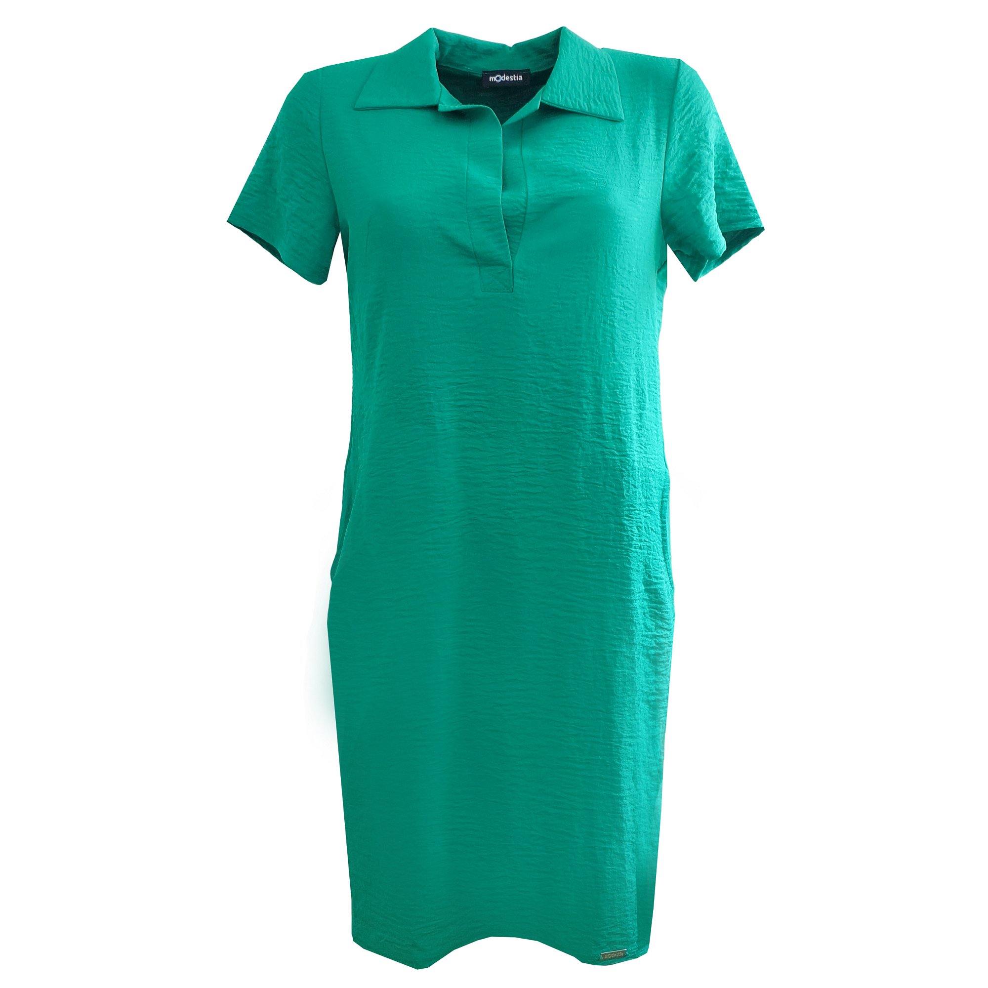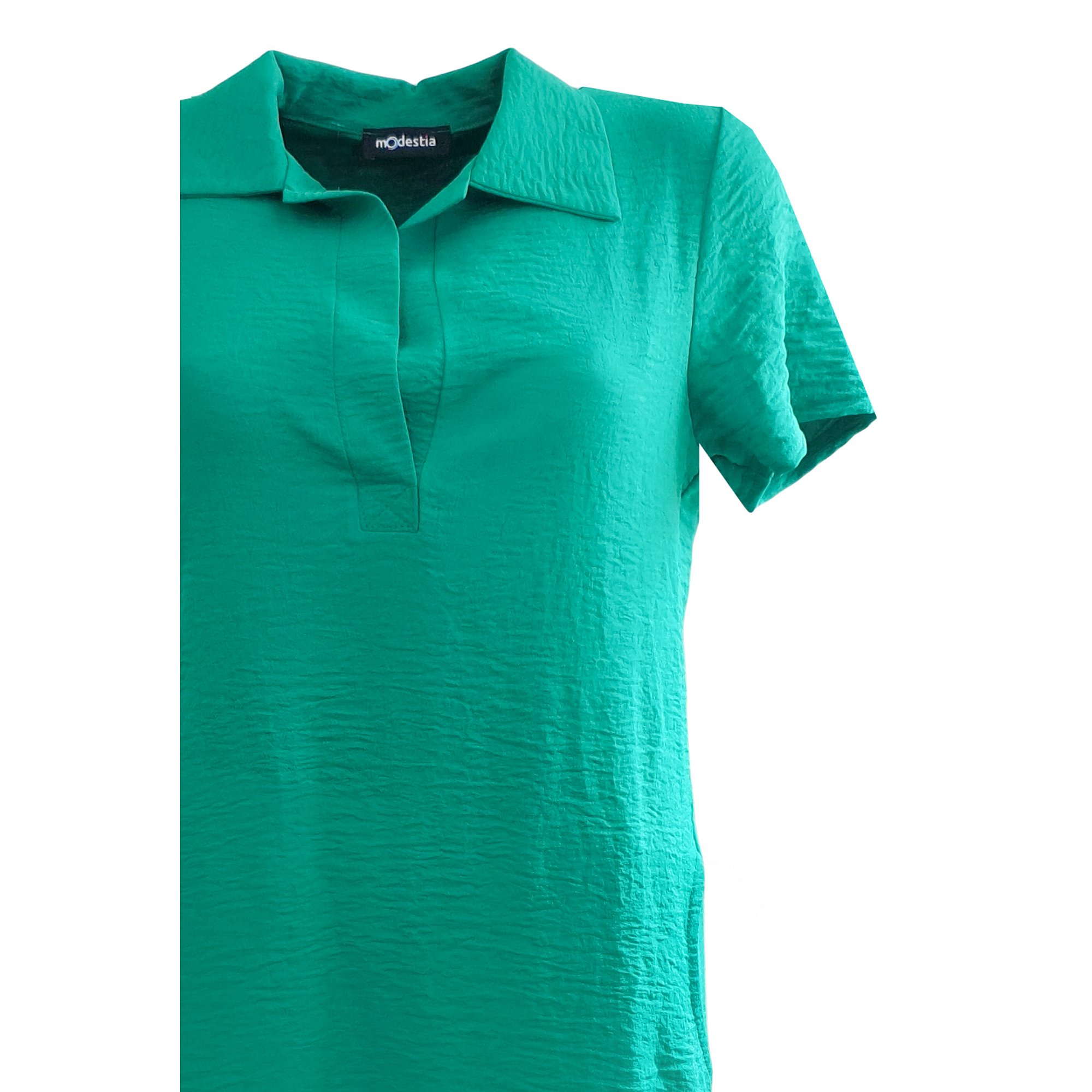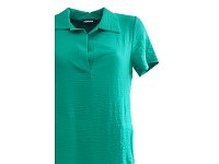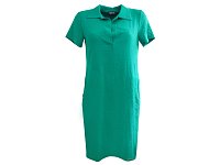 Košilové šaty s krátkým rukávem rovného střihu s bočními kapsami. Zadní díl nařasený do sedla. Barva sytě zelená. Jemný splývavý materiál. Délka šatů 100 cm. Pereme v pračce na 30°. 95% polyester 5% elastan