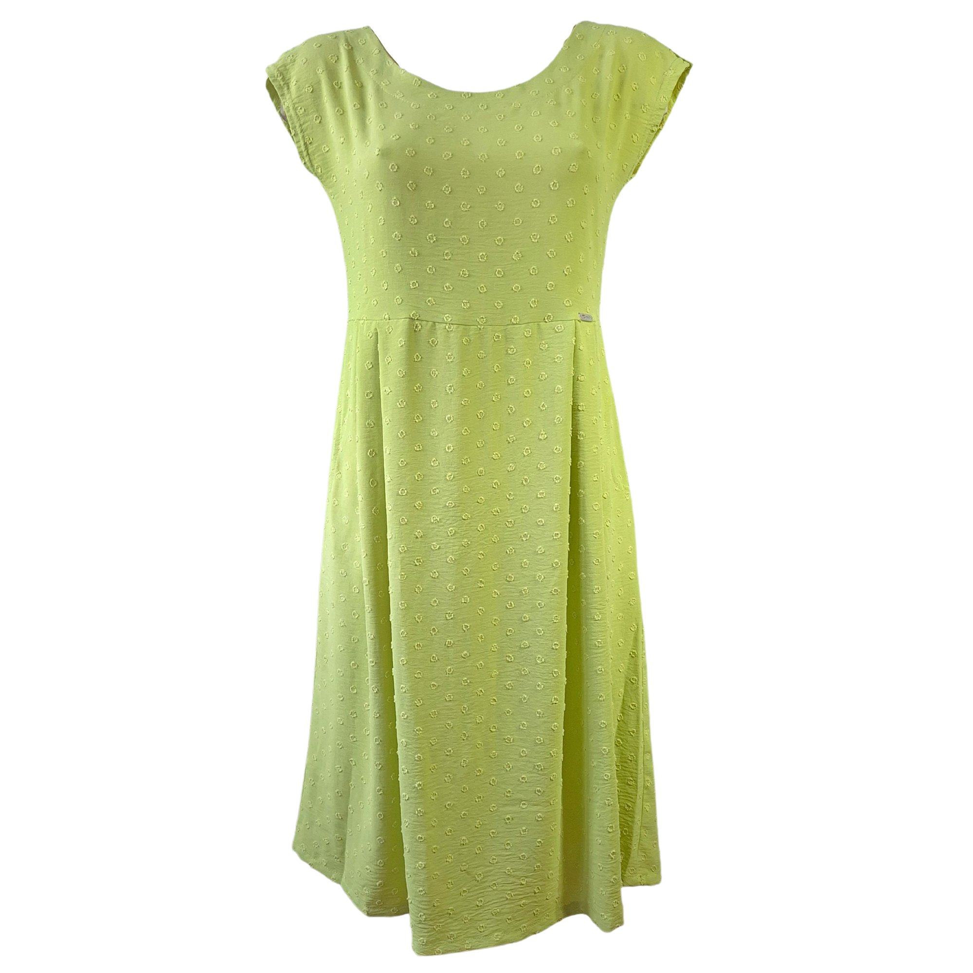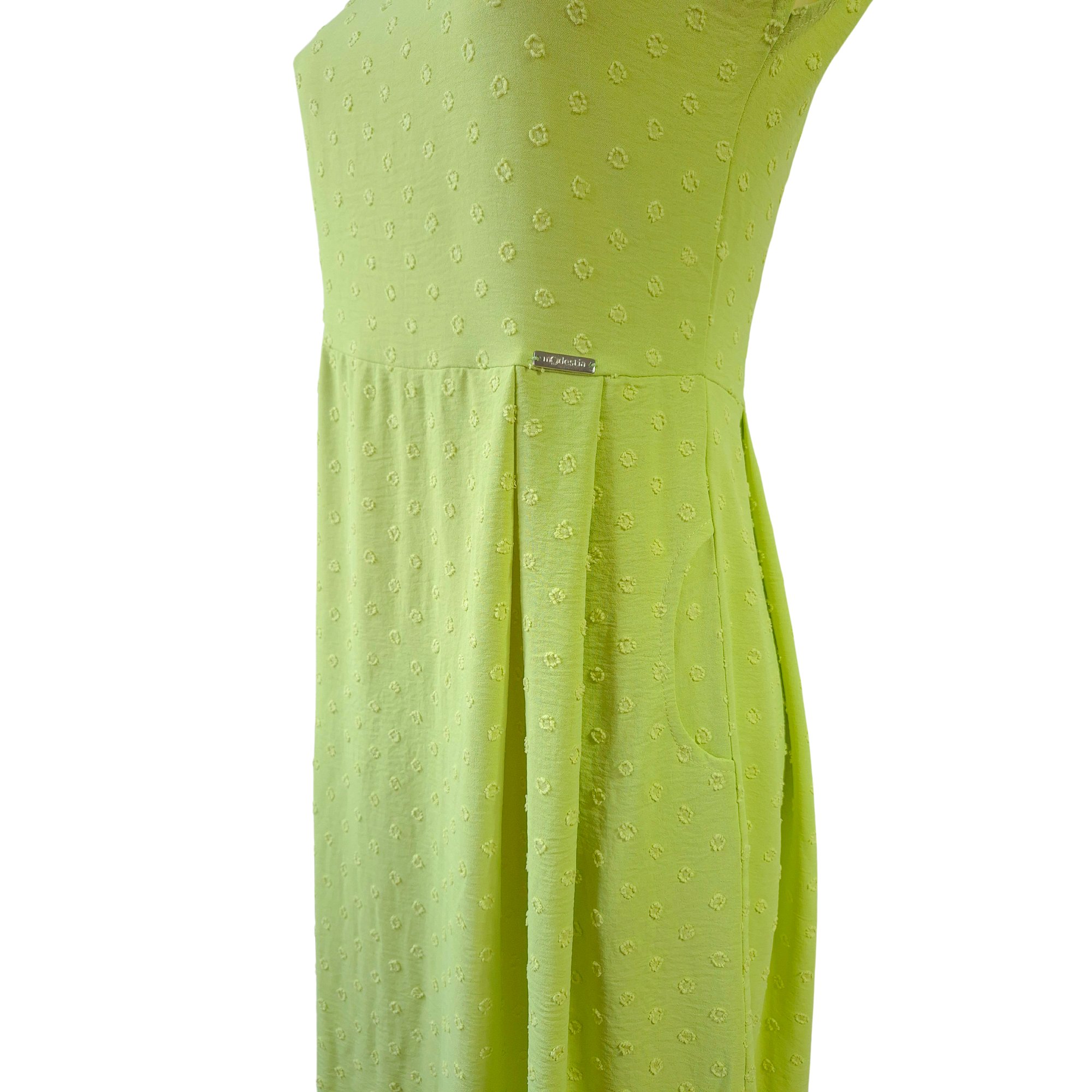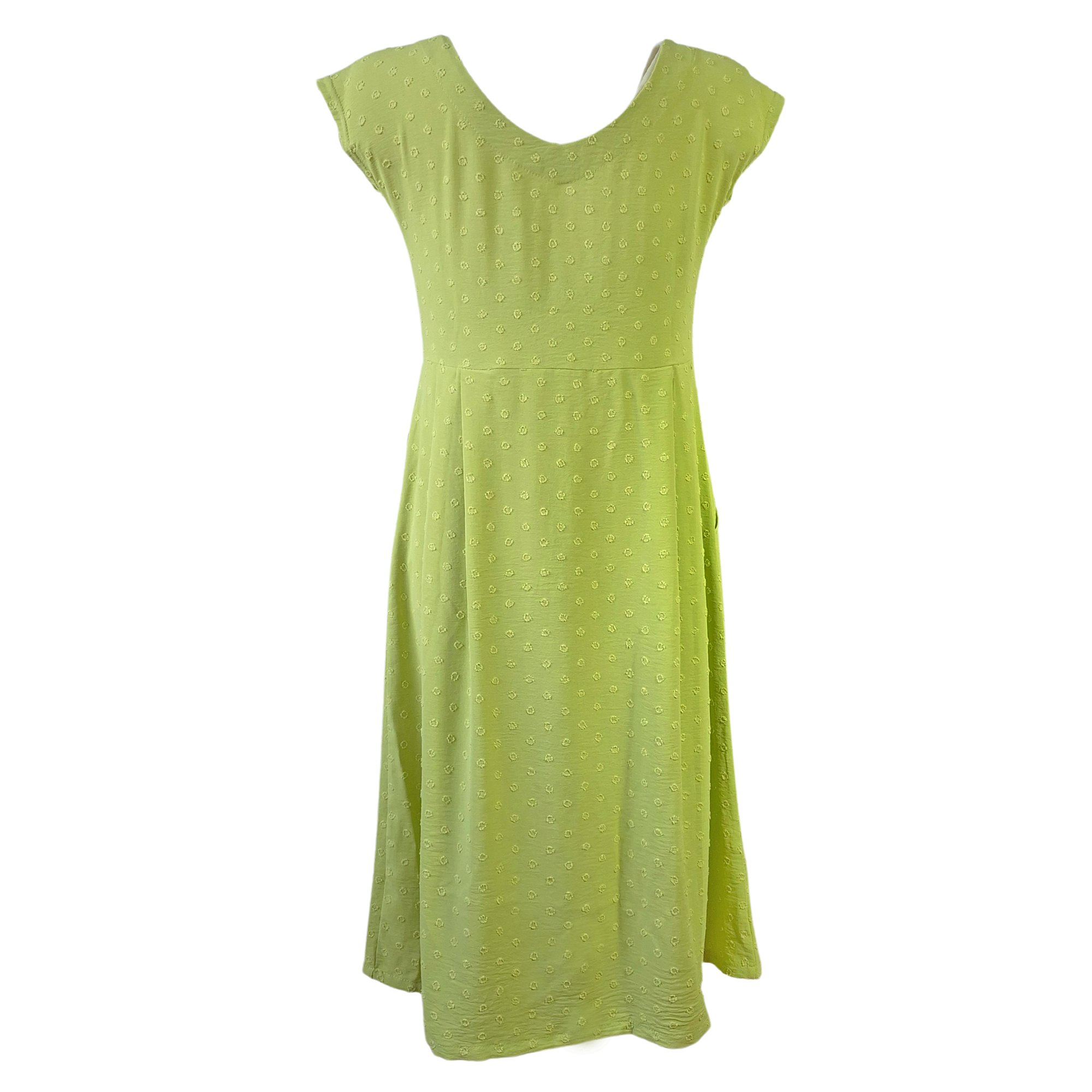 Letní světle zelené lehké šaty s kimonovýmí rukávy s rozparkem, přestřižené pod prsy se skládanou sukní. Decentní struktura drobných puntíků. Délka 110 cm. Pereme v pračce na 30°. Materiál: 95% viskóza,5% elastan.