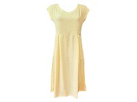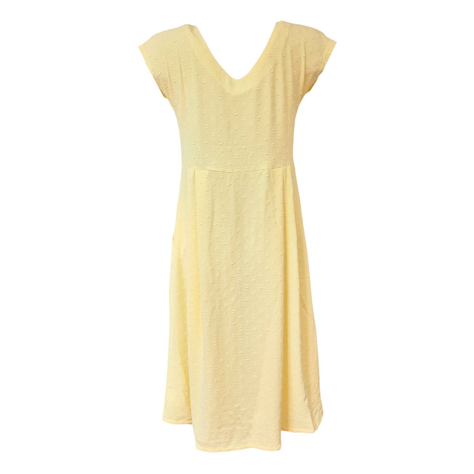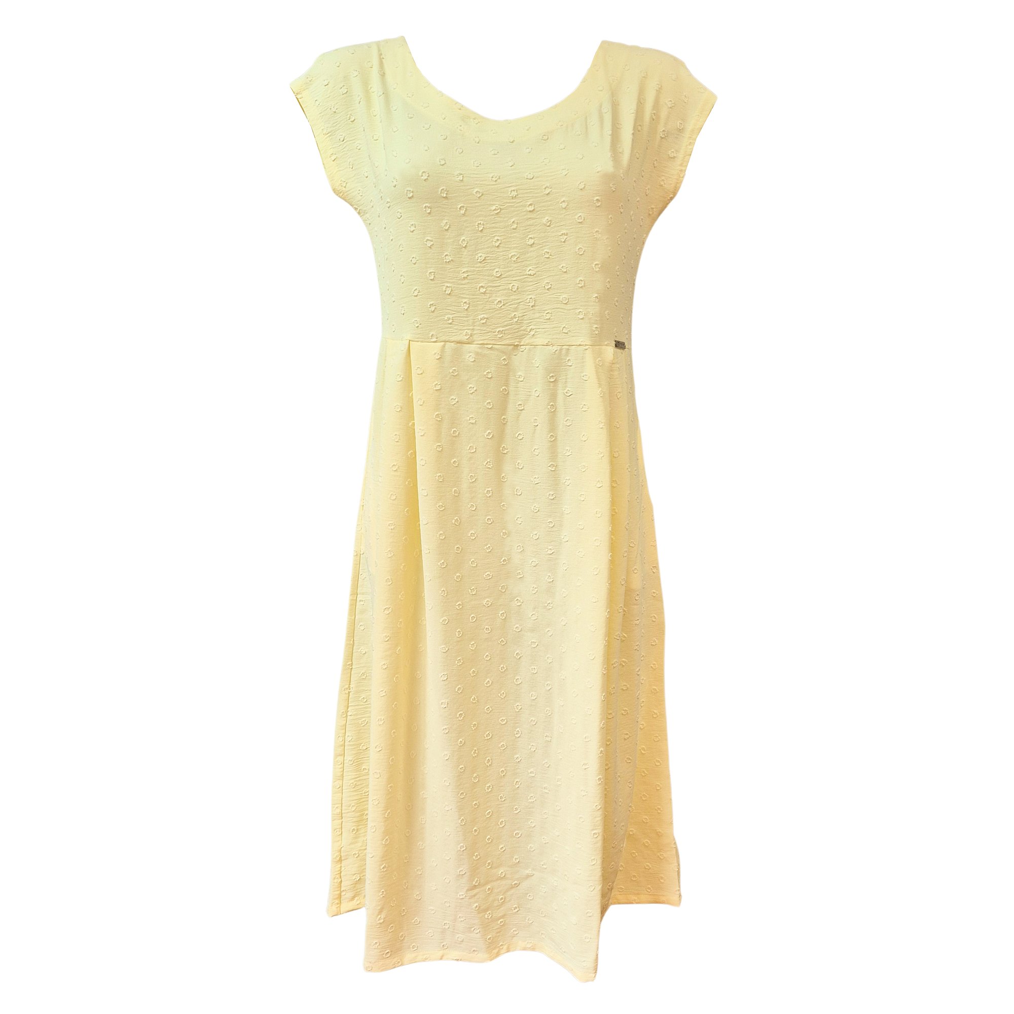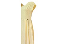 Letní žluté lehké šaty s kimonovýmí rukávy s rozparkem, přestřižené pod prsy se skládanou sukní. Decentní struktura drobných puntíků. Délka 110 cm. Pereme v pračce na 30°. Materiál: 95% viskóza,5% elastan.