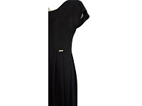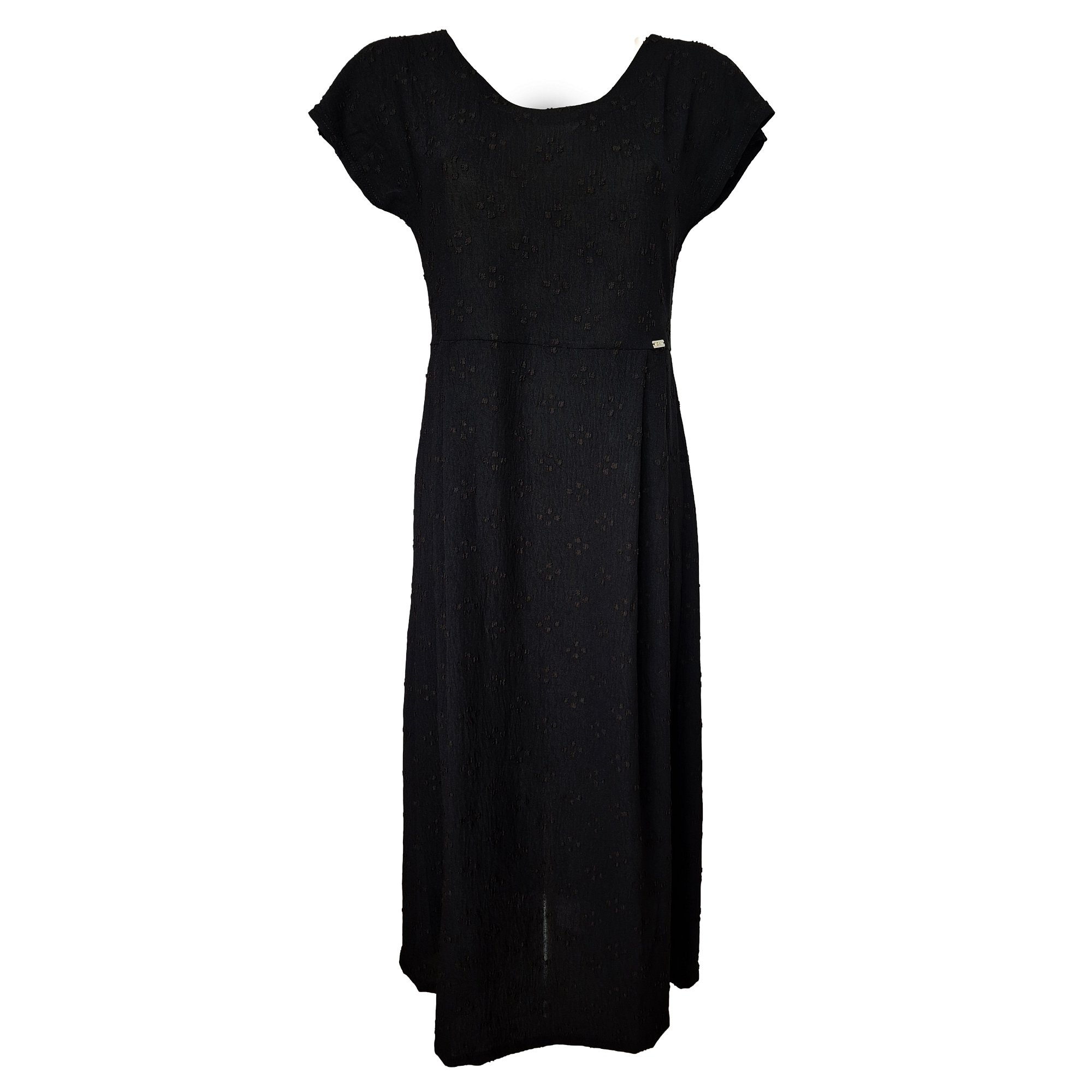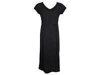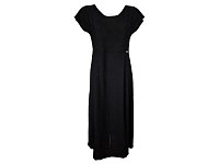 Letní černé s kimonovýmí rukávy s rozparkem, přestřižené pod prsy se skládanou sukní. Decetní struktura materiálu s drobným plastickým vzorem. Délka 125 cm. Pereme v pračce na 30°. Materiál 95% viskóza 5%elastan.