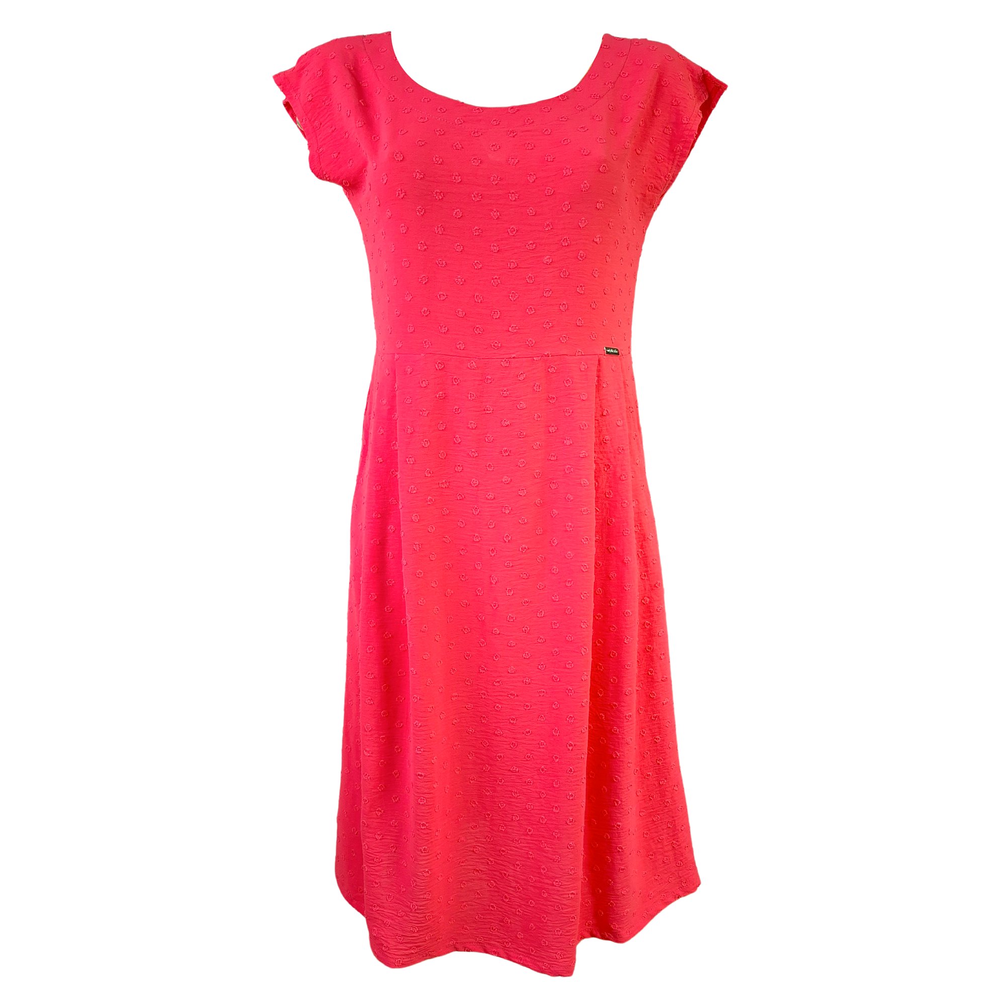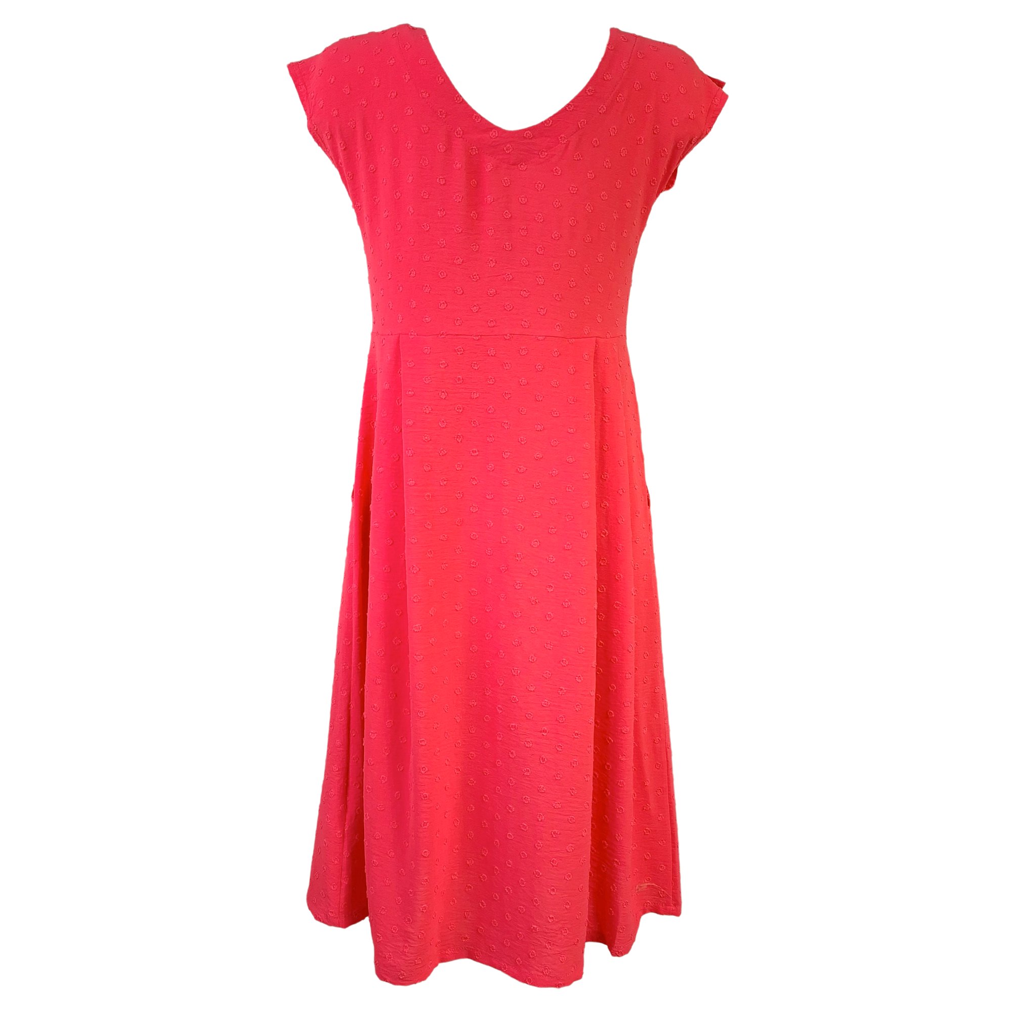 Letní červené lehké šaty s kimonovýmí rukávy s rozparkem, přestřižené pod prsy se skládanou sukní.Decentní textura drobných puntíků. Délka 110 cm. Pereme v pračce na 30°. Materiál: 95% viskóza, 5% elastan.