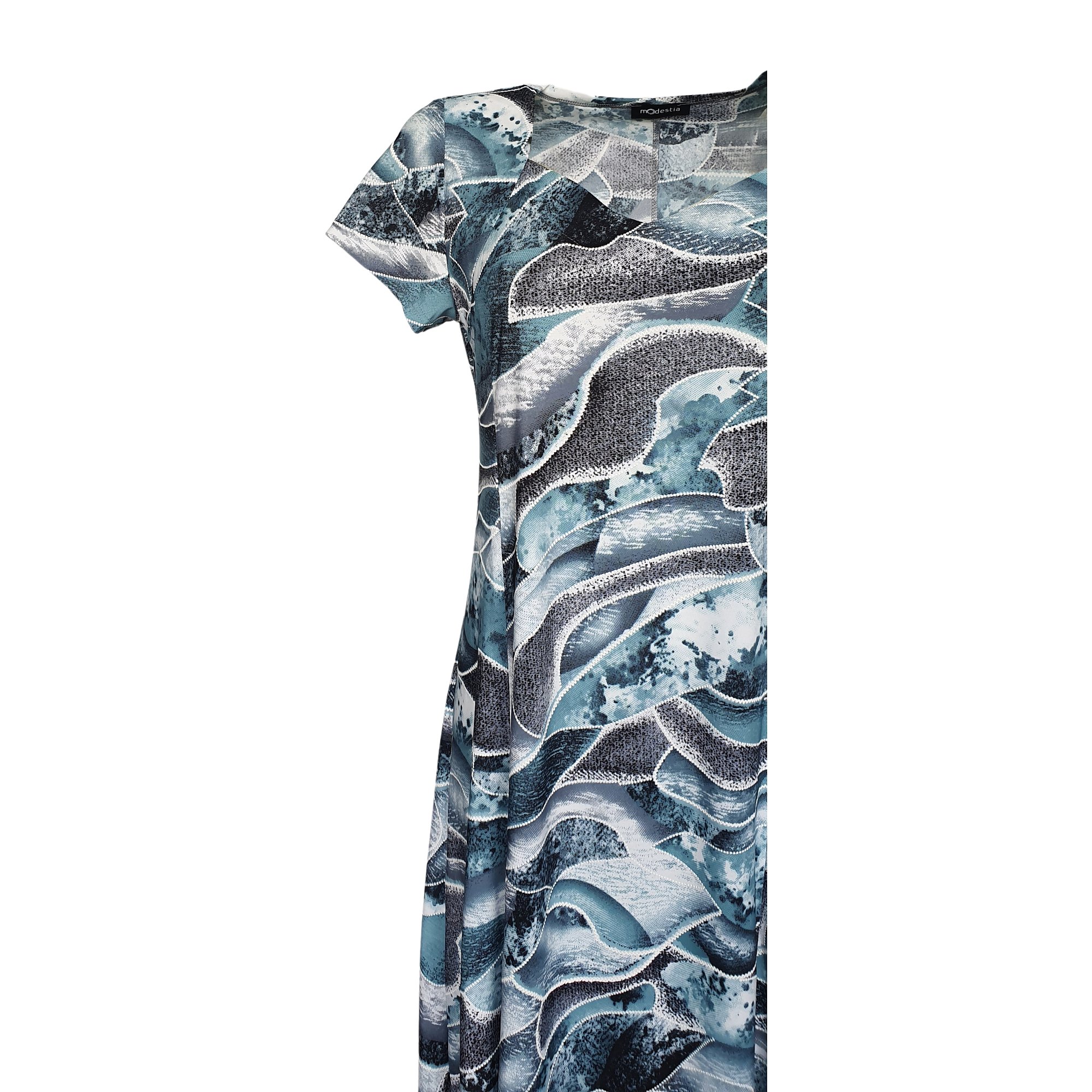 Elegantní šaty v princesovém střihu s rozšířenou sukní s krásným otevřeným výstřihem v petrolejové barvě. Délka 105 cm. Pereme v pračce na 30°. 95% polyester 5% elastan